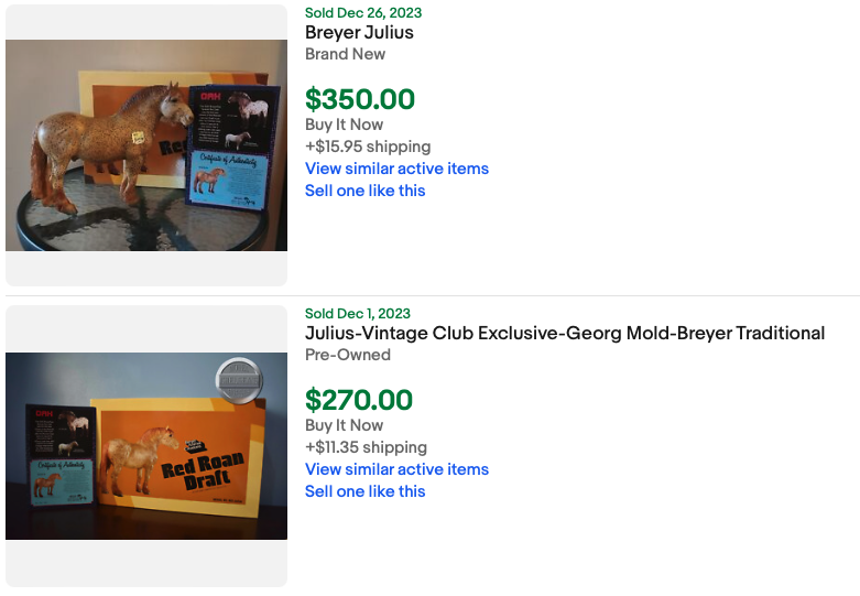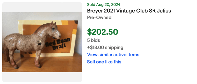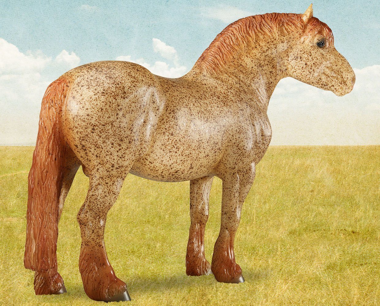 Matte vintage red roan speckling; darker shaded mane, tail and leg feathers; gold foil Tenite sticker; Vintage Club SR; 1/350