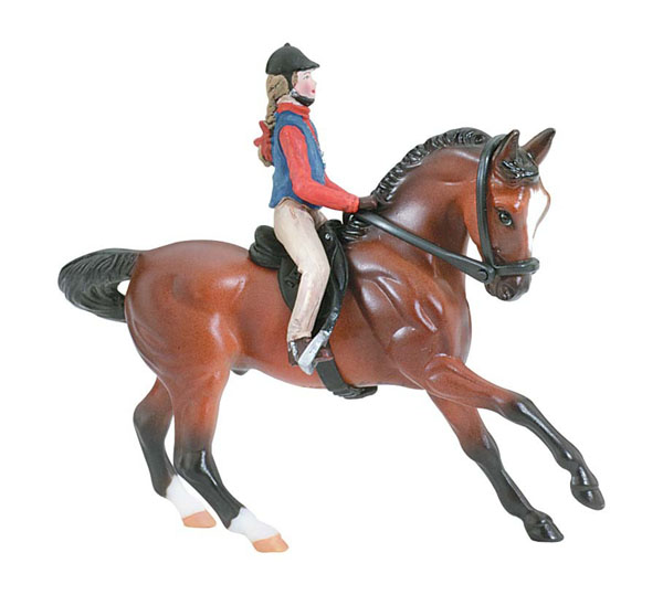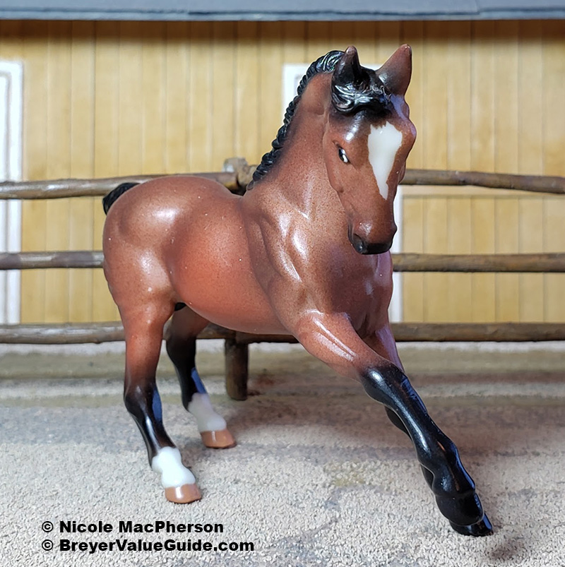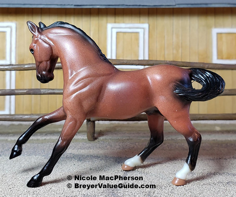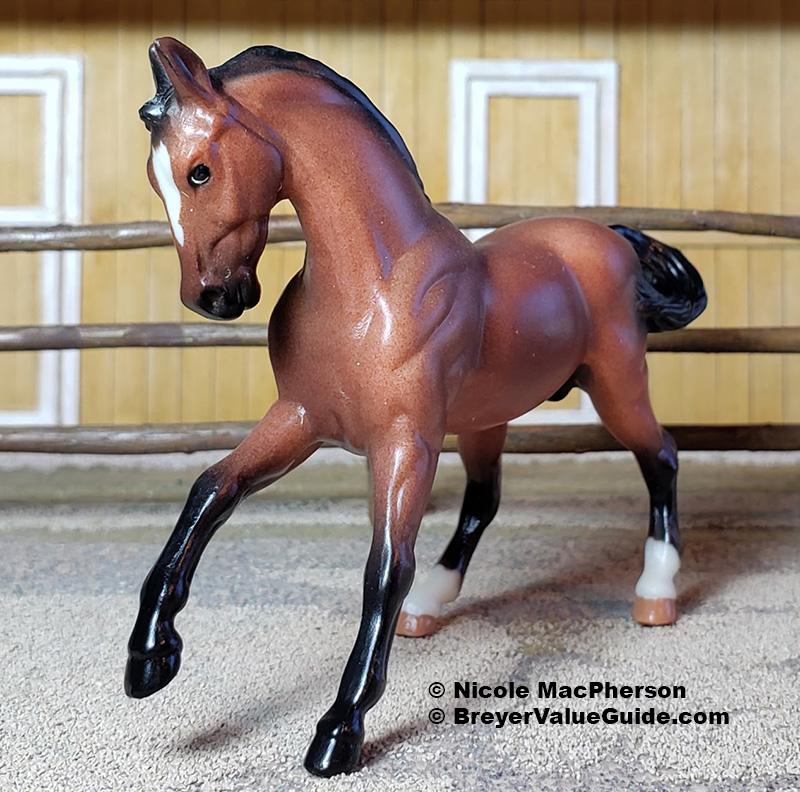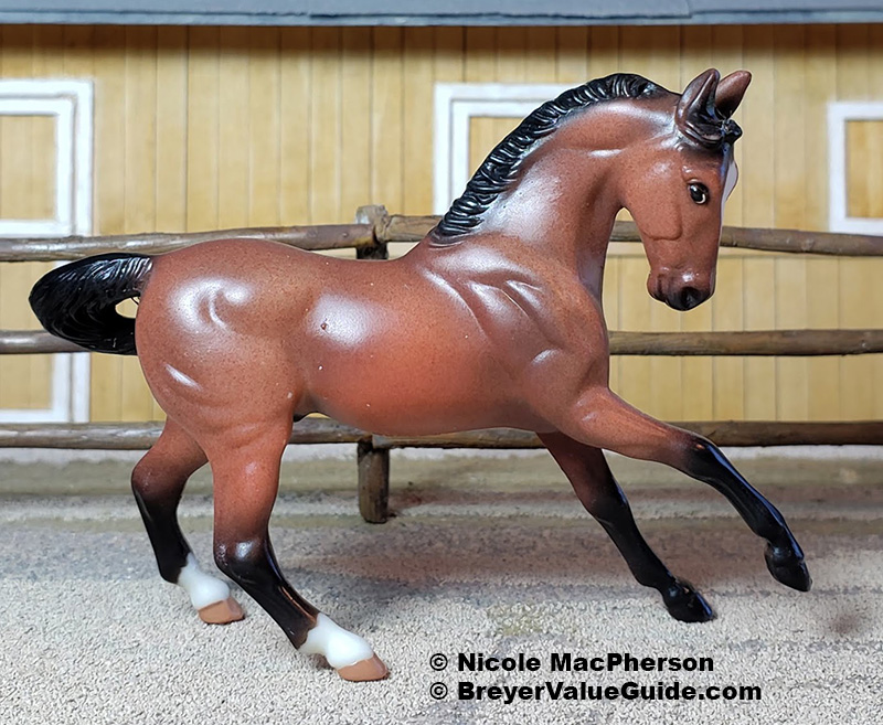 Matte red bay with roaning; large star; 2 hind socks; with tack and rider