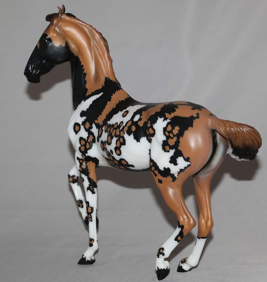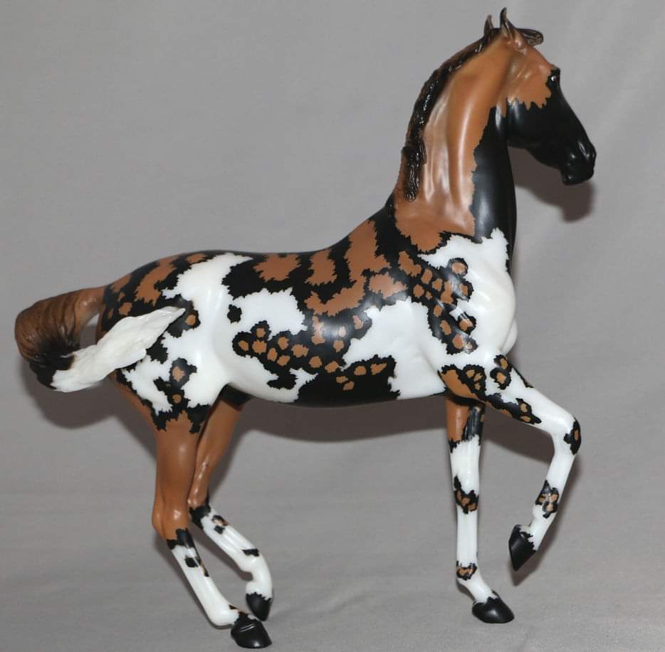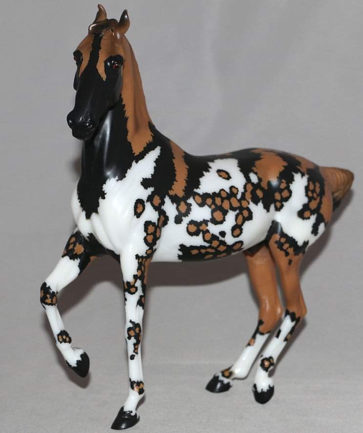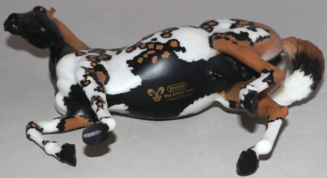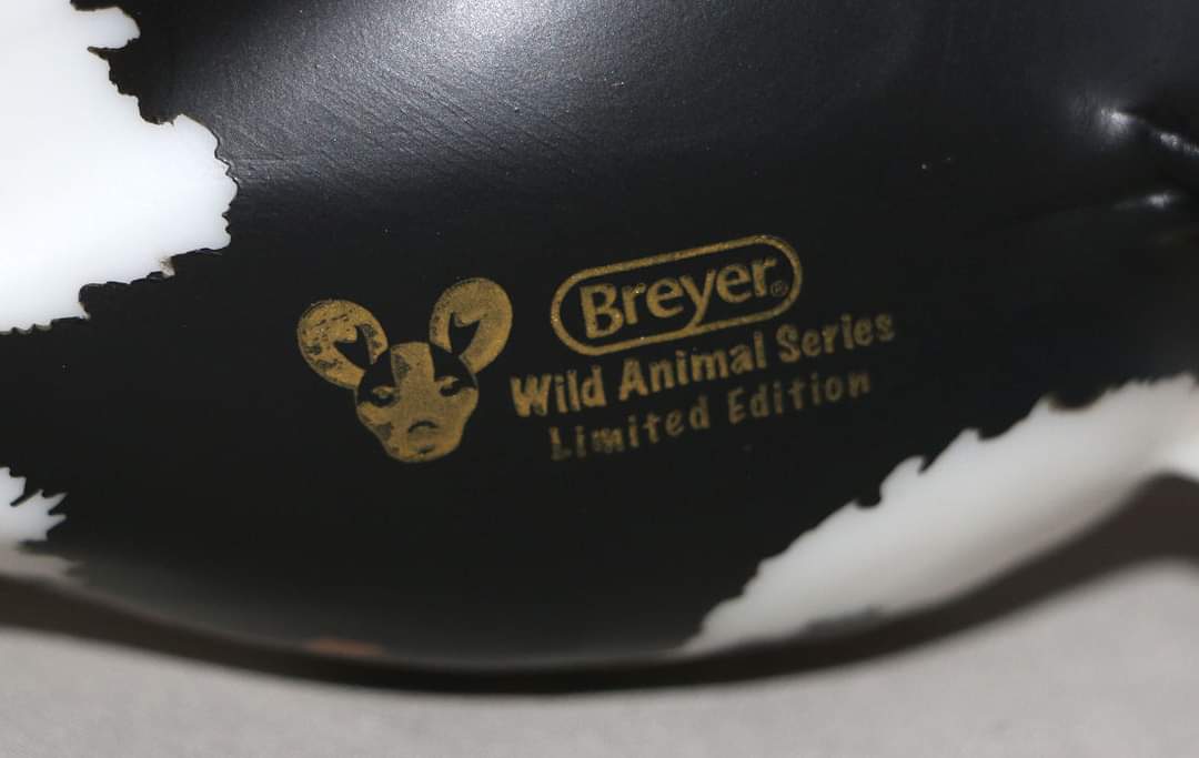 Matte brown and white, mottled spotting along his body and legs, with a cape of lighter coloring draping his head and neck. Designed to resemble an African Wild Dog. Wild Animal Series SR, 1/750