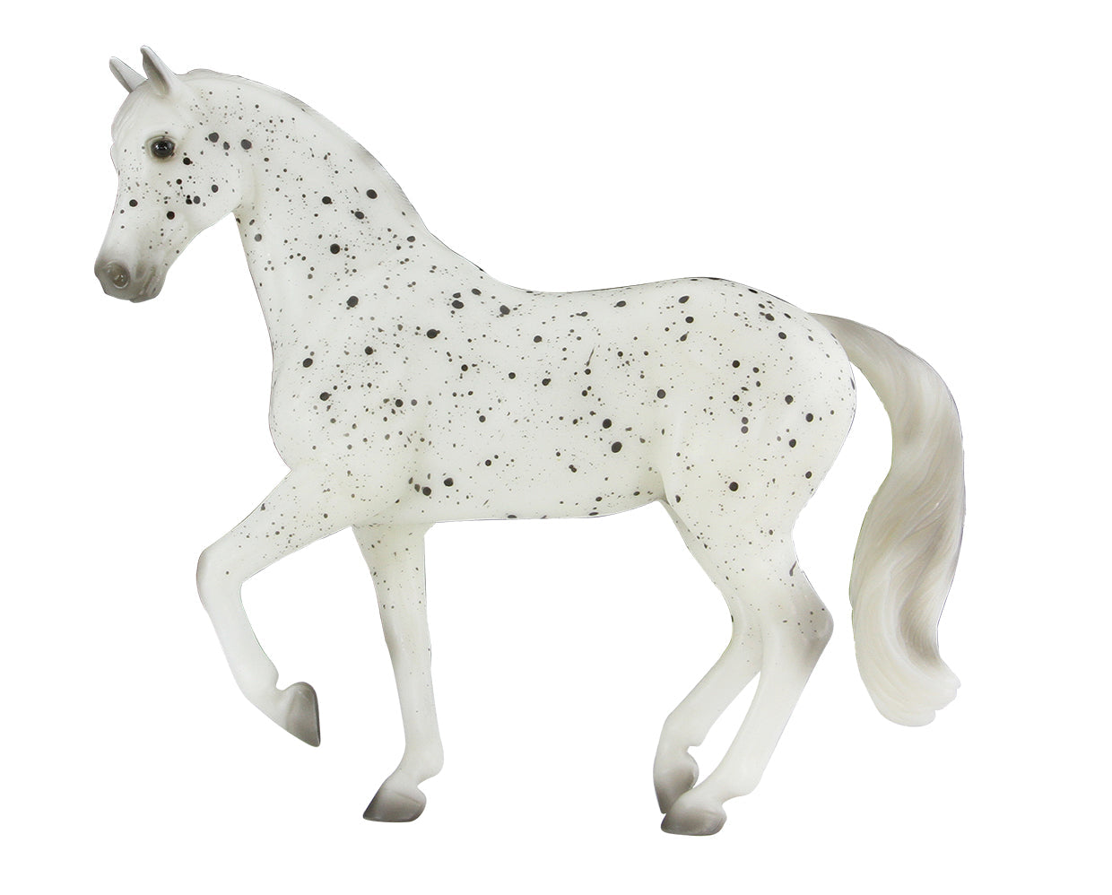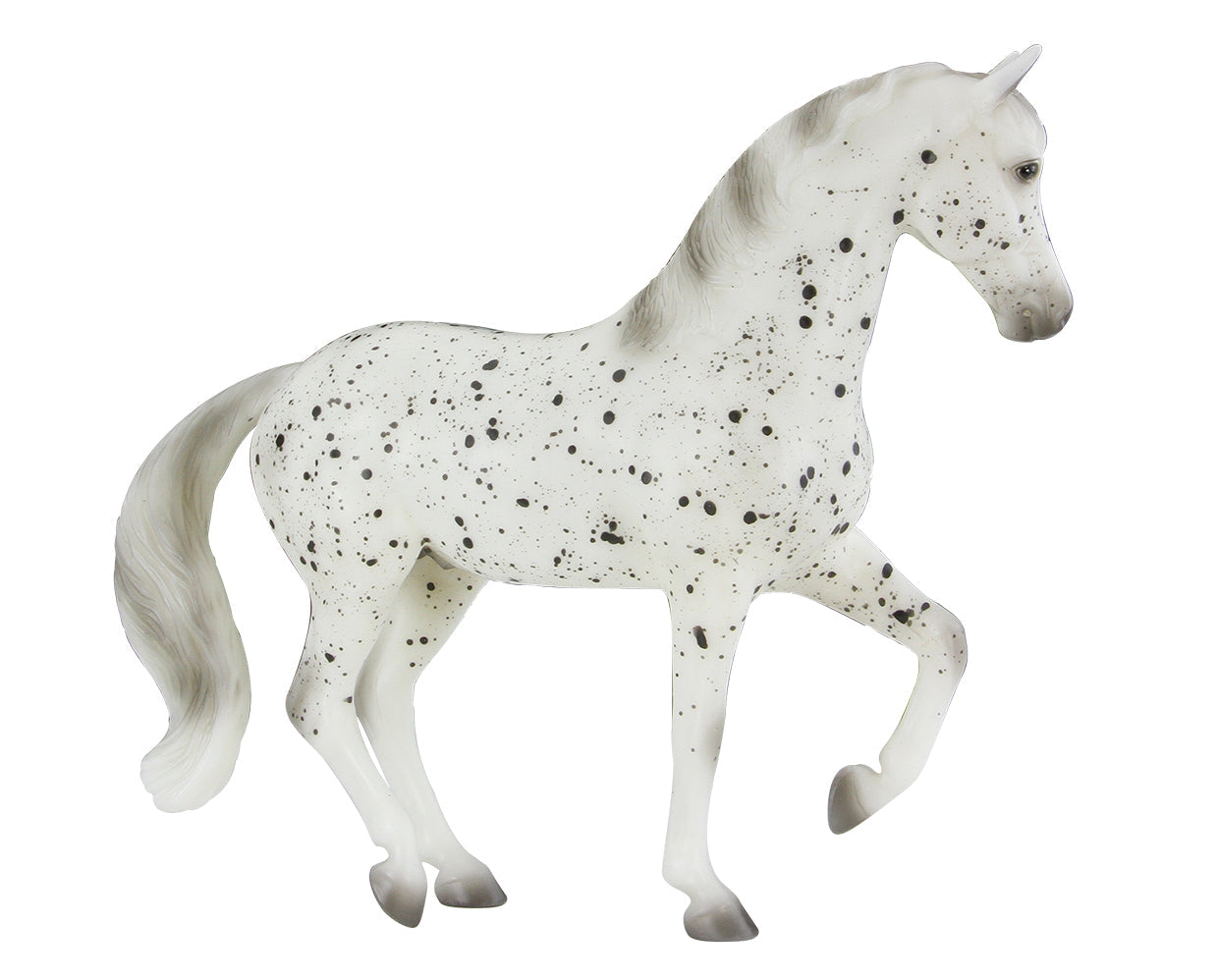 Matte black leopard appaloosa, white with black splash spots, grey shaded mane, tail and hooves, with blanket and drawstring bag