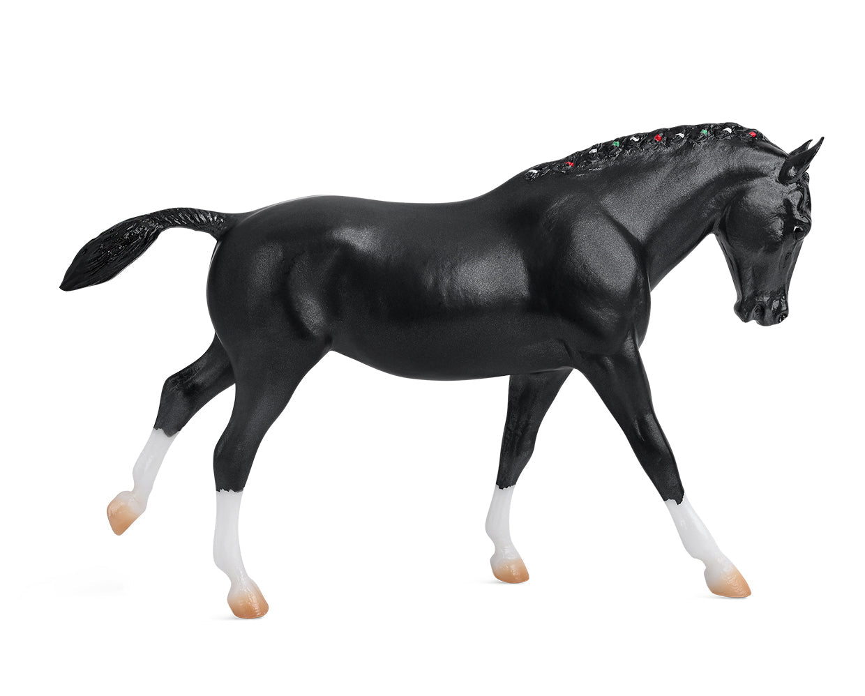 Pearly black, blaze, 4 socks, red, green and white braids, with blanket, Holiday Collection Limited Edition