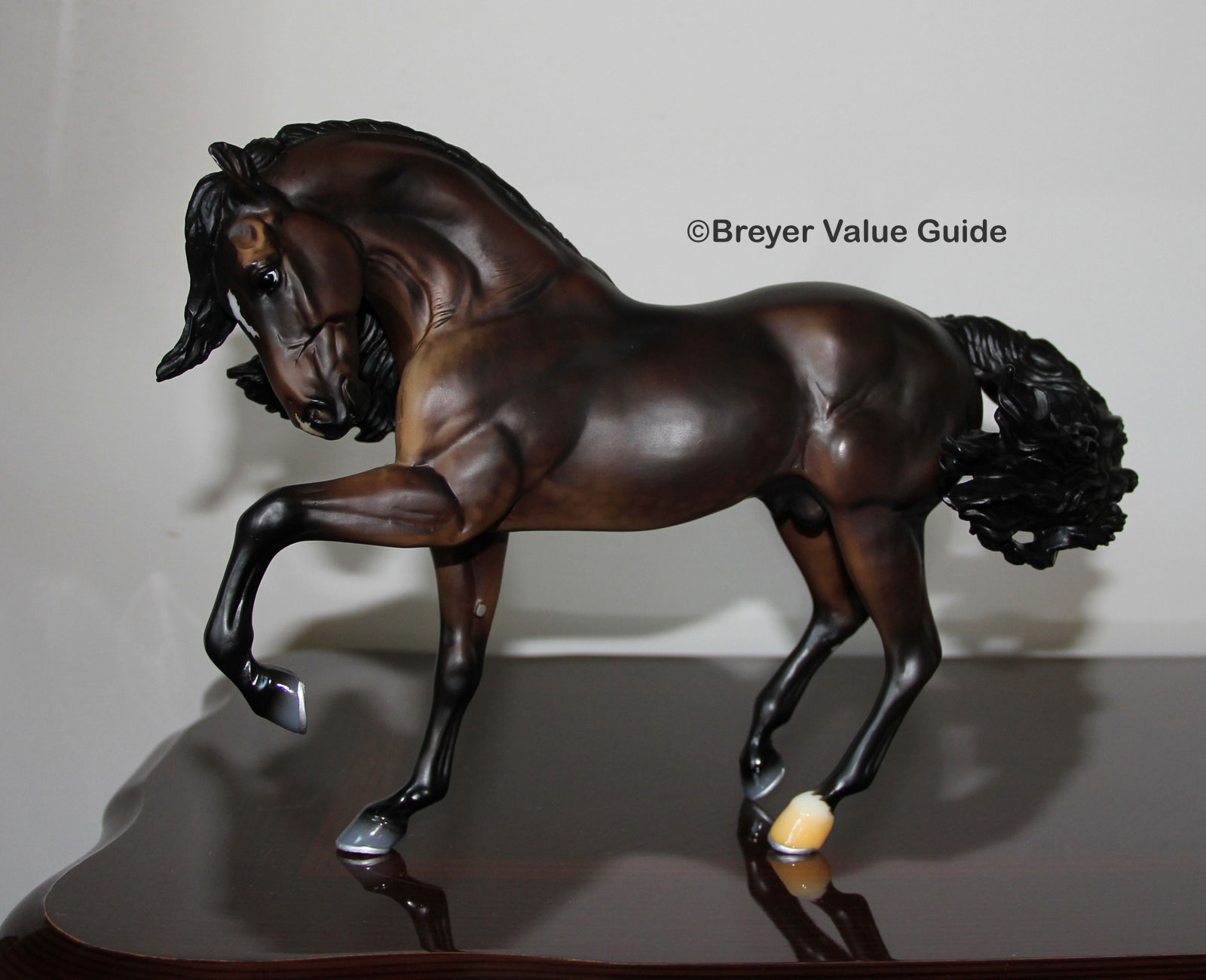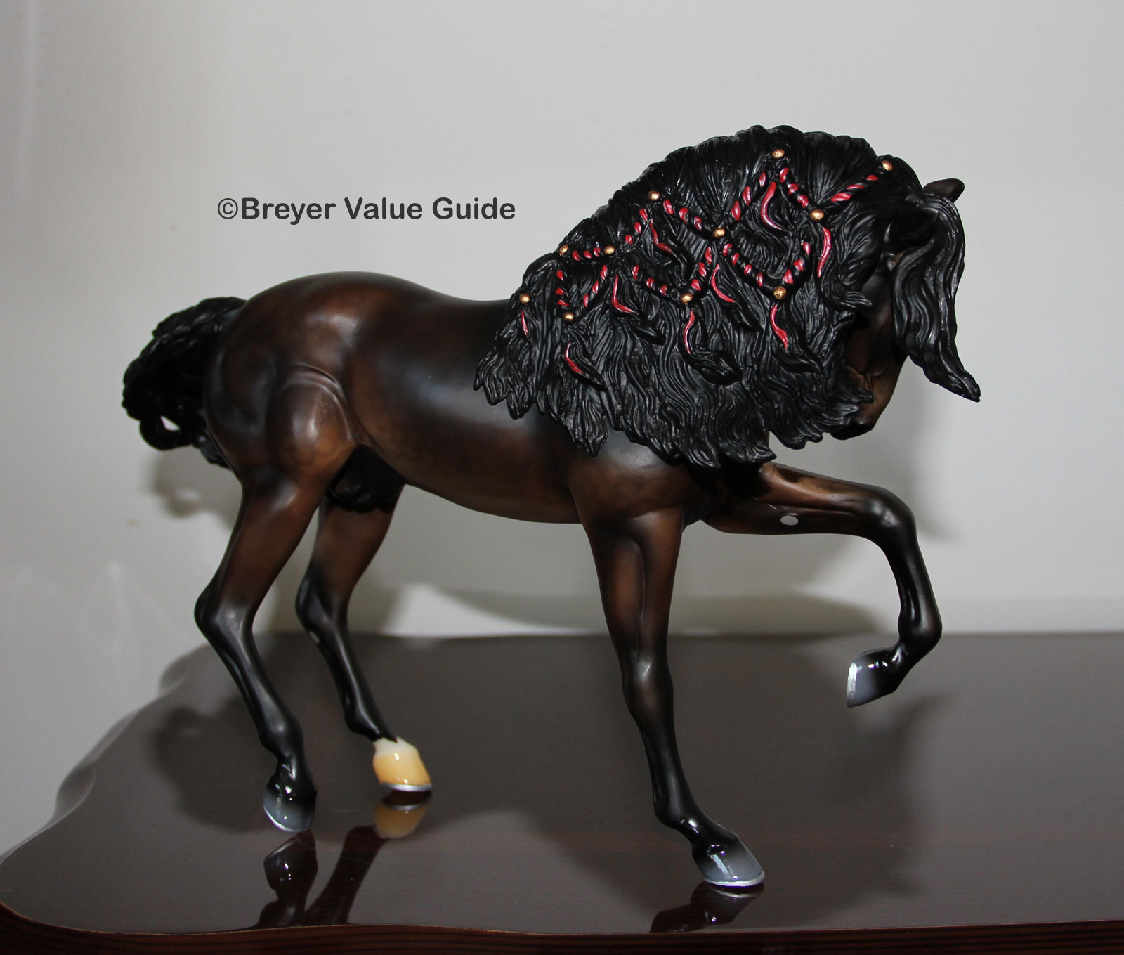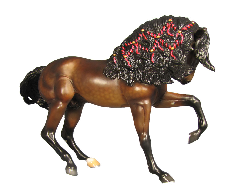 Matte bay, dapples, star, 1 short hind sock, red ribbons in mane; BreyerFest SR; 1/1500 Issue price: $65