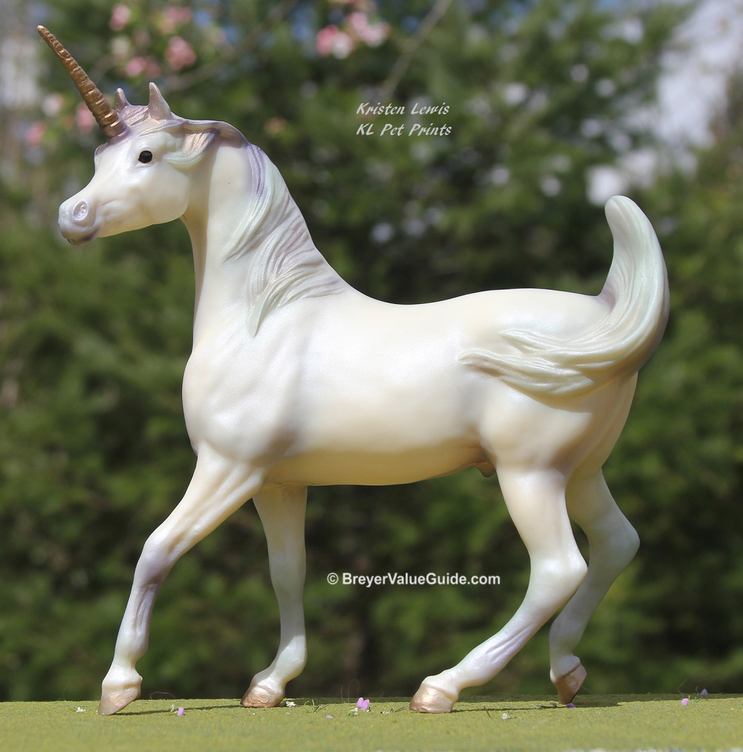 Matte iridescent white with blue and purple shading; gold horn; gold hooves; JCPenney SR