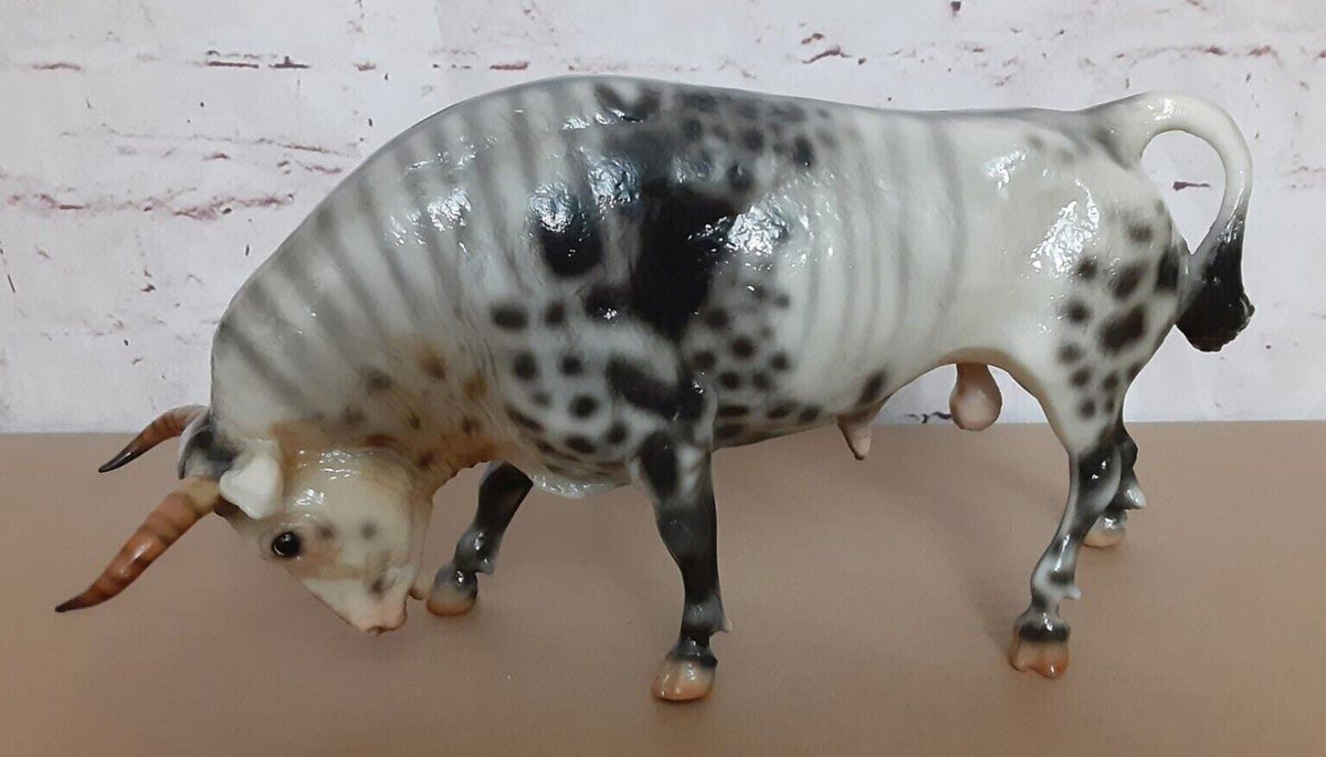 Glossy brindle with grey shading, spots and stripes and amber colored horns with additional stripes. BreyerFest SR, “BreyerFest 2015” stamped on the belly, 1/800