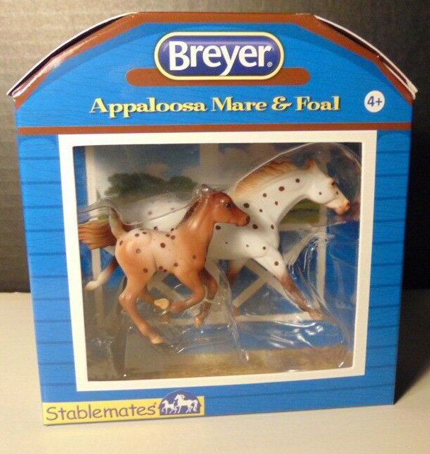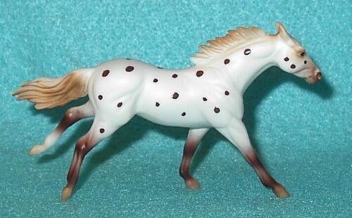 Matte chestnut leopard appaloosa; tan shaded mane and tail; brown legs; 1 hind sock – with Cantering Foal