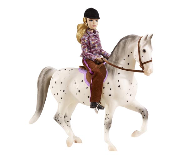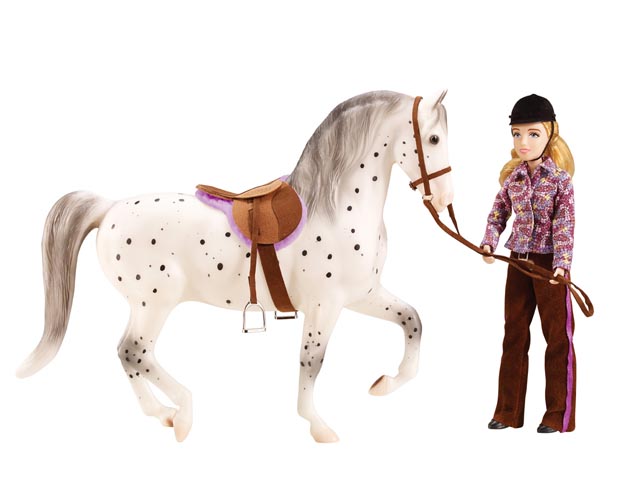 Matte black leopard appaloosa; grey shading; black spots – with English saddle set and rider doll