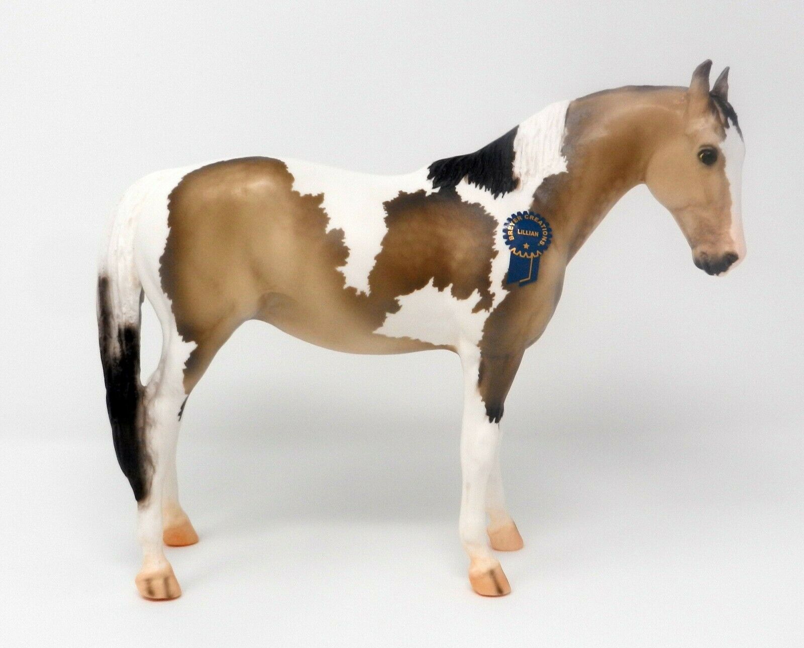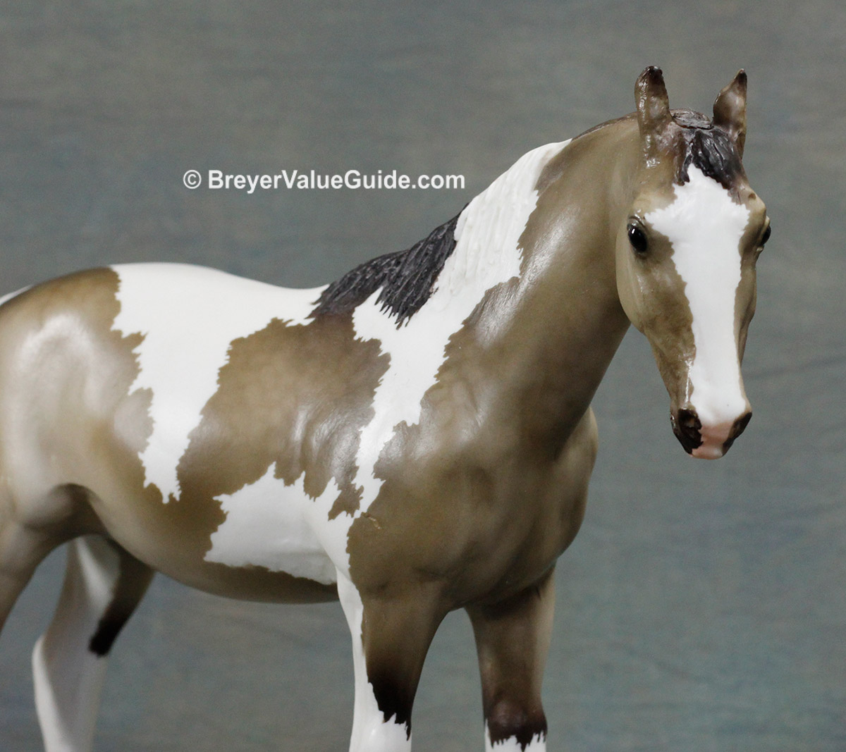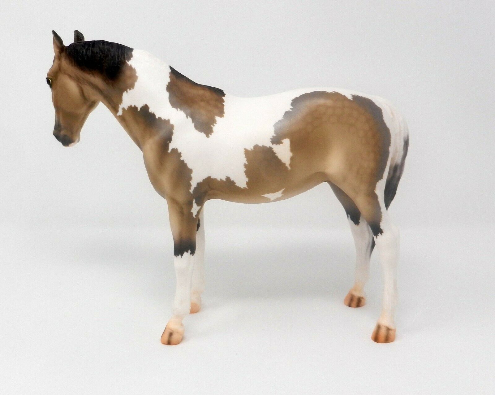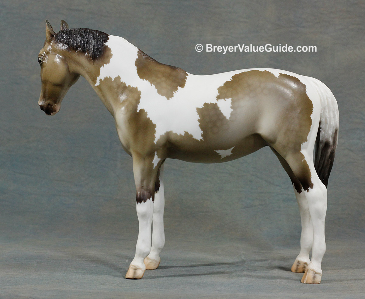 Thoroughbred Mare: Matte buckskin pinto, dapples, wide blaze, striped hooves, blue ribbon sticker, belly stamp
