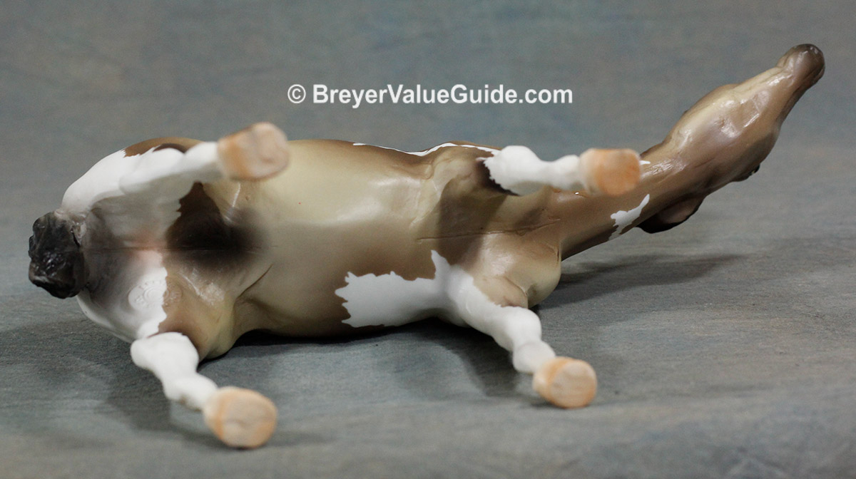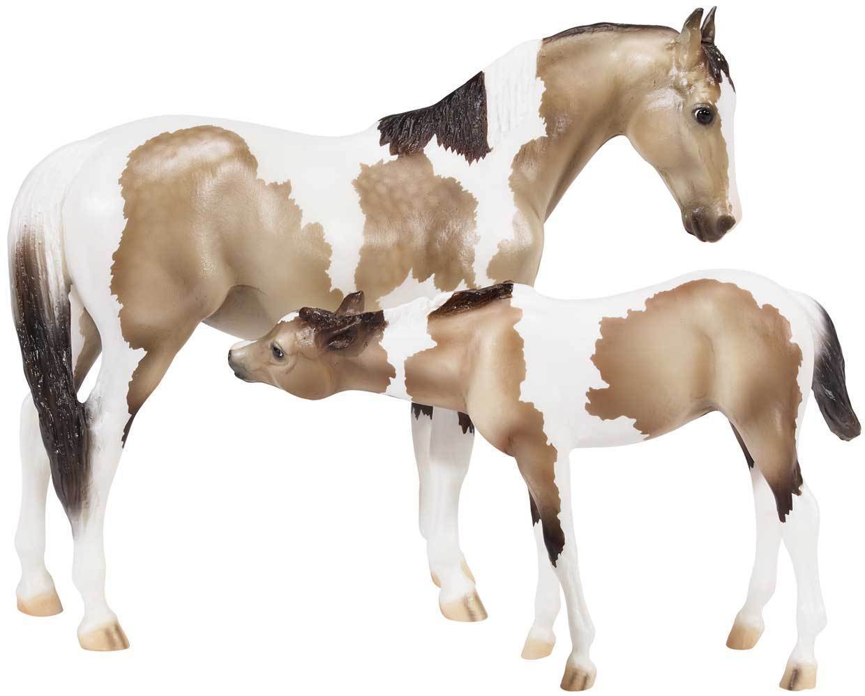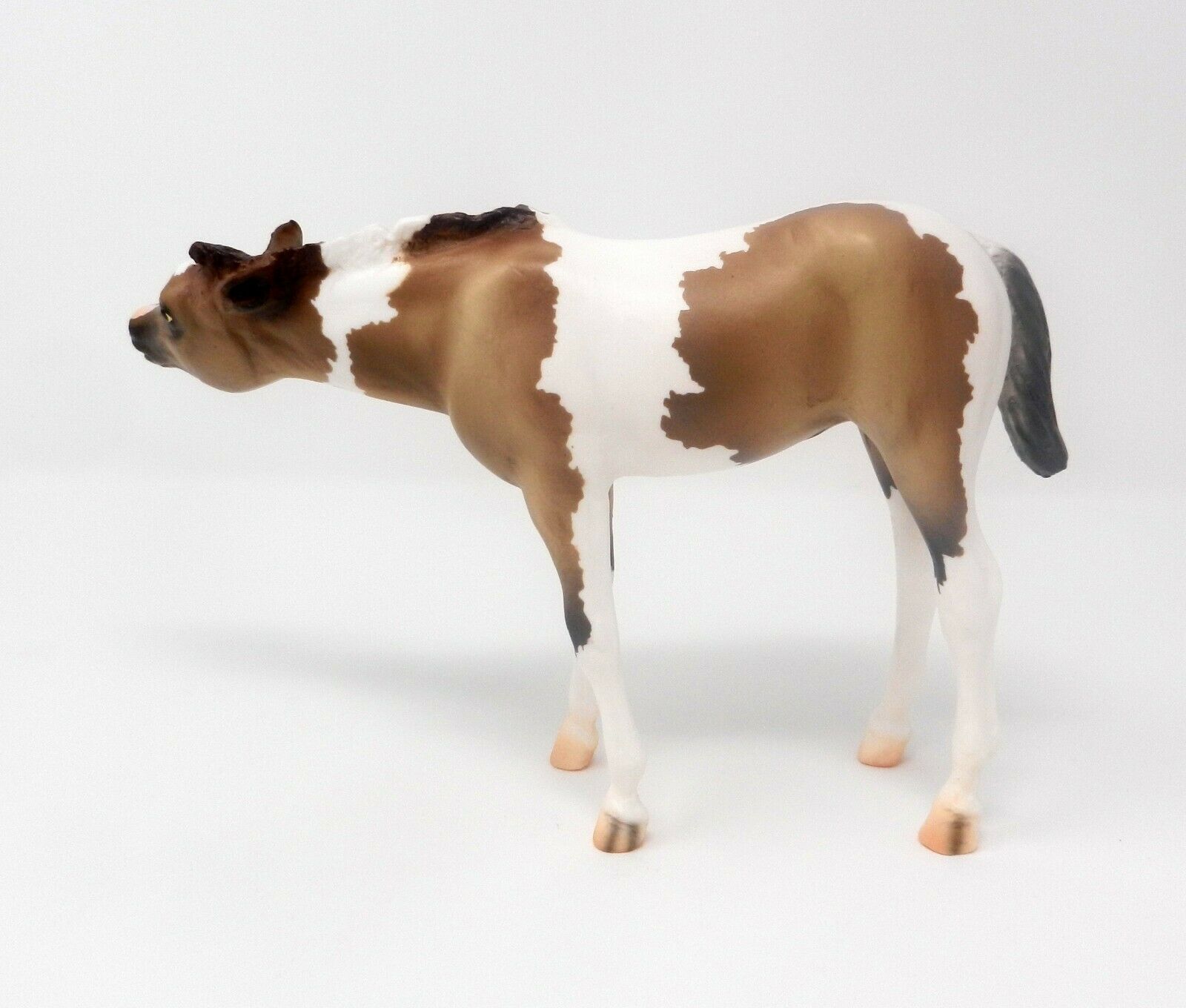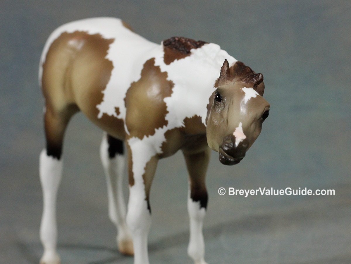 Thoroughbred Mare: Matte buckskin pinto, dapples, wide blaze, striped hooves, blue ribbon sticker, belly stamp