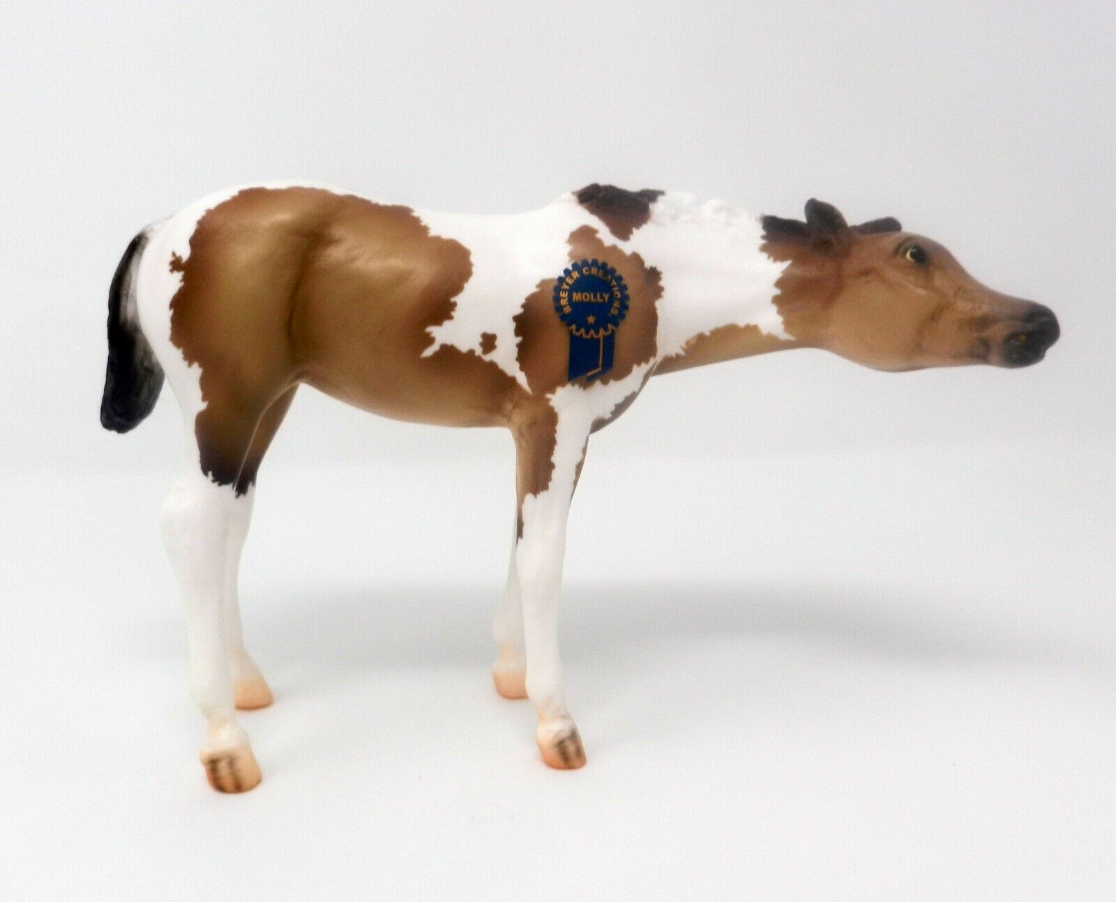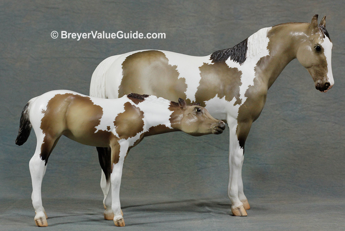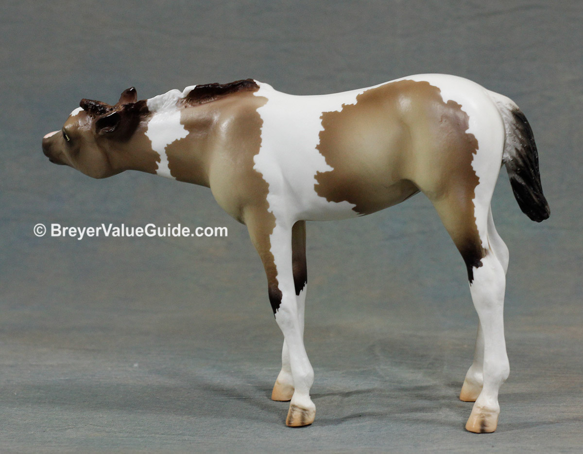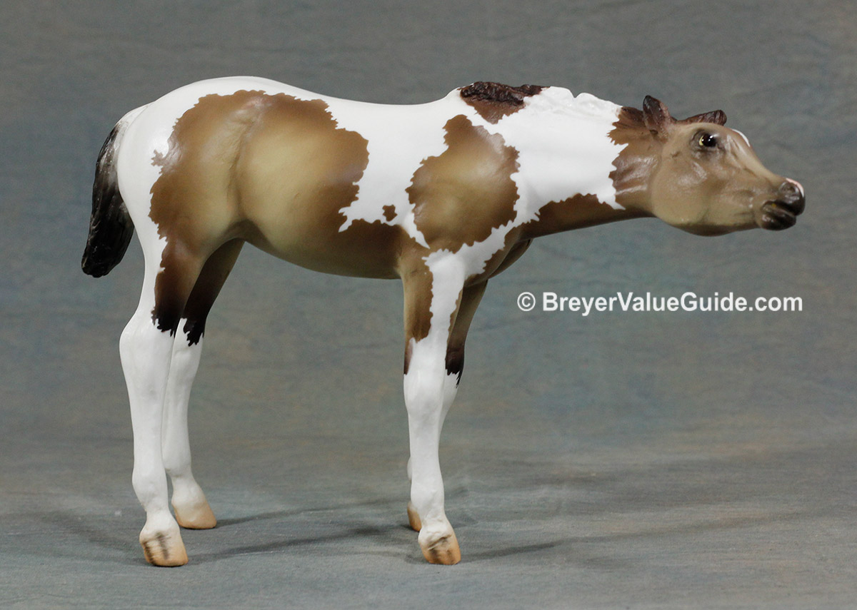 Suckling Foal: Matte buckskin pinto, star and snip, striped hooves, blue ribbon sticker