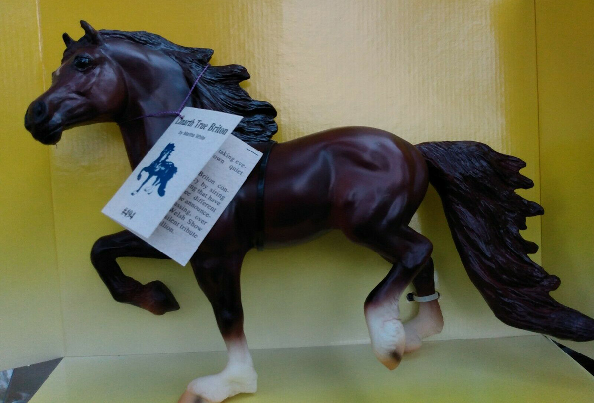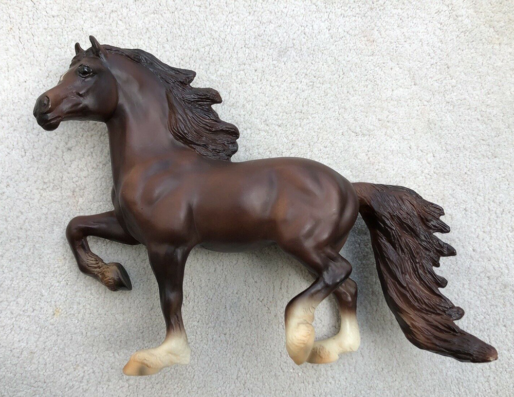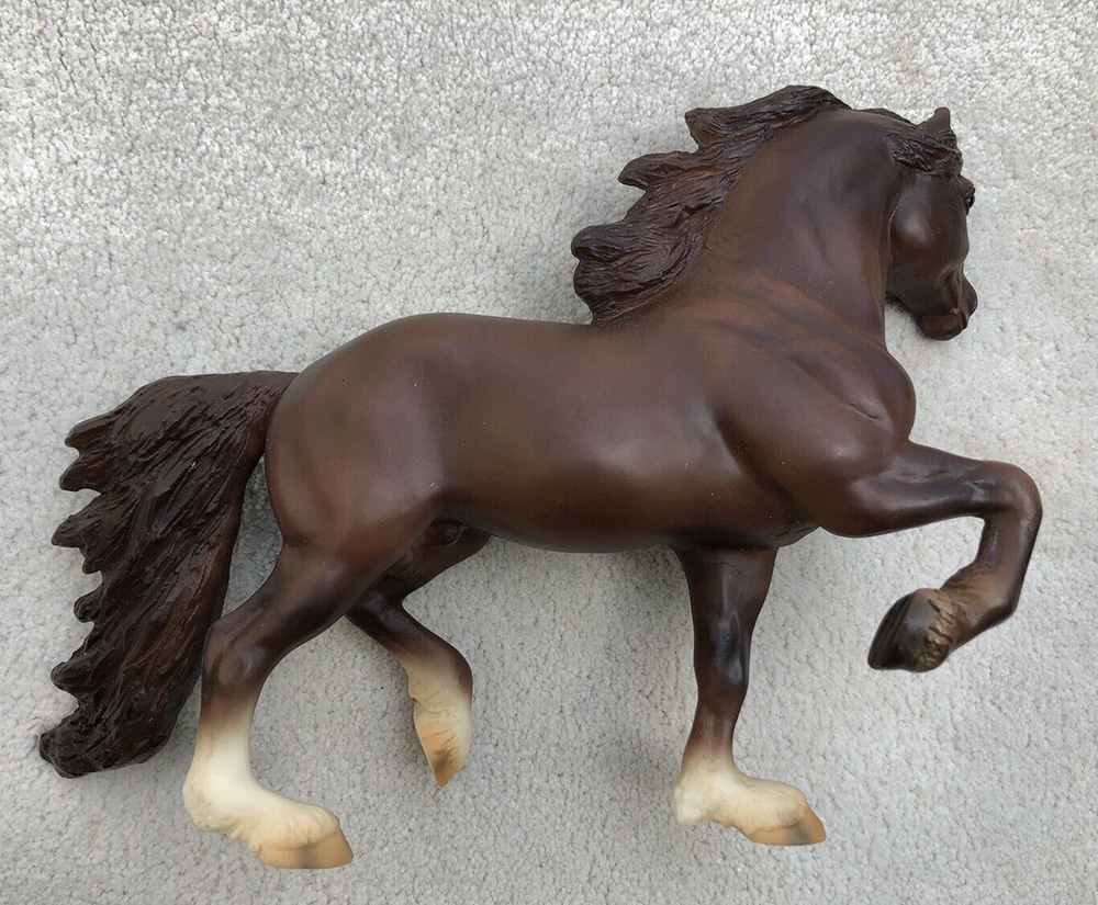 Matte dark bay; “C” shaped star; 3 socks; striped hooves
