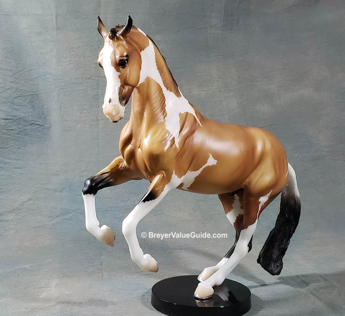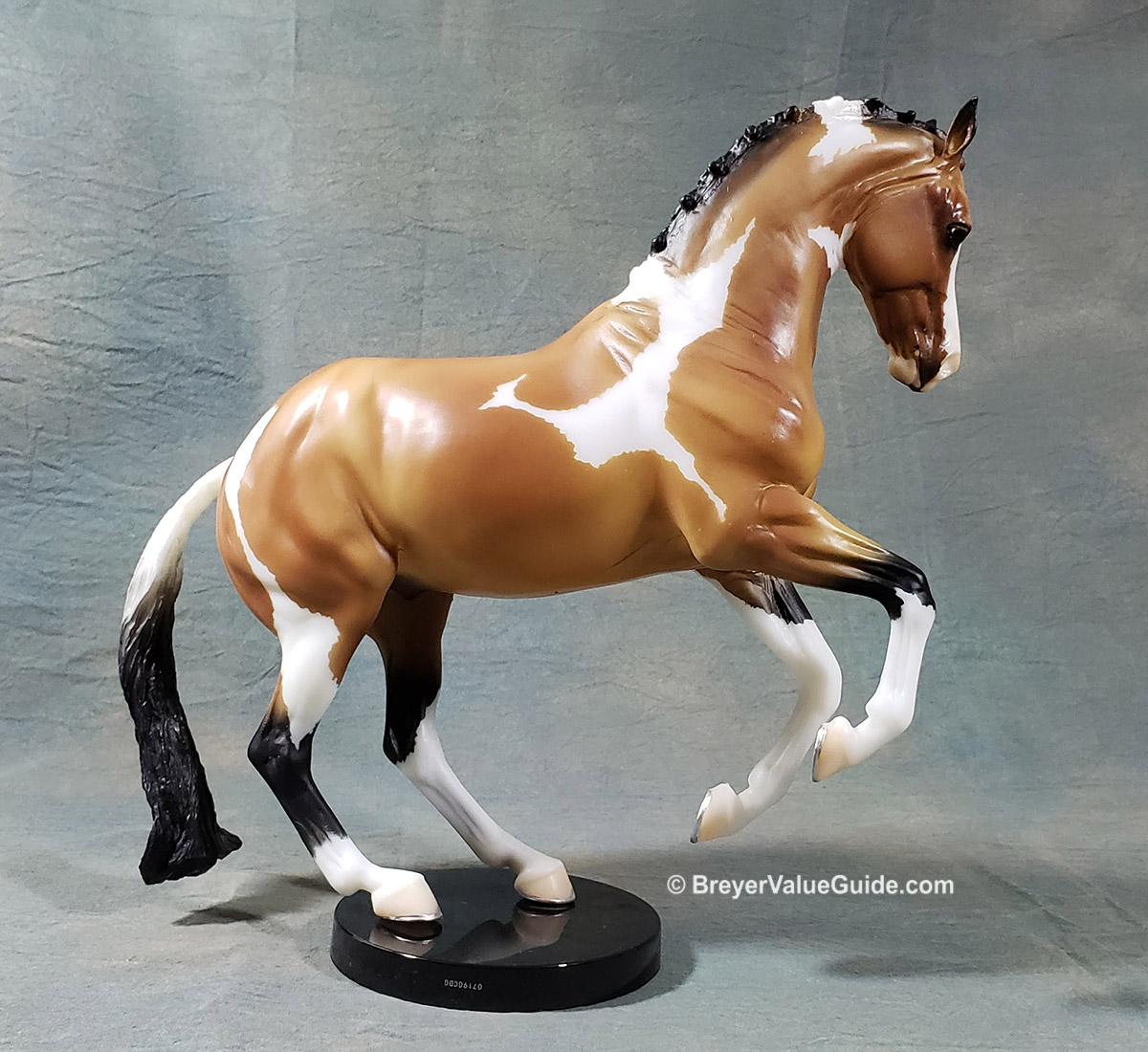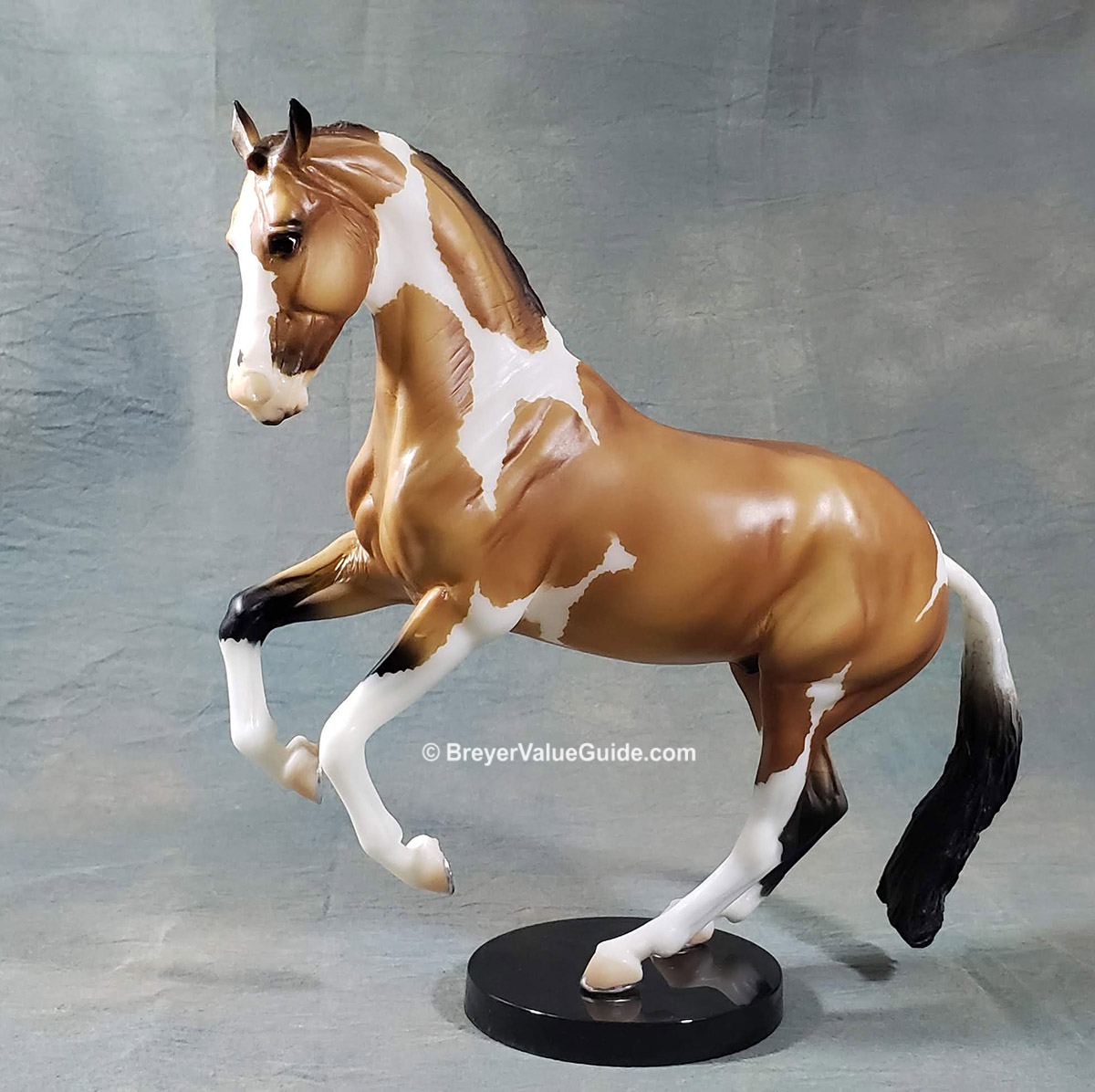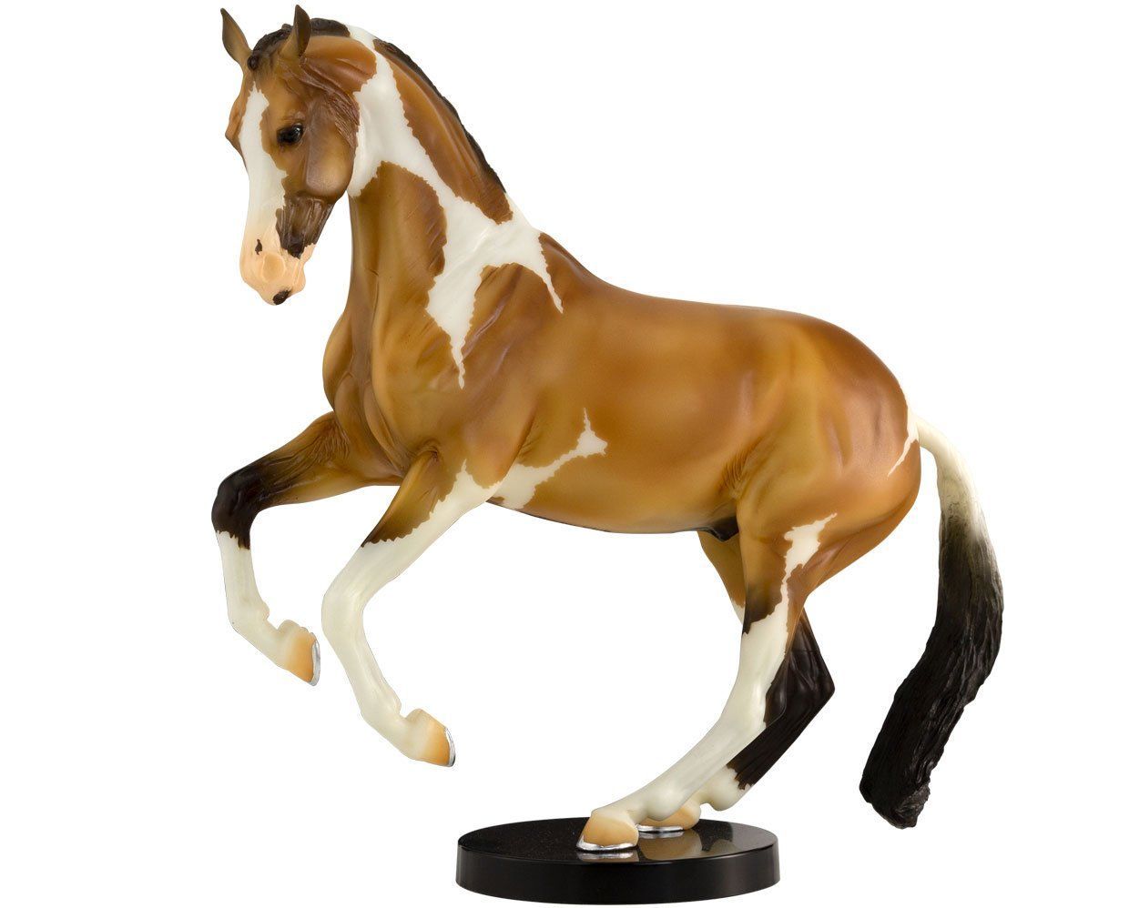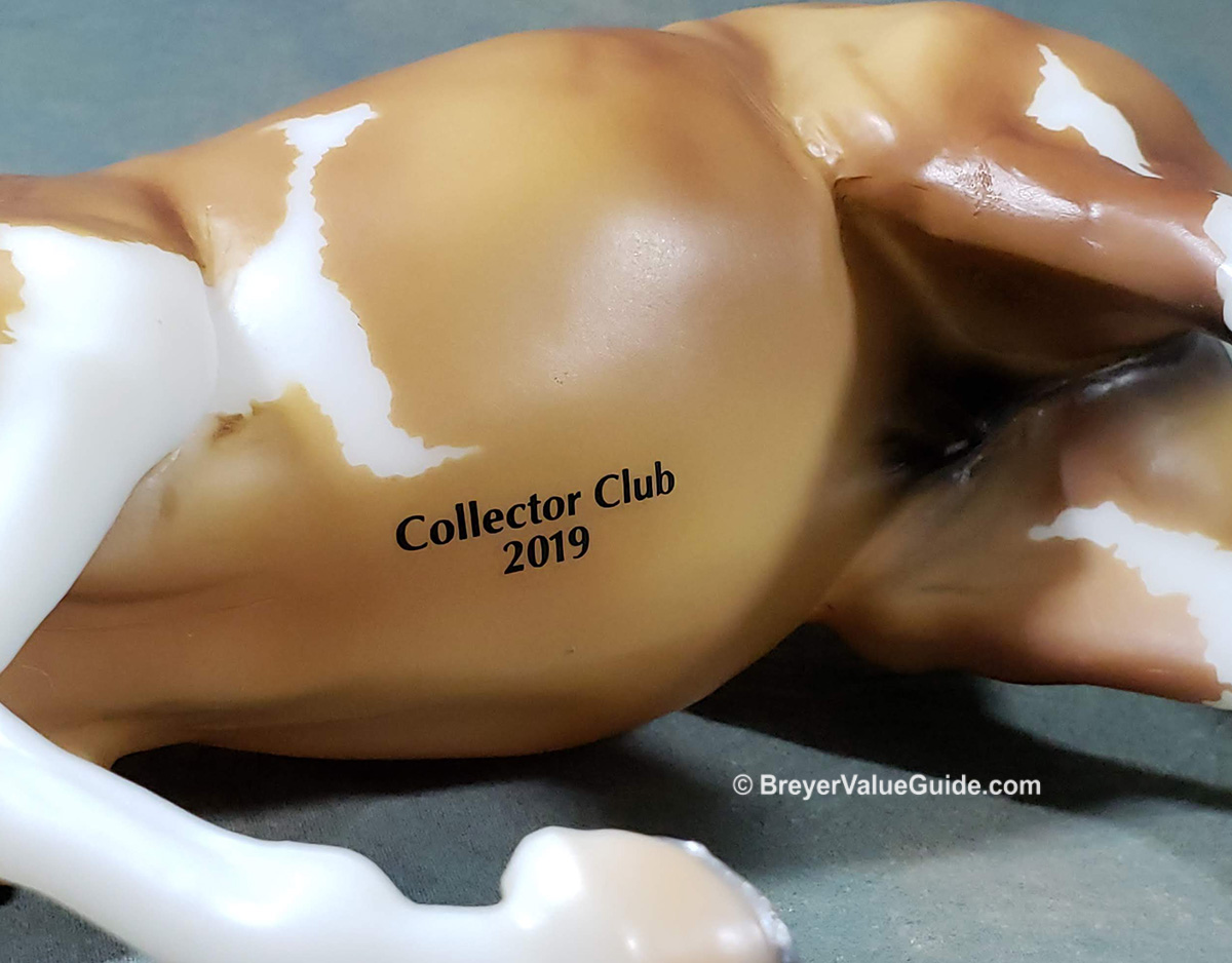 Matte buckskin pinto, wide blaze over muzzle, 4 stockings, painted on shoes, “Collector Club 2019” stamp on belly, black base, Collector Club SR