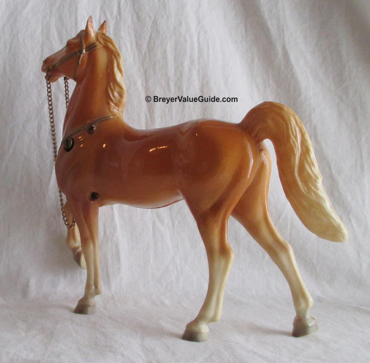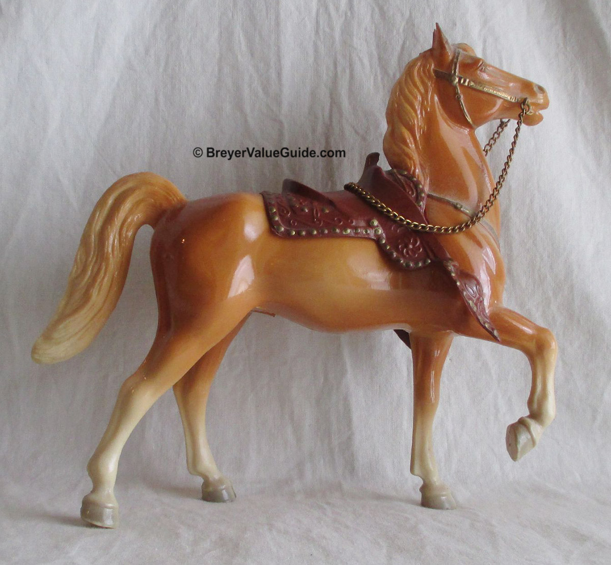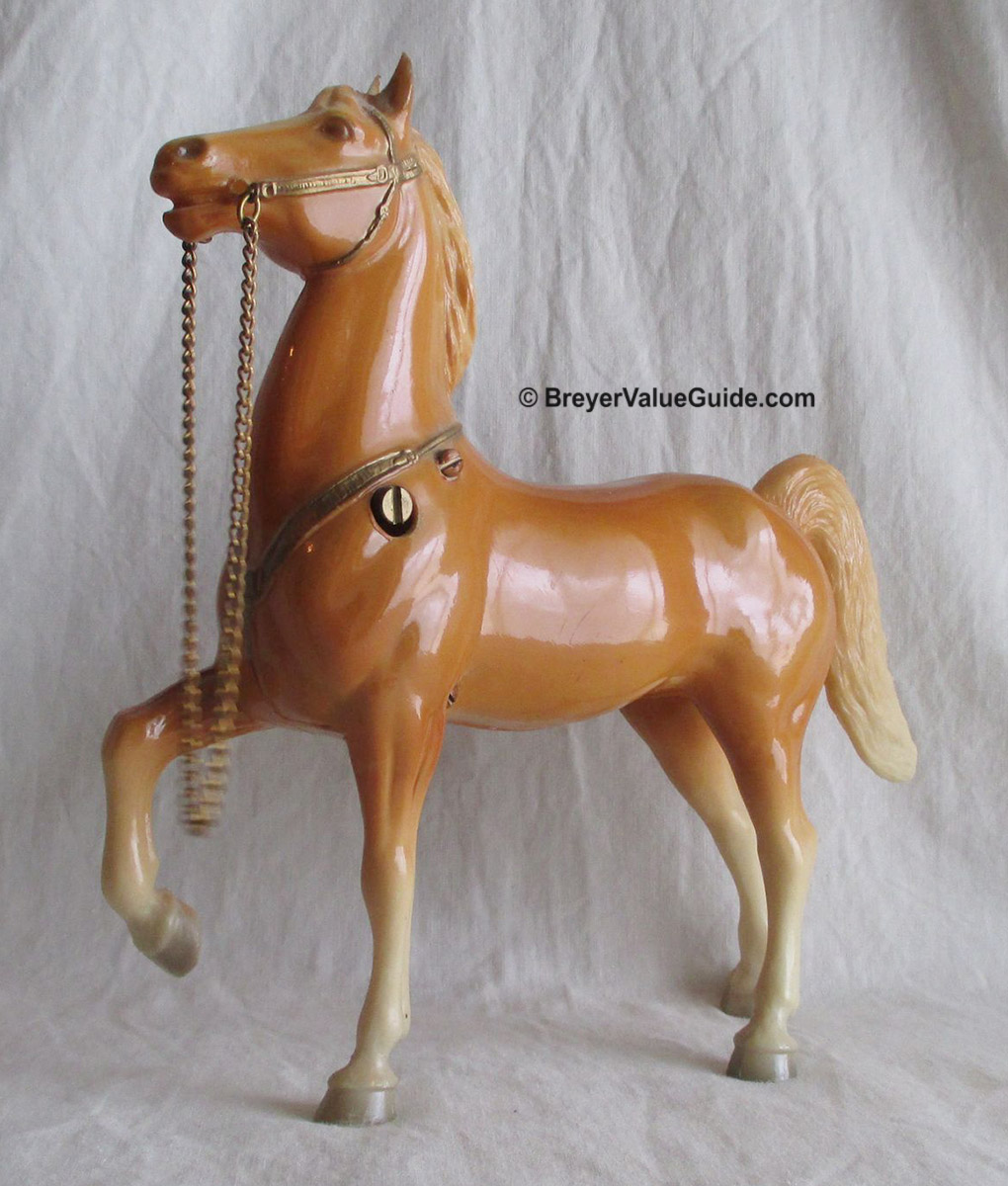 Glossy palomino (same as P43) with music box built in to shoulder. Includes red-brown western saddle. Included Lucky Ranger rigid rider, and possibly the Cowboy rigid rider. Shown without rider. Sears catalog SR