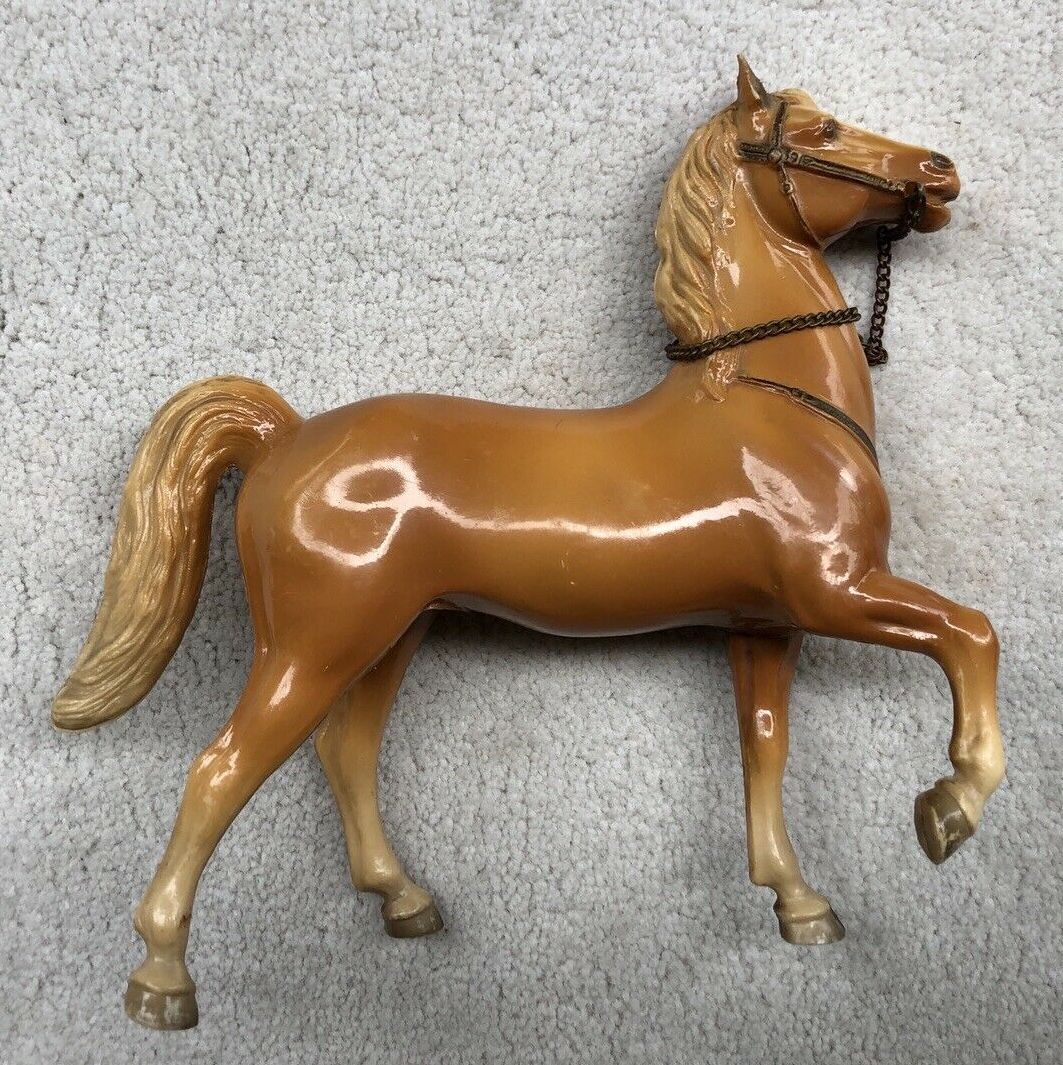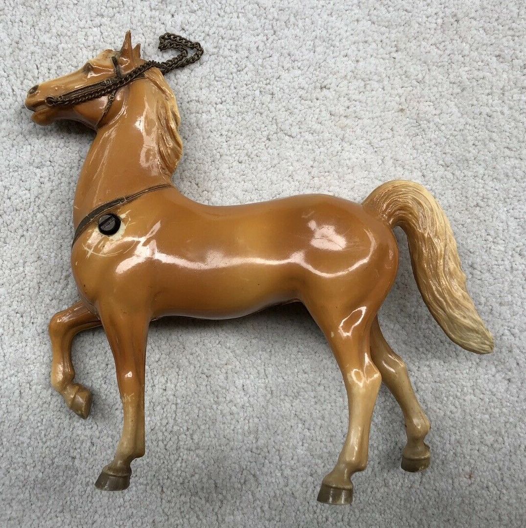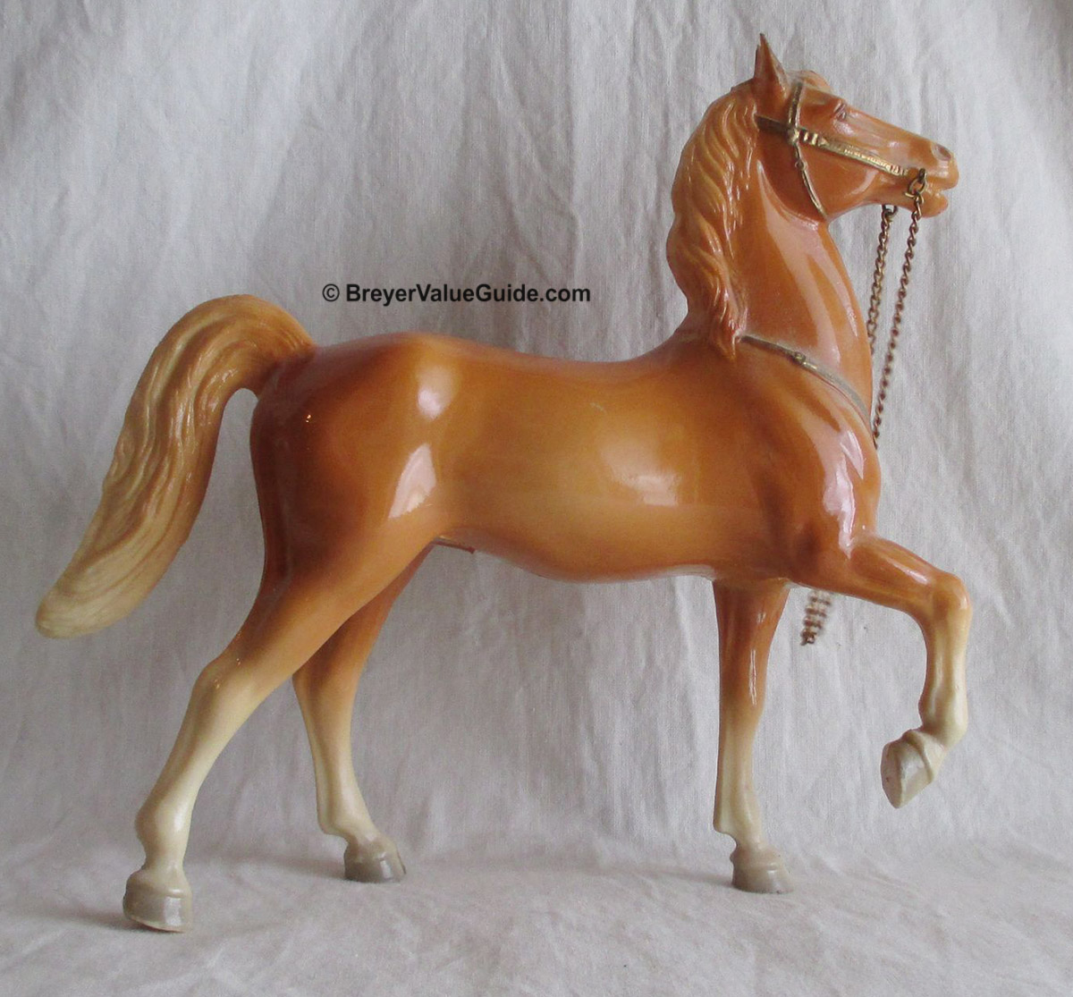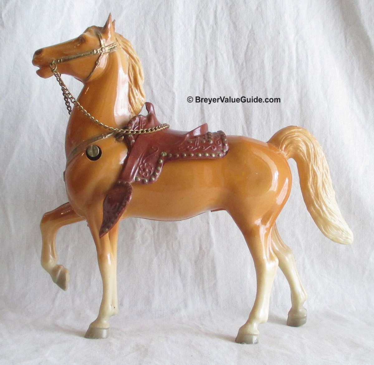 Glossy palomino (same as P43) with music box built in to shoulder. Includes red-brown western saddle. Included Lucky Ranger rigid rider, and possibly the Cowboy rigid rider. Shown without rider. Sears catalog SR