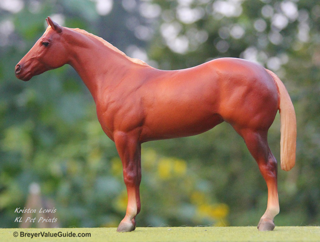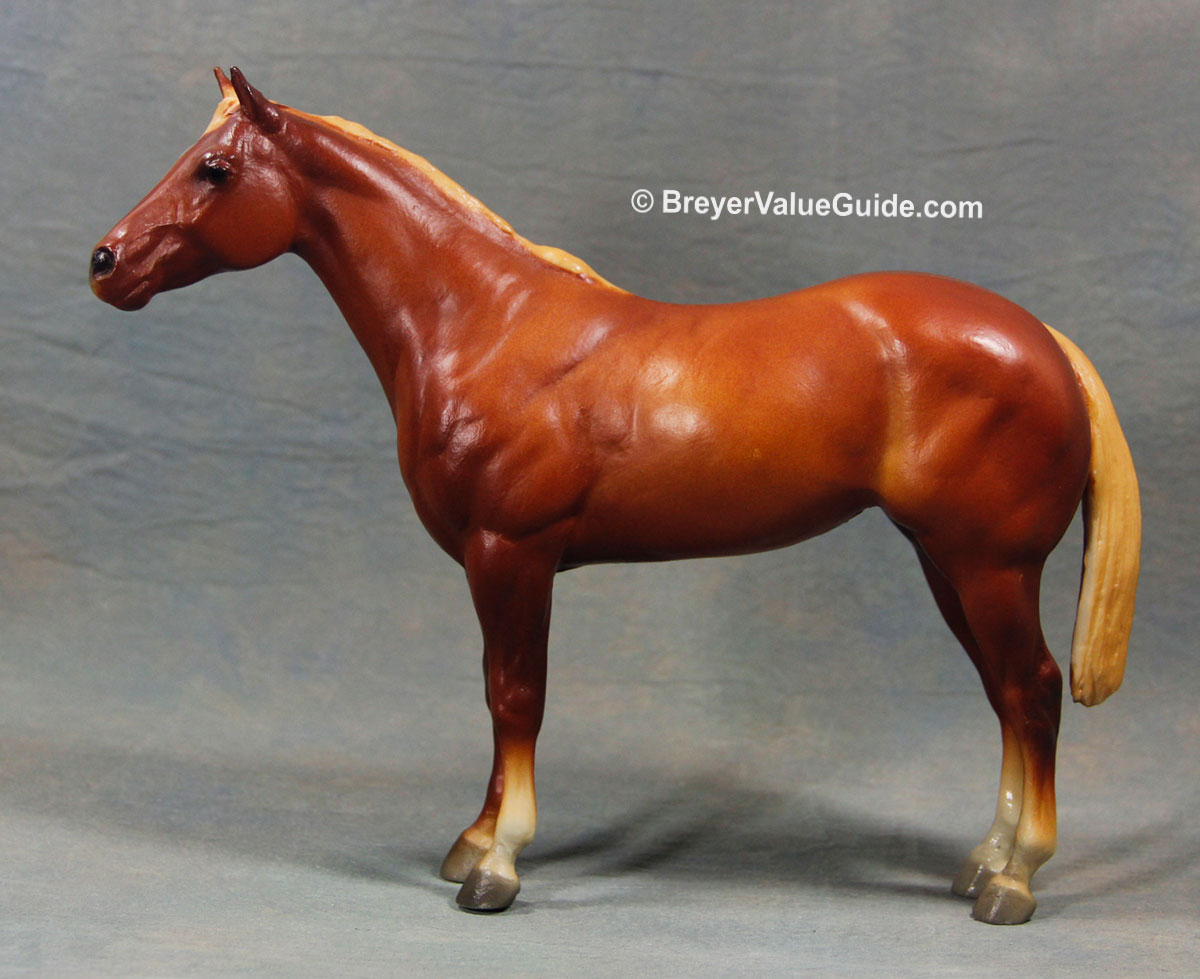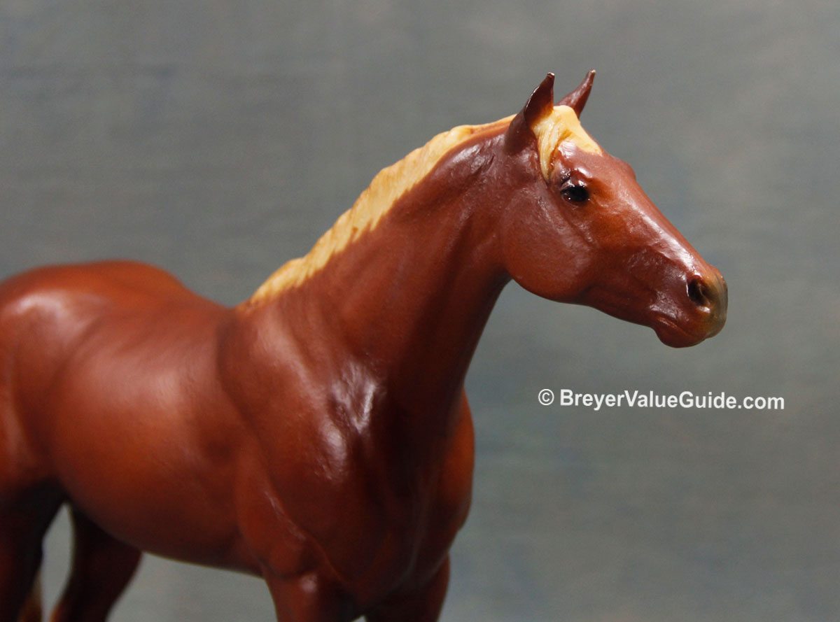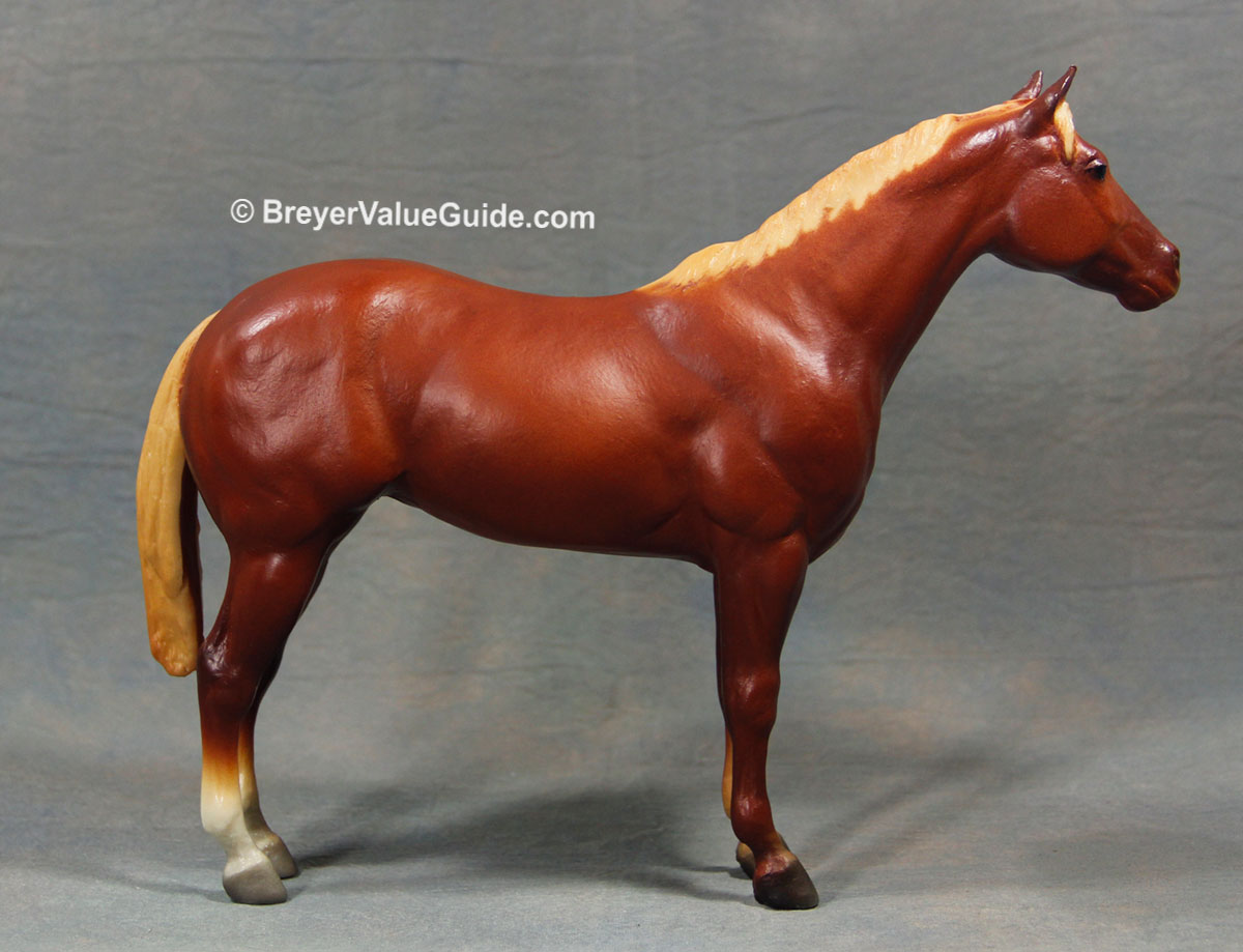 Matte chestnut/sorrel; flaxen mane and tail; solid face; 3 socks