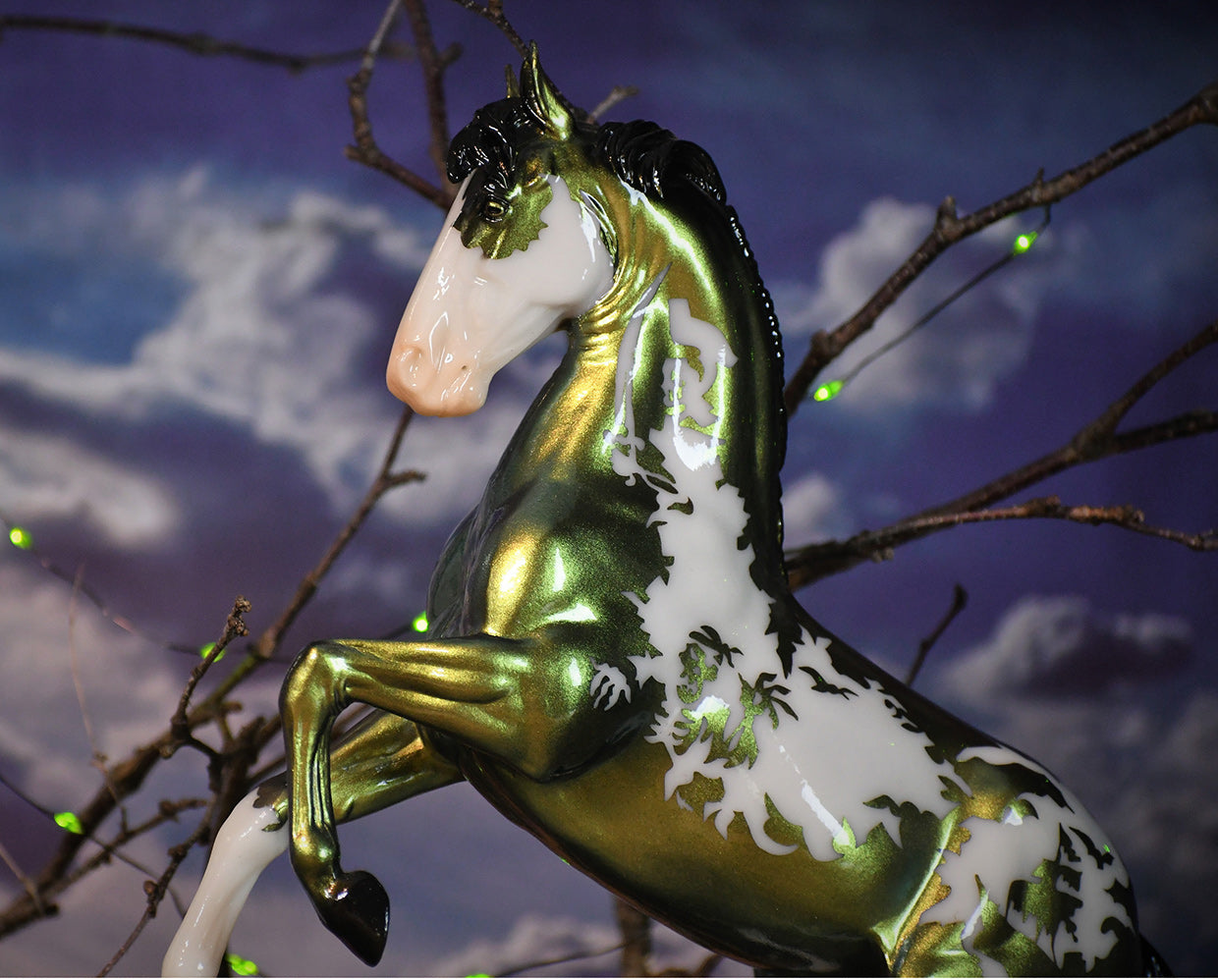 Iridescent, color-shifting green, “wild pinto coat is covered in skeletal pirates and a haunting pirate ship,” glow in the dark markings, Halloween SR Issue price: $65