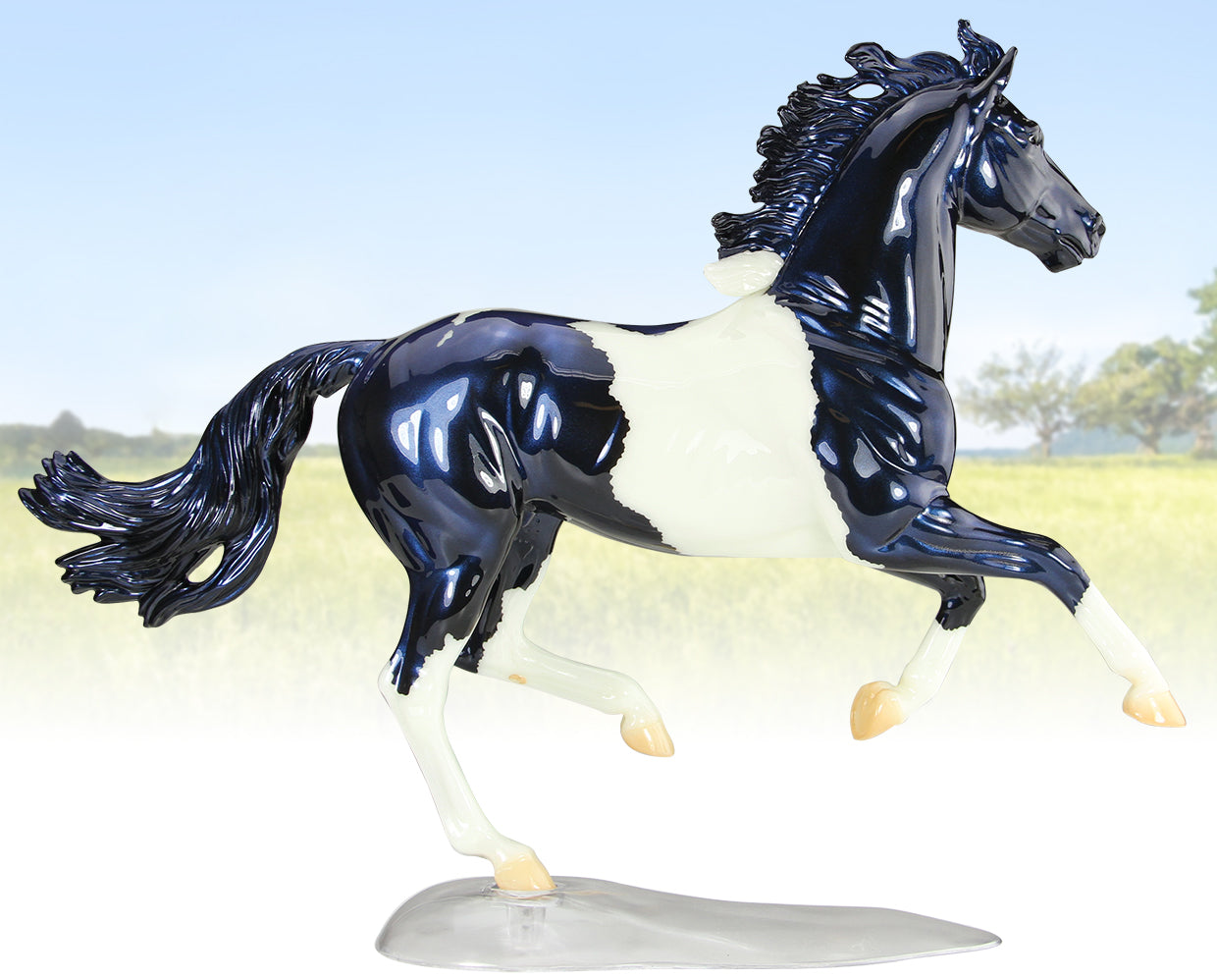Glossy metallic black and white pinto with a metallic blue sheen, has blaze in the shape of a feather, 4 stockings, “Magpie 2023” belly stamp, Birds of a Feather Series SR, 1/500