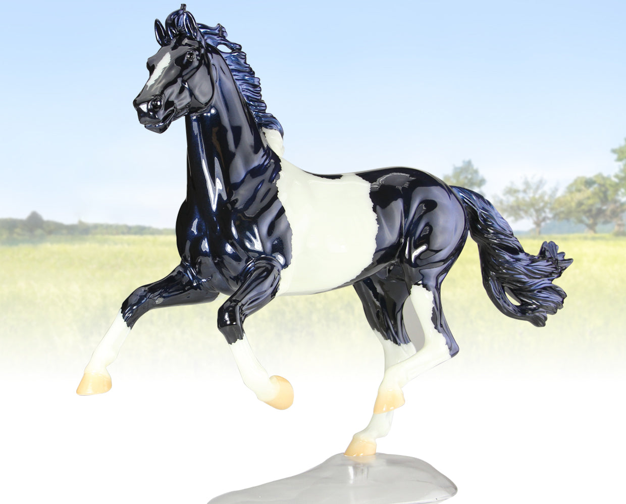 Glossy metallic black and white pinto with a metallic blue sheen, has blaze in the shape of a feather, 4 stockings, “Magpie 2023” belly stamp, Birds of a Feather Series SR, 1/500