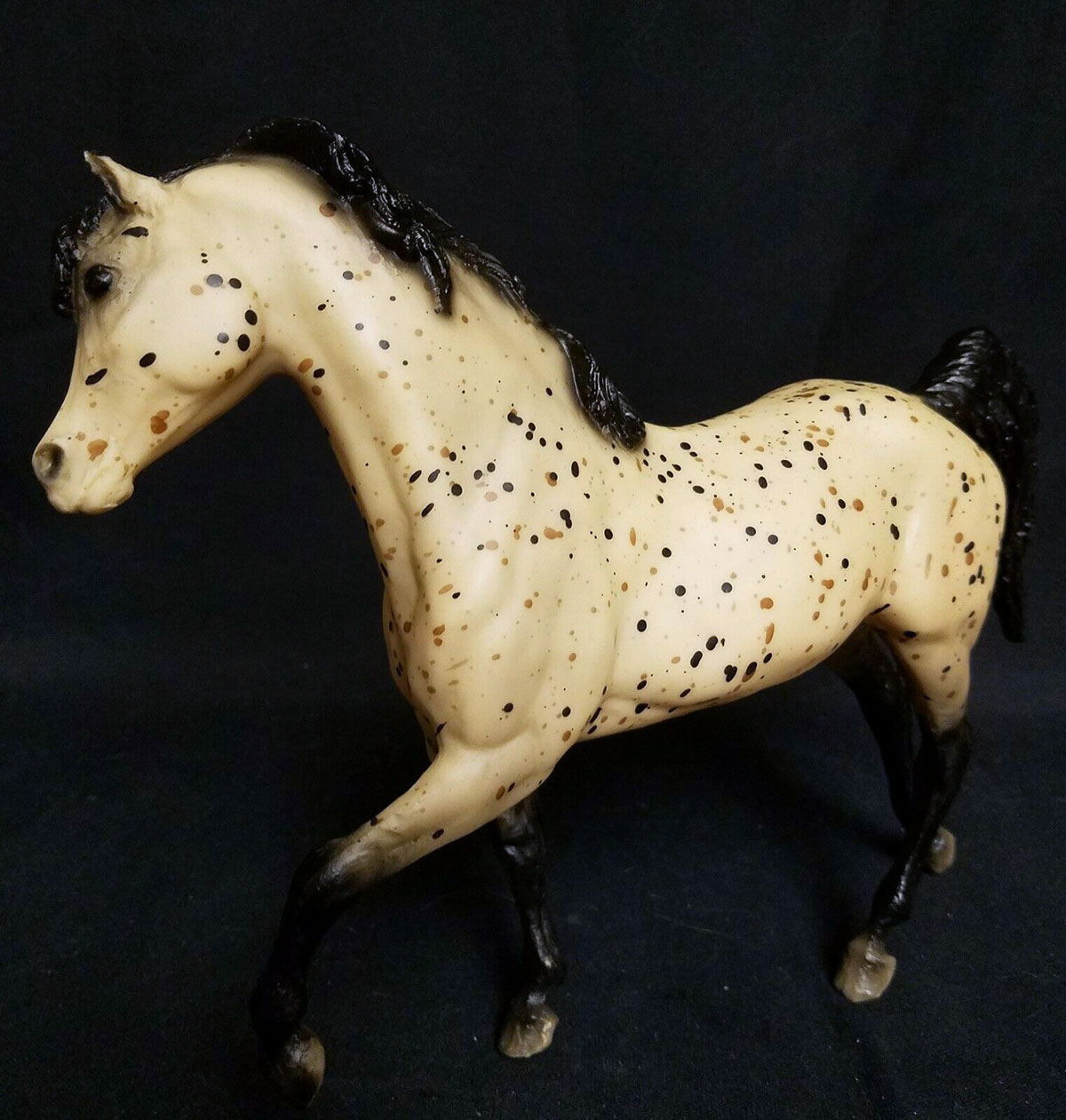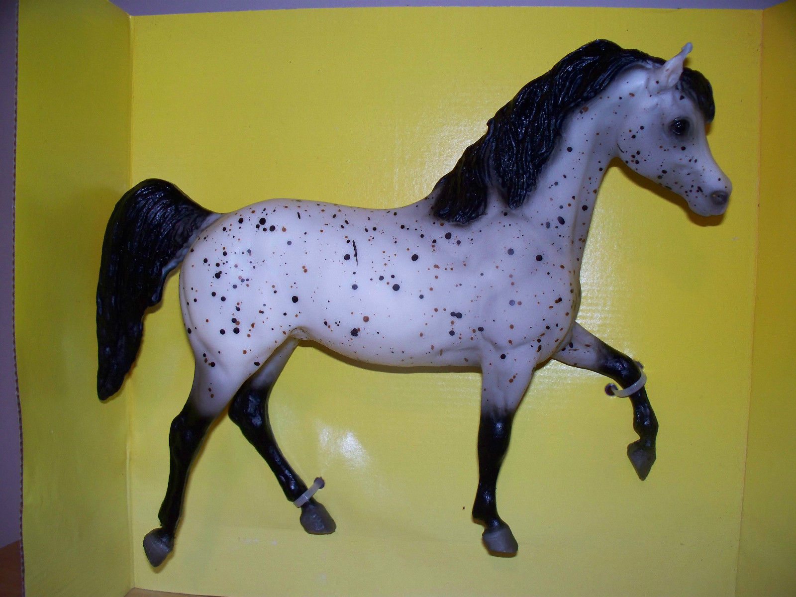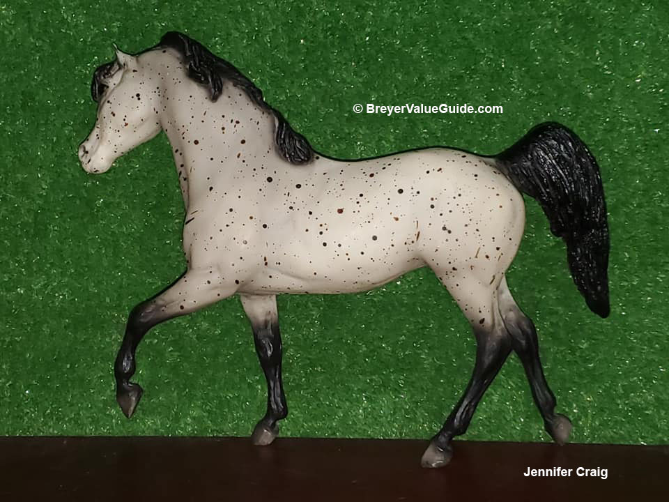 Matte black leopard appaloosa; black points; black and brown splatter spots; grey hooves