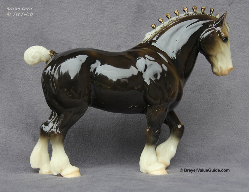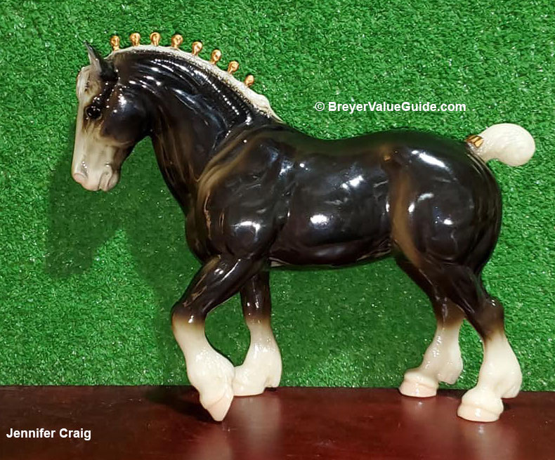 Glossy charcoal; bald face; 4 socks; gold bobs; Breyer Tour SR