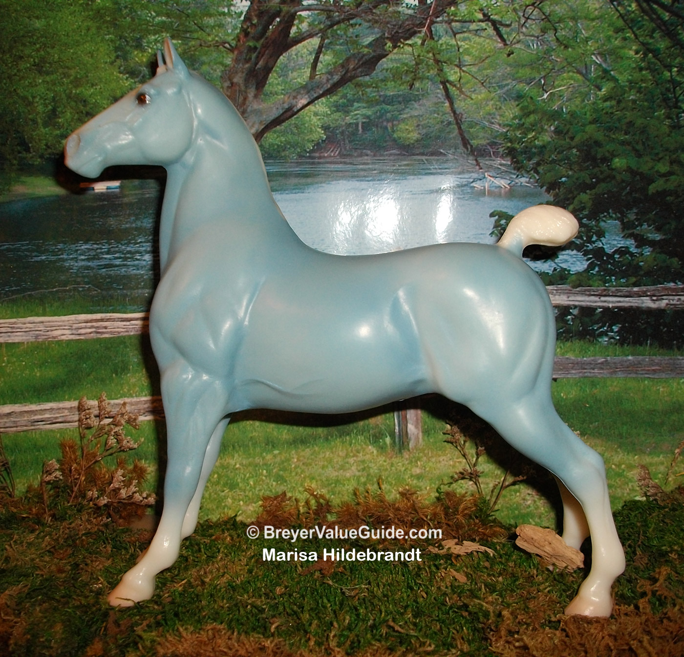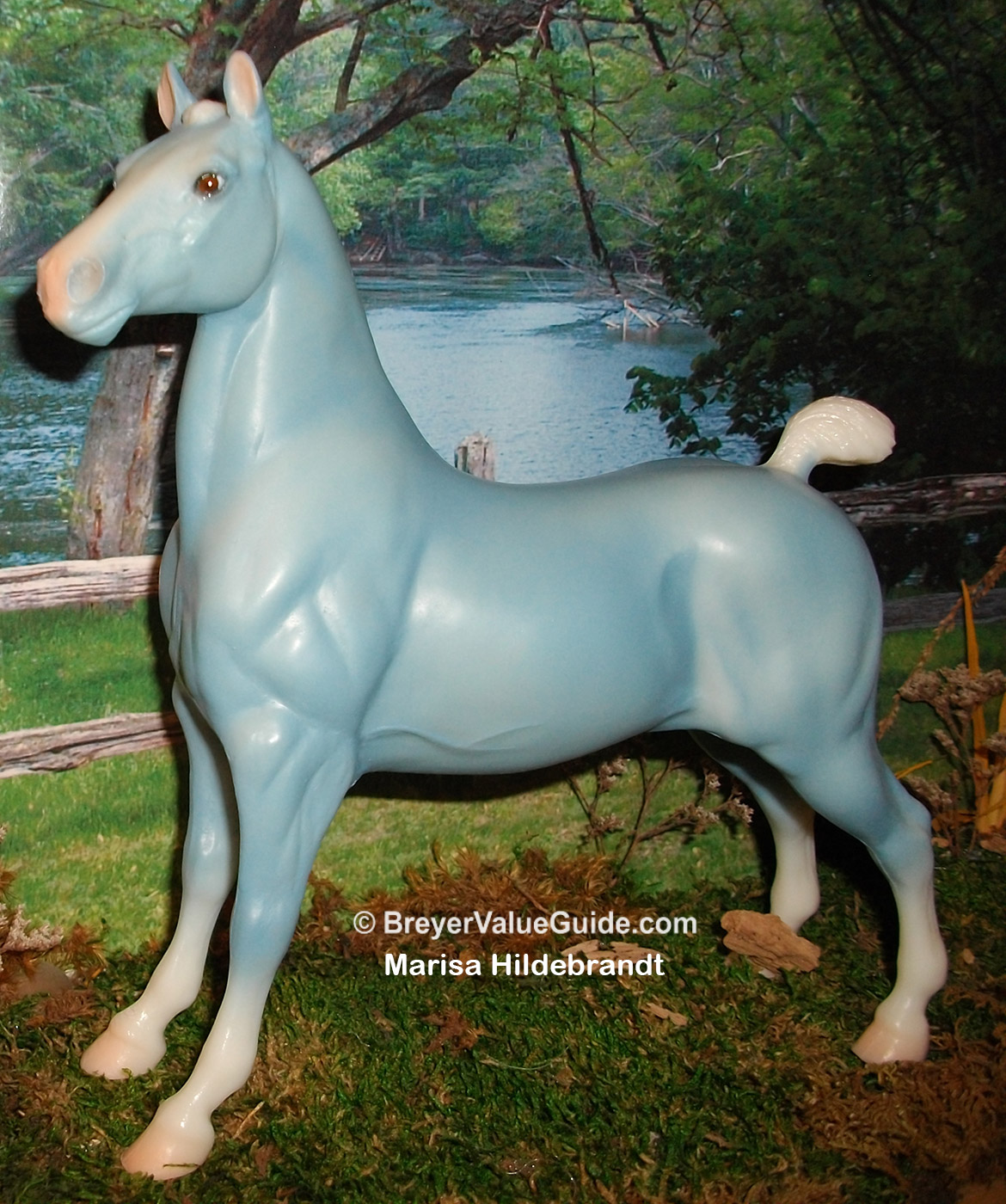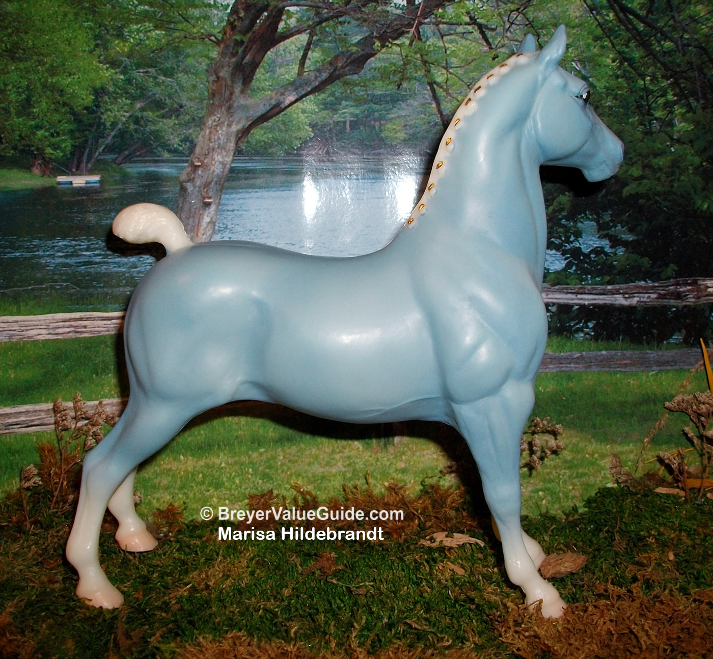 Matte wedgewood blue; bald face; gold bands in mane; 4 socks; BreyerFest Raffle SR; 1/26