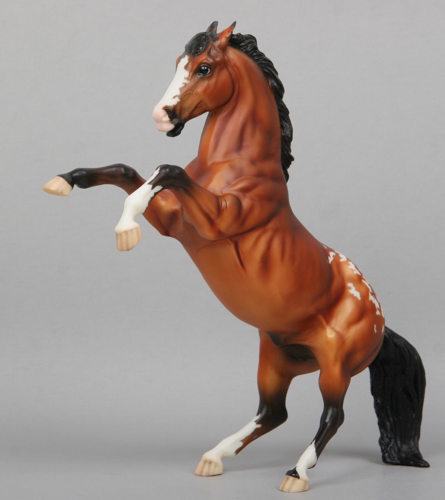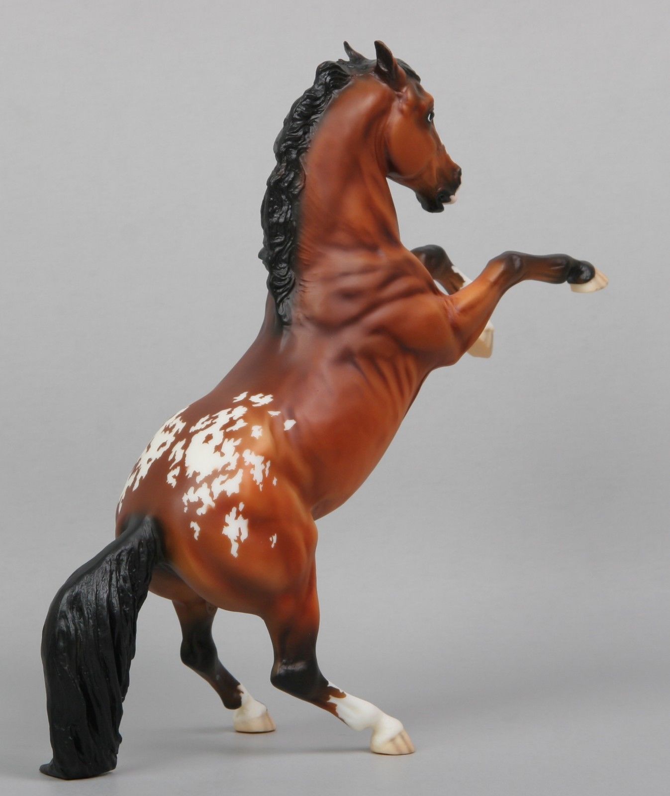 Matte bay snowflake appaloosa; detailed spots; wide blaze; 3 socks; striped hooves; Mid States SR