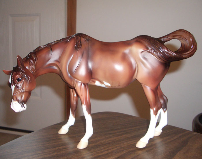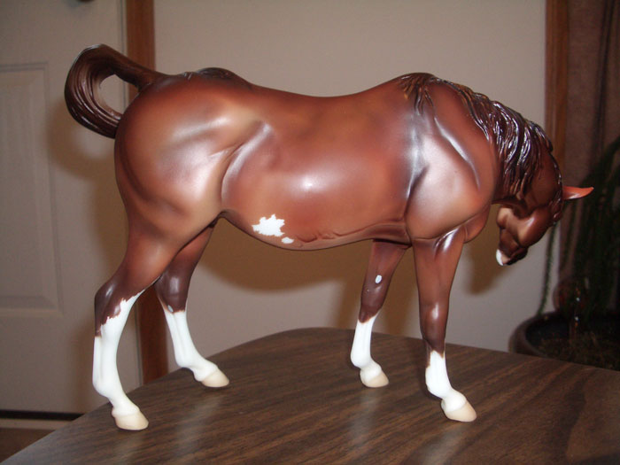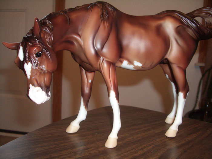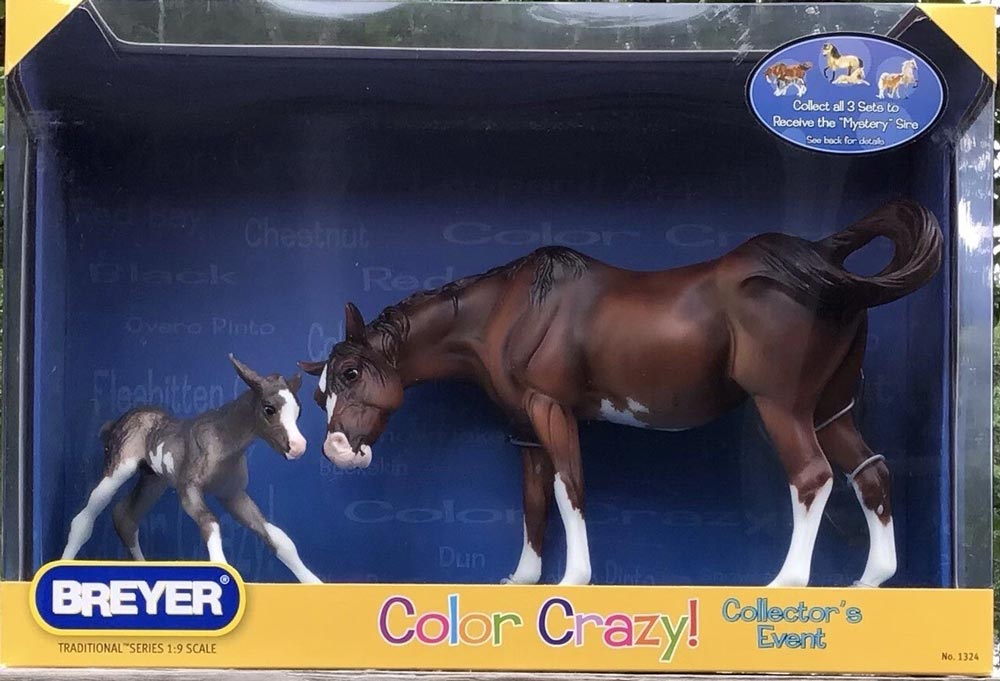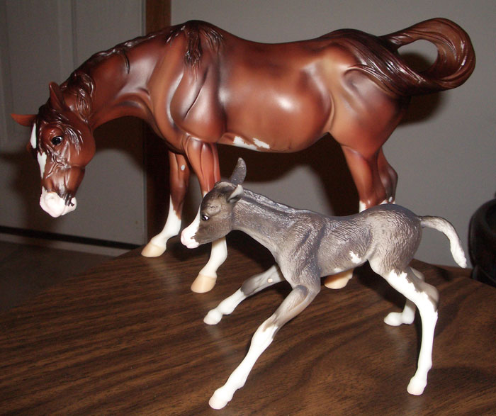Matte shaded red chestnut/bay pinto; minimal markings; broken blaze; white muzzle; 4 socks; sabino pinto variation Foal – Matte shaded grey sabino pinto, wide blaze, 4 high stockings Valued as set.