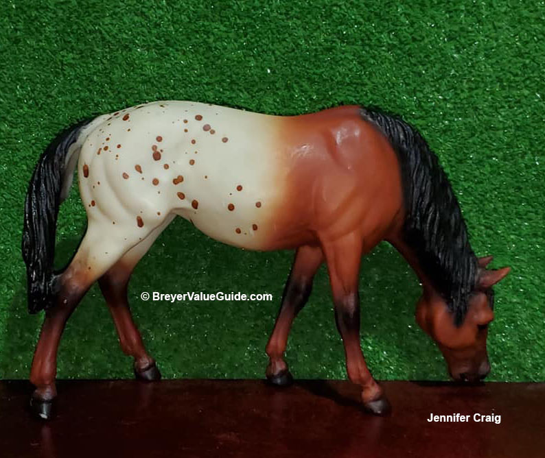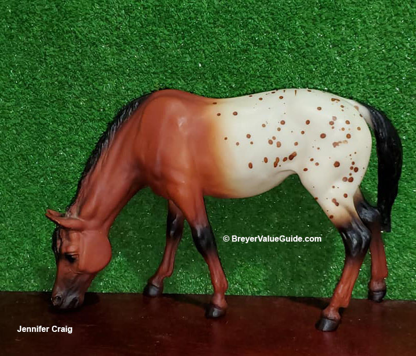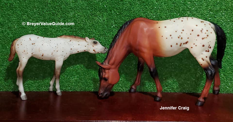 Matte bay appaloosa; brown splash spots; black points; Sears SR – with Suckling Foal