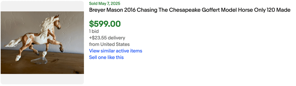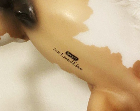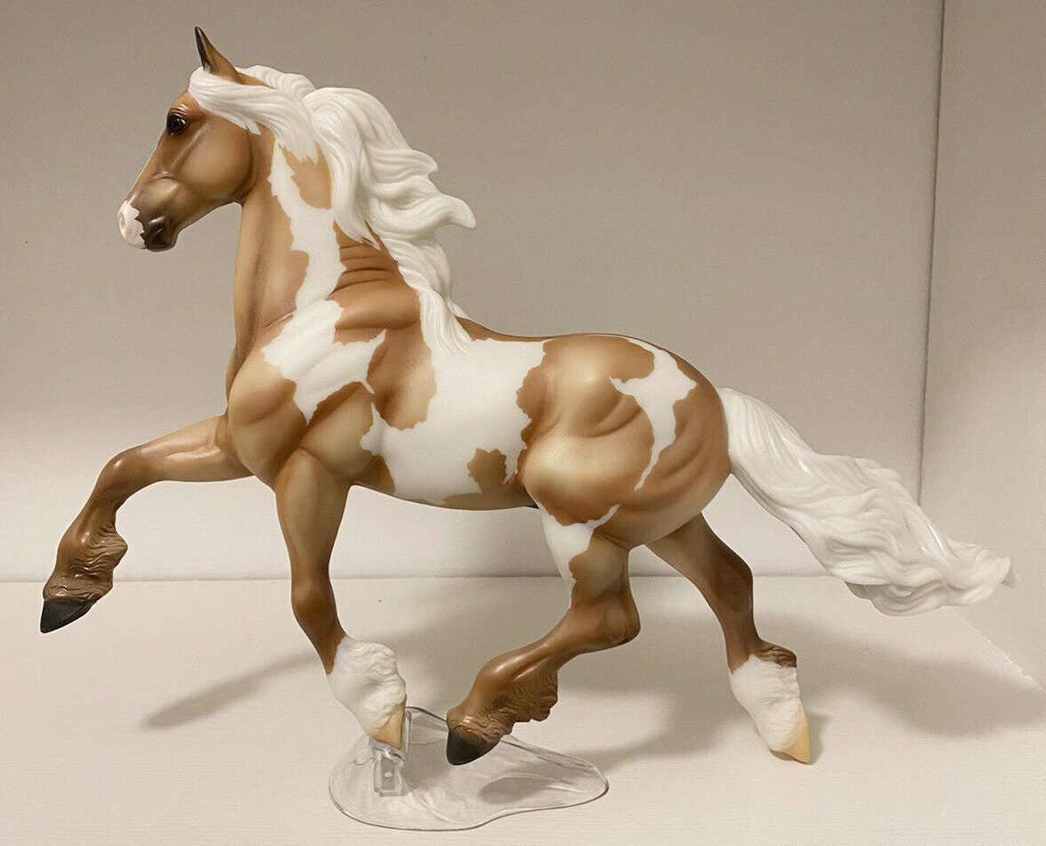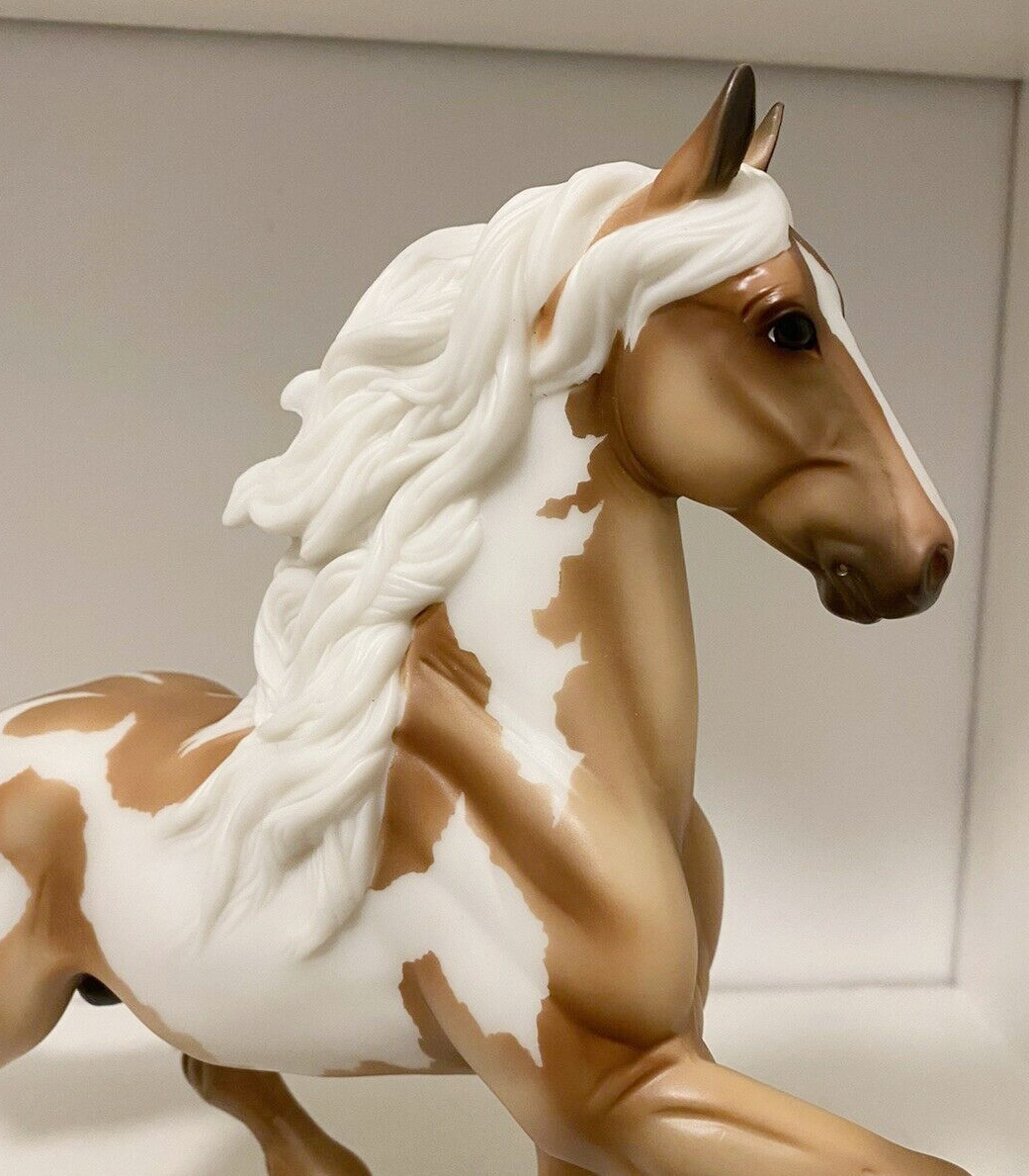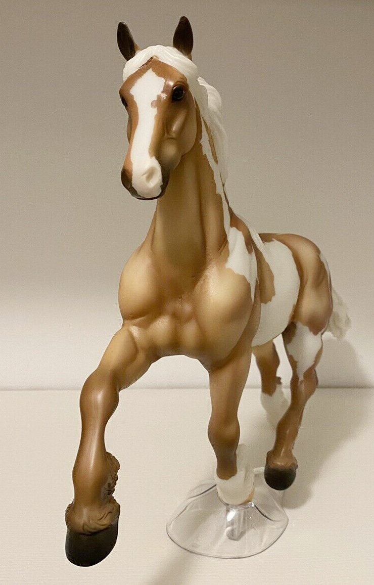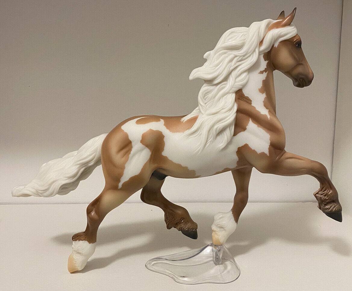 Matte dark palomino pinto; white mane and tail; blaze; 2 socks; 2016 Limited Edition stamp on belly; Chasing the Chesapeake Event SR; 1/144
