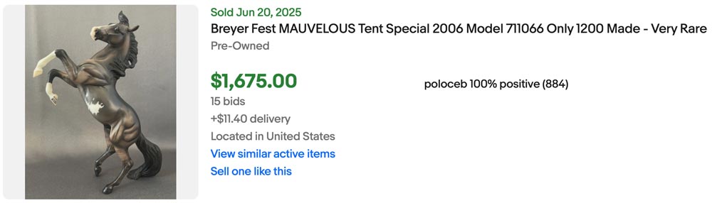 Glossy grullo pinto; star-stripe-snip; leg barring; 2 front socks; Breyer Event SR; 1/200 Value based on 2024 sold auction price.