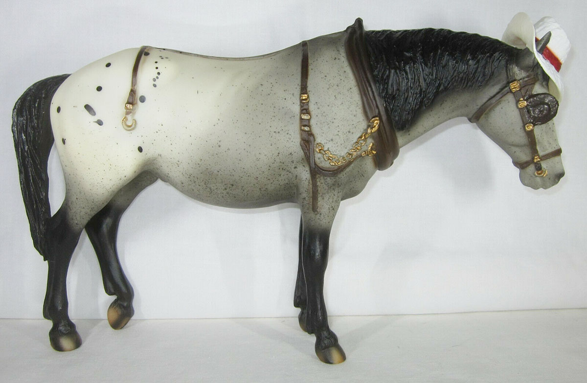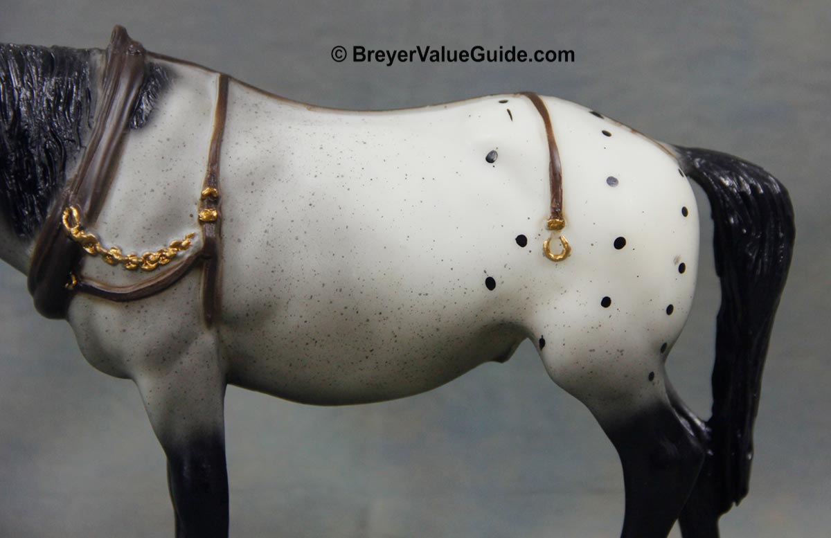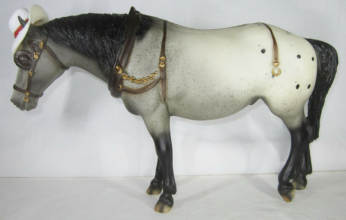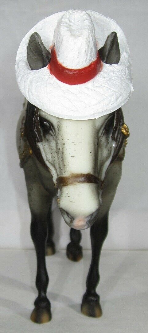 Matte grey appaloosa; blanket with few splatter spots; white hat with red hatband