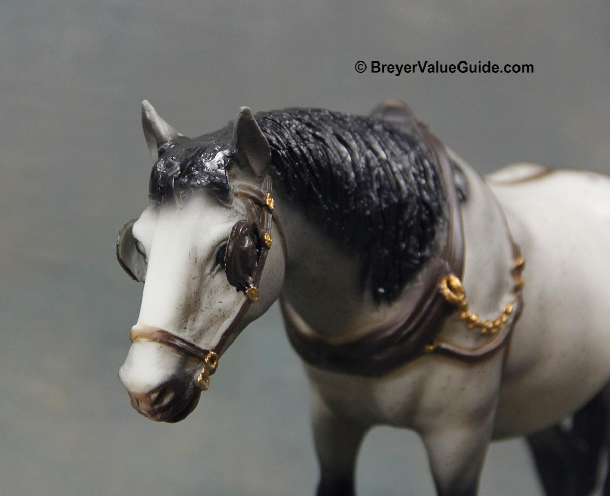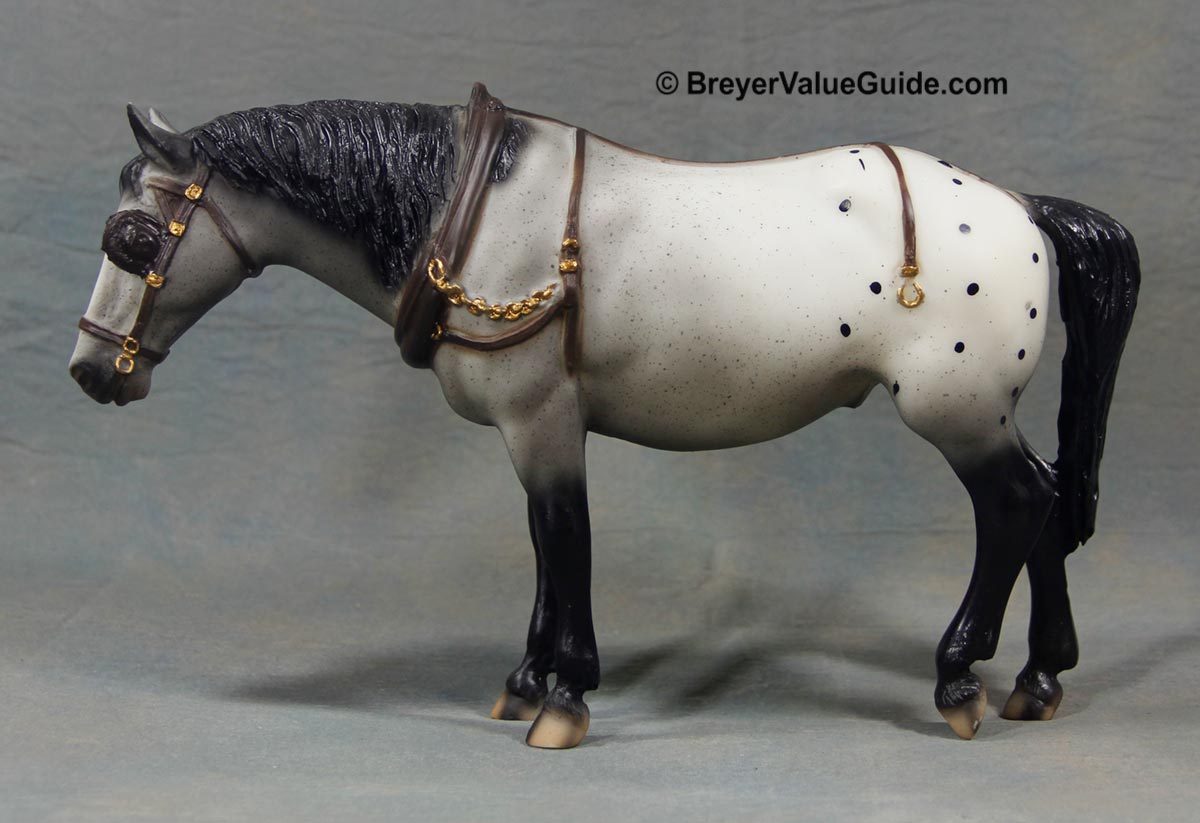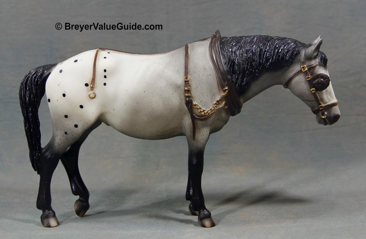 Matte grey appaloosa; blanket with few splatter spots; white hat with red hatband