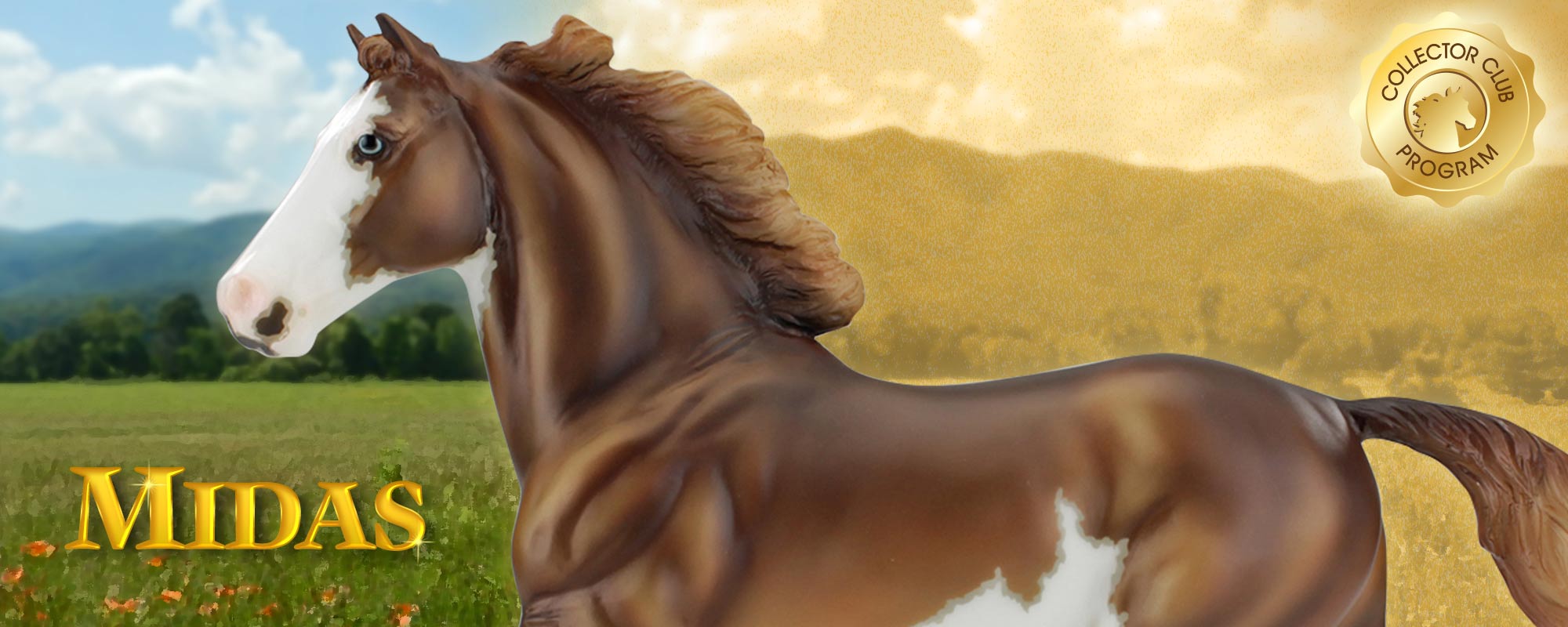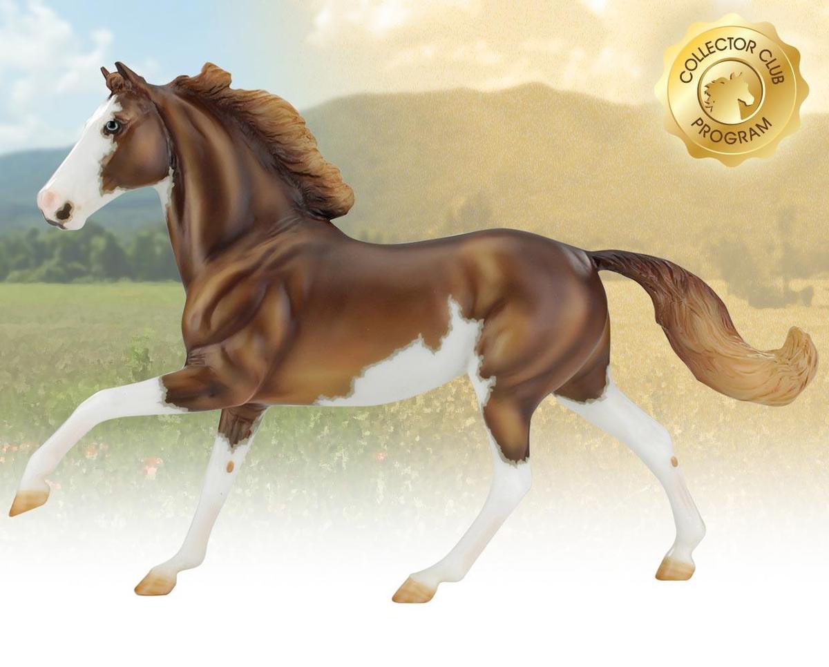 Matte shaded chestnut splash pinto, stenciled bald face, blue eyes, 4 high stockings, mapped markings, “Breyer Special Edition” printed on belly, Collector Club SR, painted at the New Jersey facility, 1/250 Issue price: $295