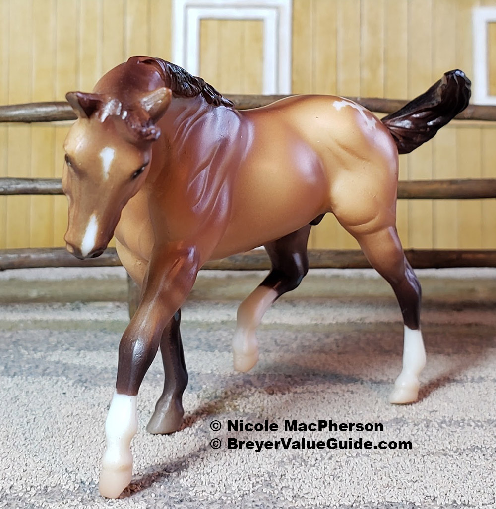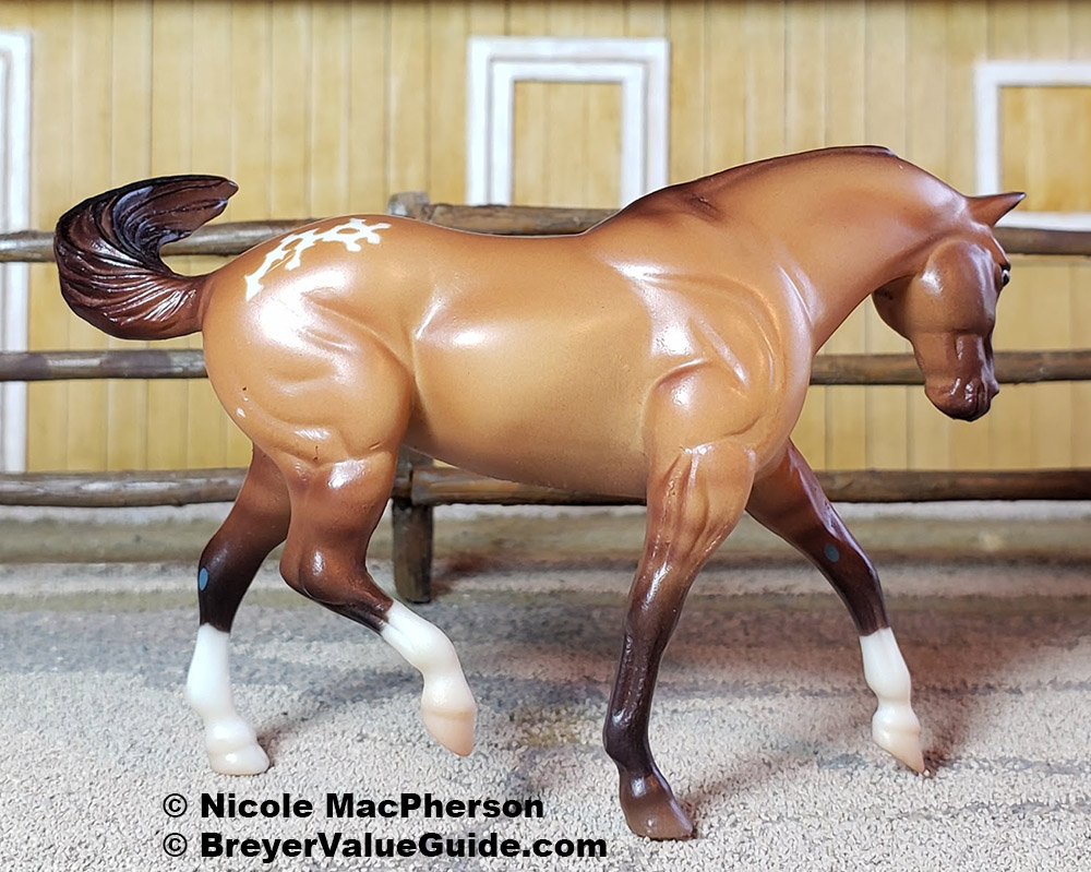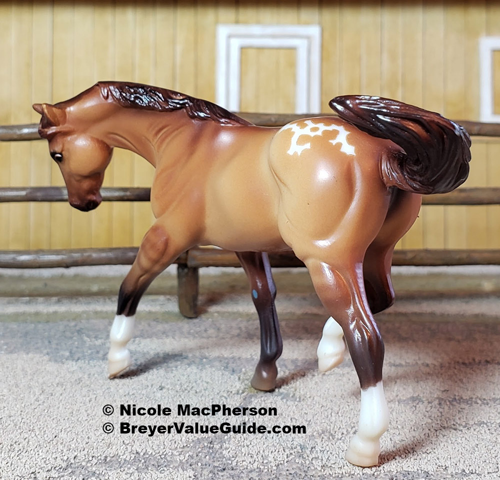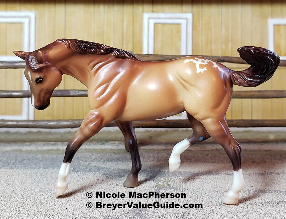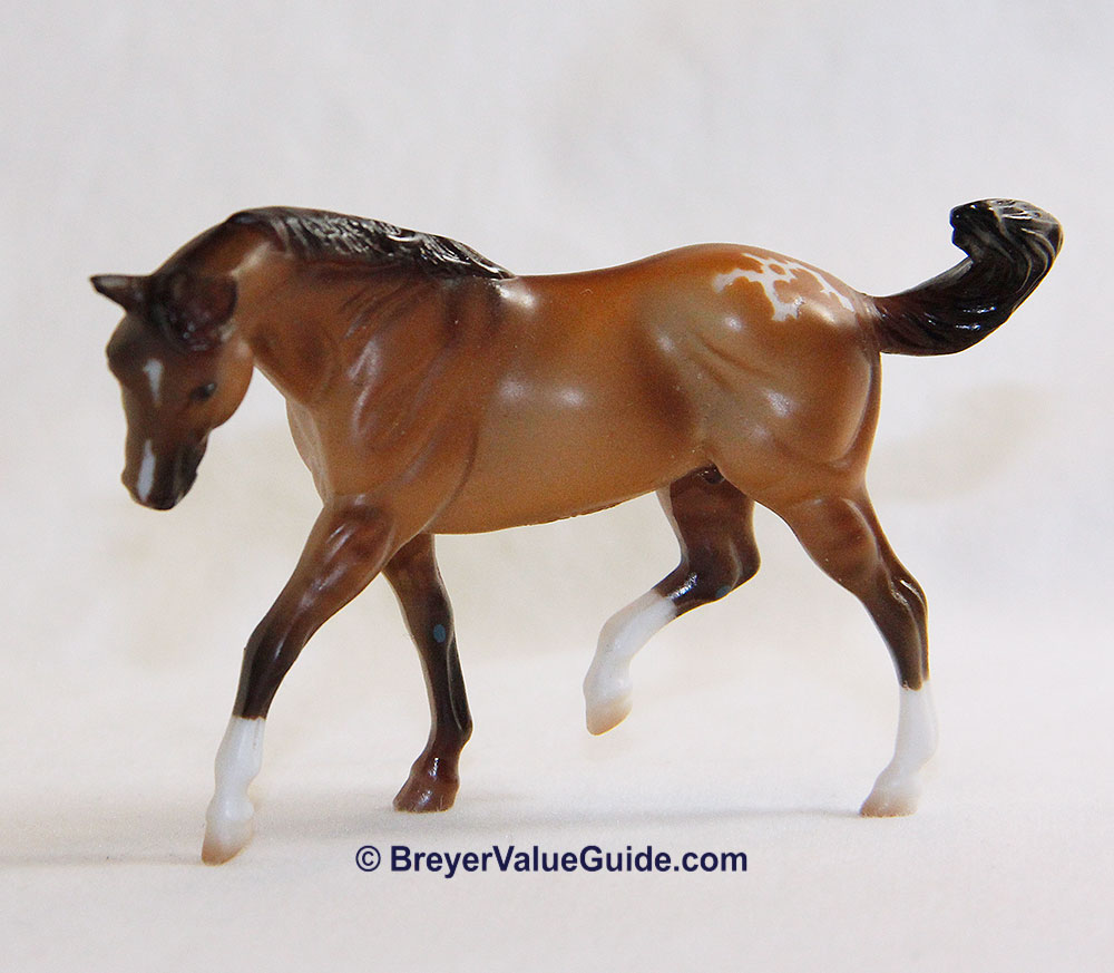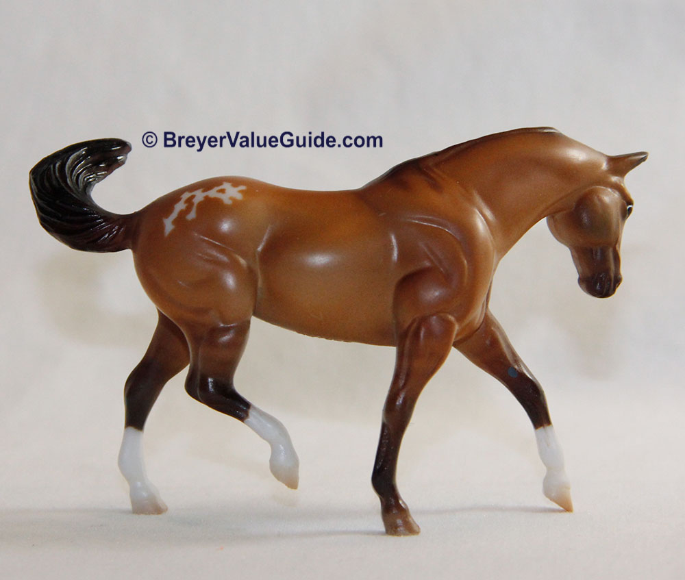 Matte shaded dun; stenciled snowflake appaloosa pattern; broken blaze; 3 socks; “Miniature Quarterflash”; JAH SR; 1/3000