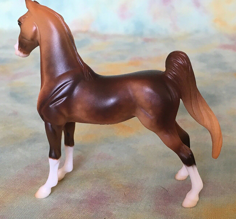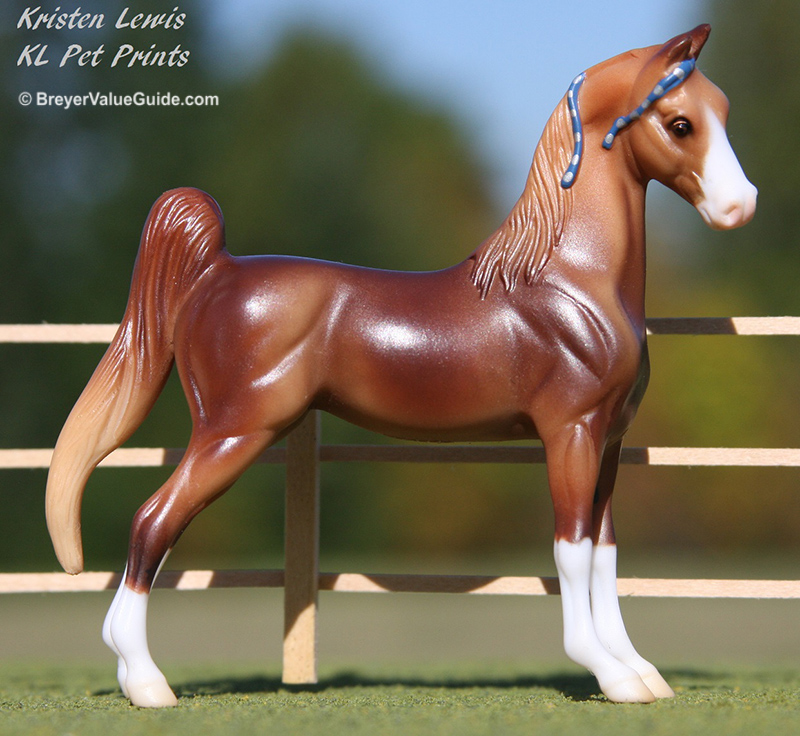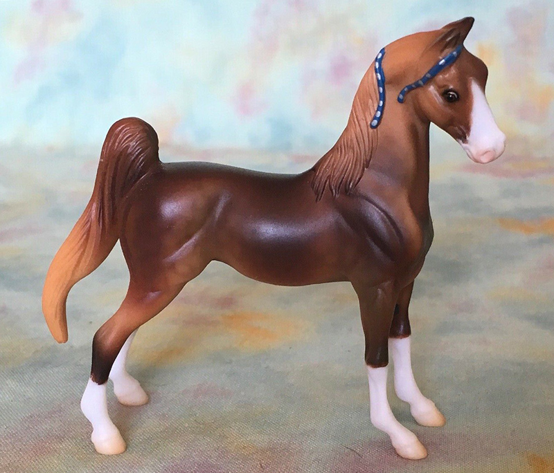 Matte shaded liver chestnut; dapples; apron face; 4 socks; detailed eyes; silver on blue ribbons; mini “Third Times a Charm” JAH SR; 1/3000