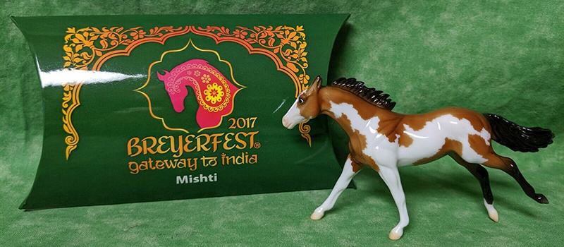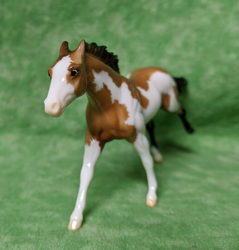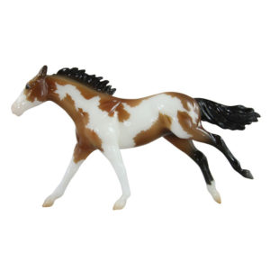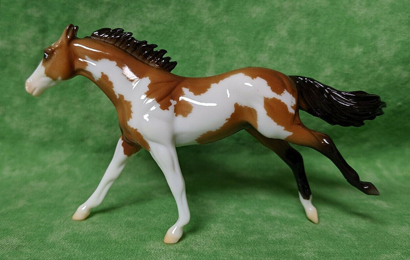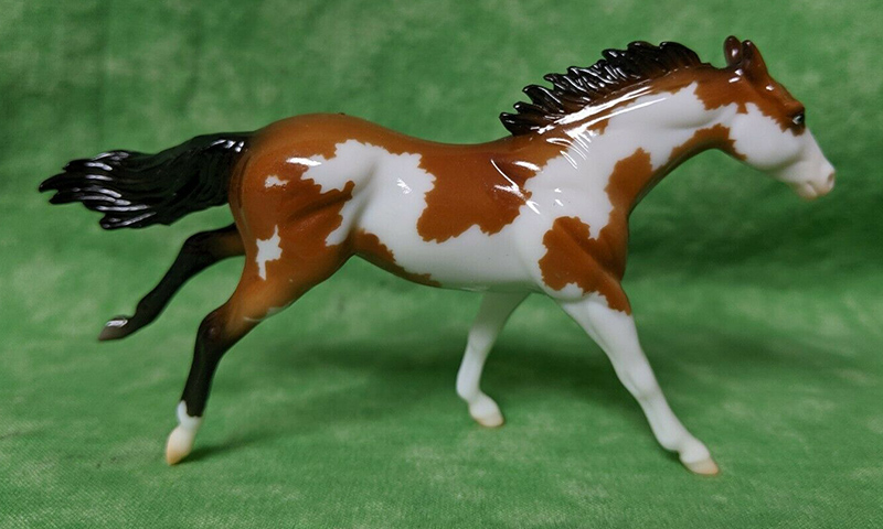 Glossy buckskin pinto; stenciled apron face; black mane and tail; black hind legs; 3 socks; BreyerFest SR; 1/1750