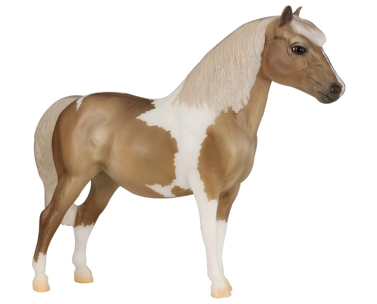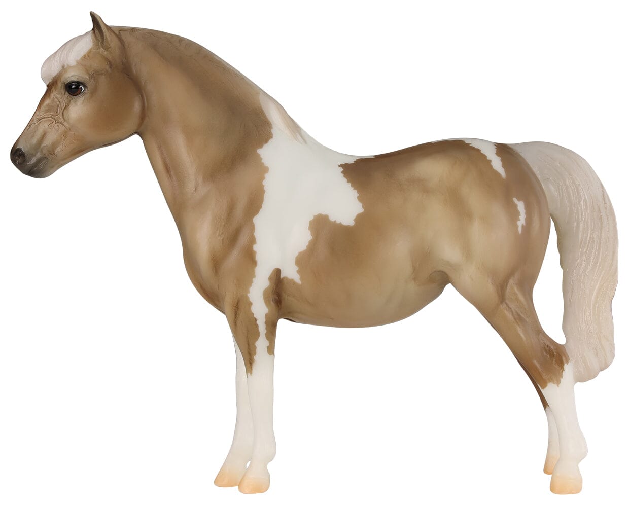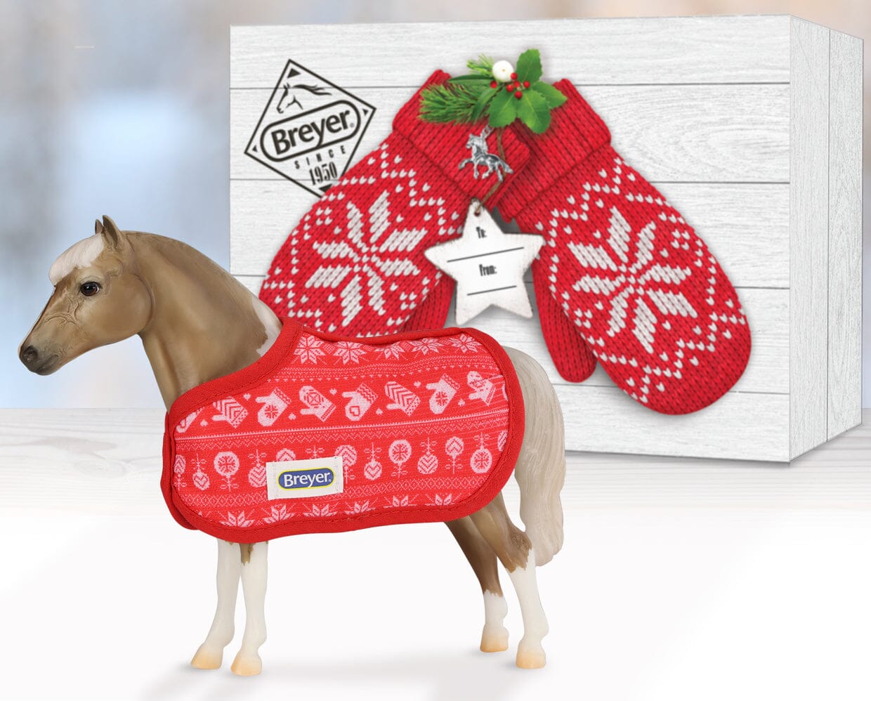 Matte dark palomino pinto, flaxen mane and tail, stripe, 4 socks, red holiday blanket Issue price: $40