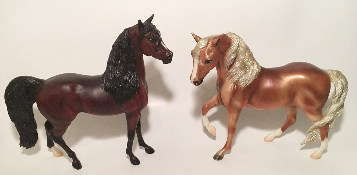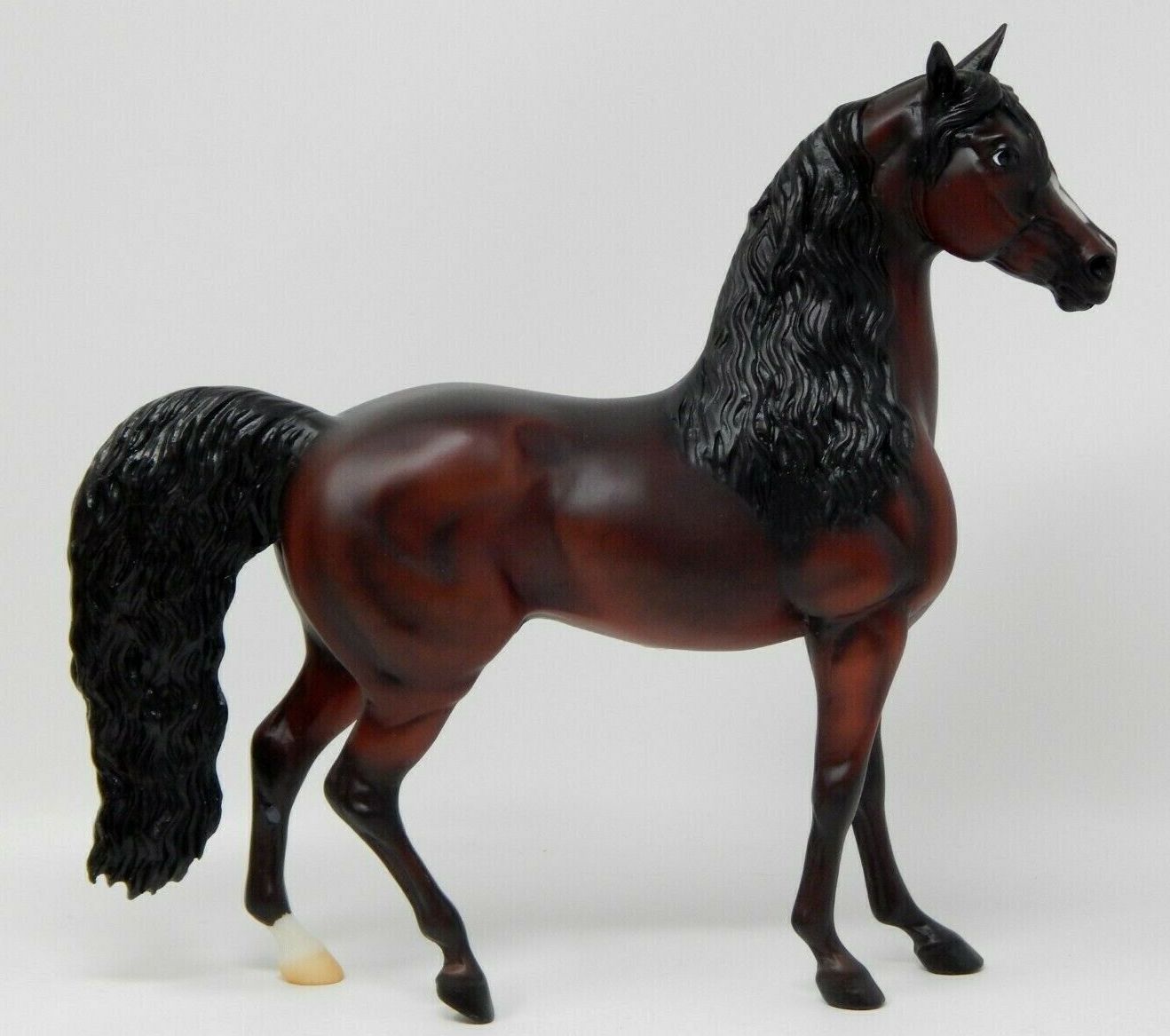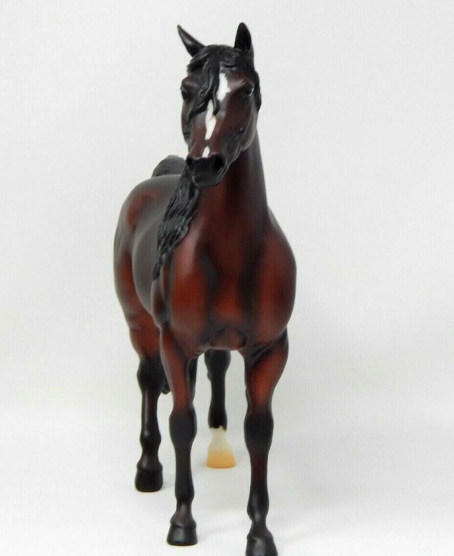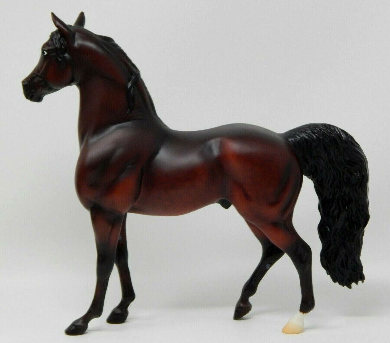 Matte shaded dark red bay; dapples; broken stripe; eye-whites; 1 hind sock; JCPenney SR – with Marabella