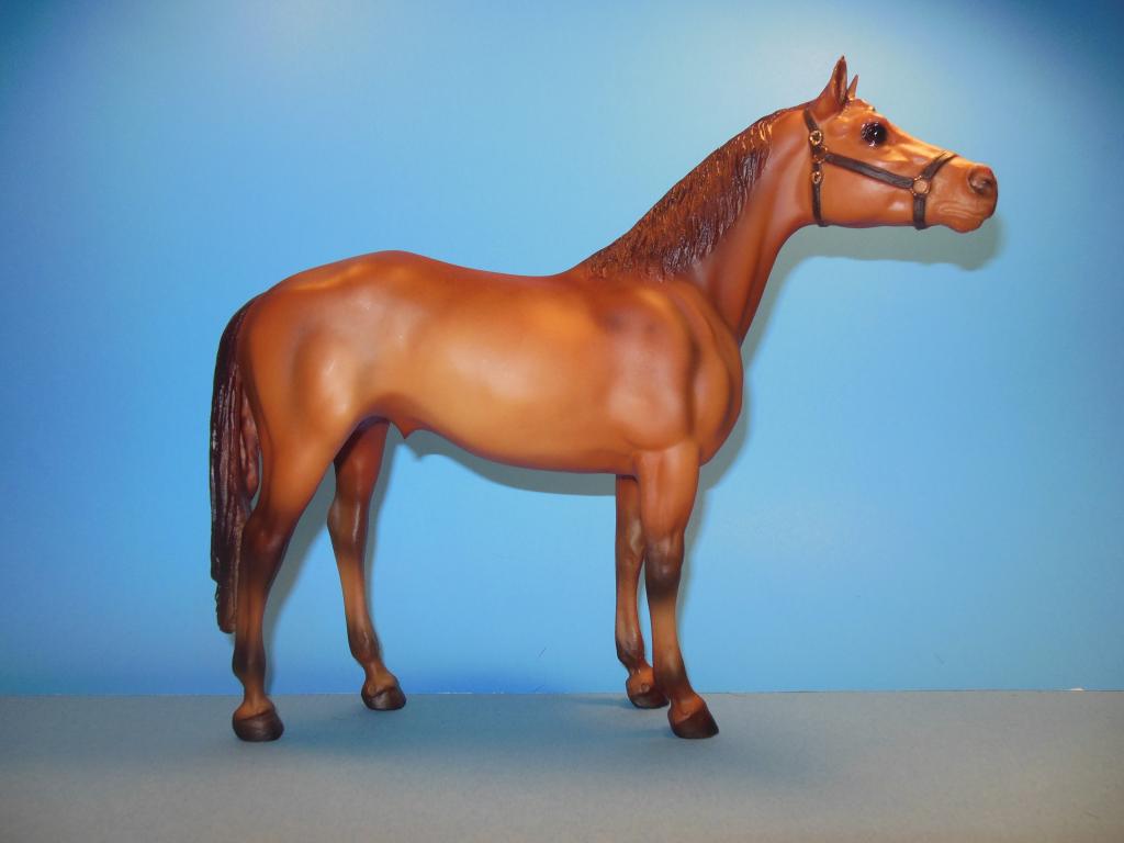 Matte brown chestnut; no white; brown halter with gold