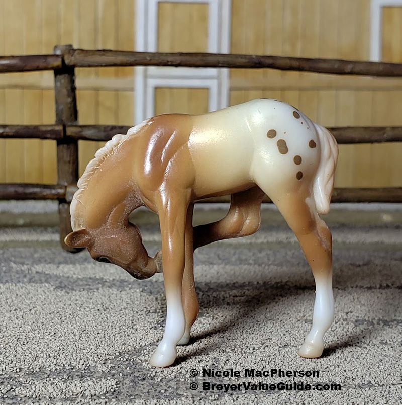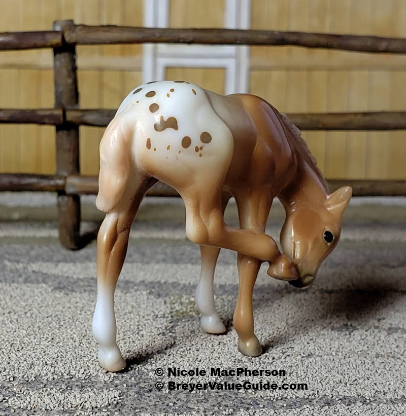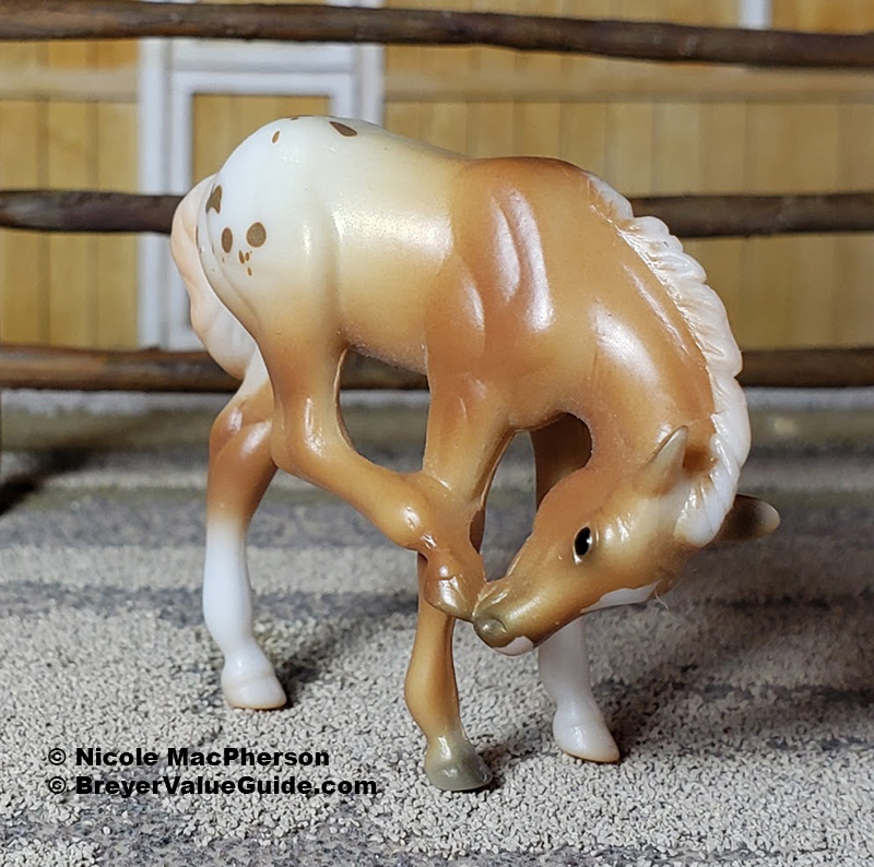 Matte light chestnut blanket appaloosa; chestnut splatter spots; flaxen mane and tail; star and snip; 2 socks