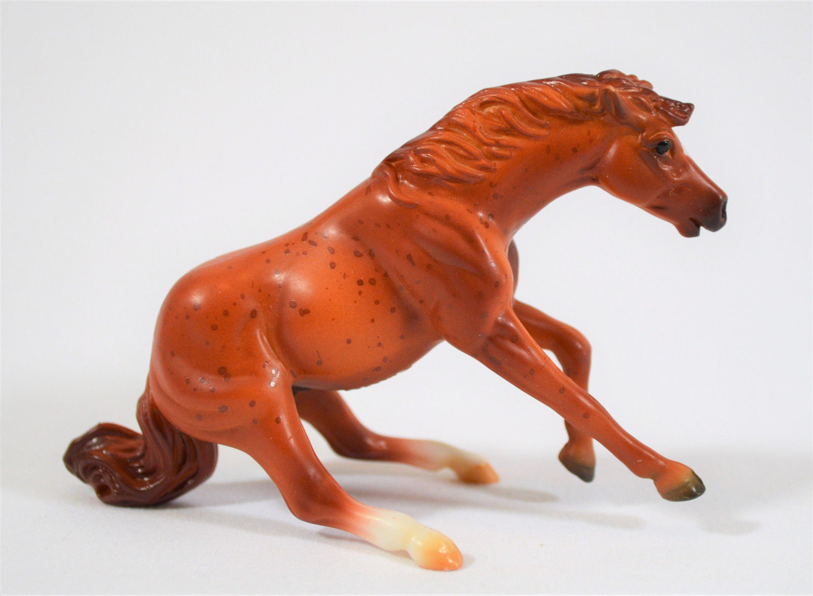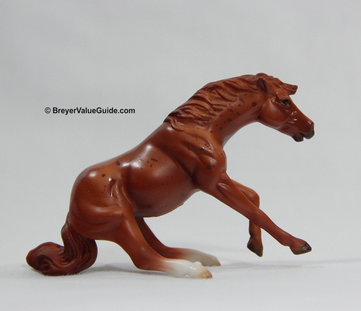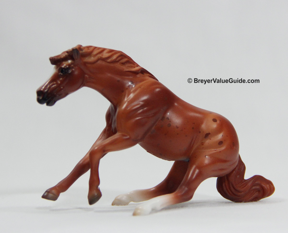 Matte red chestnut with red speckled roaning; blaze; 2 hind socks