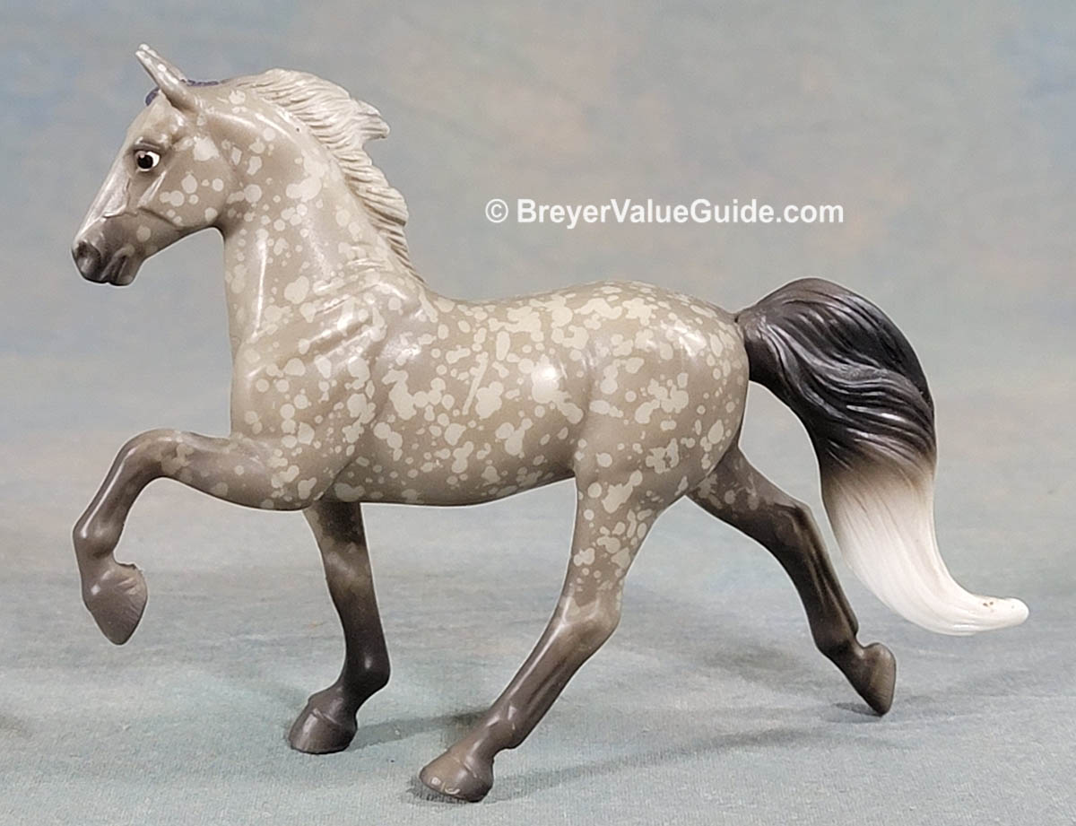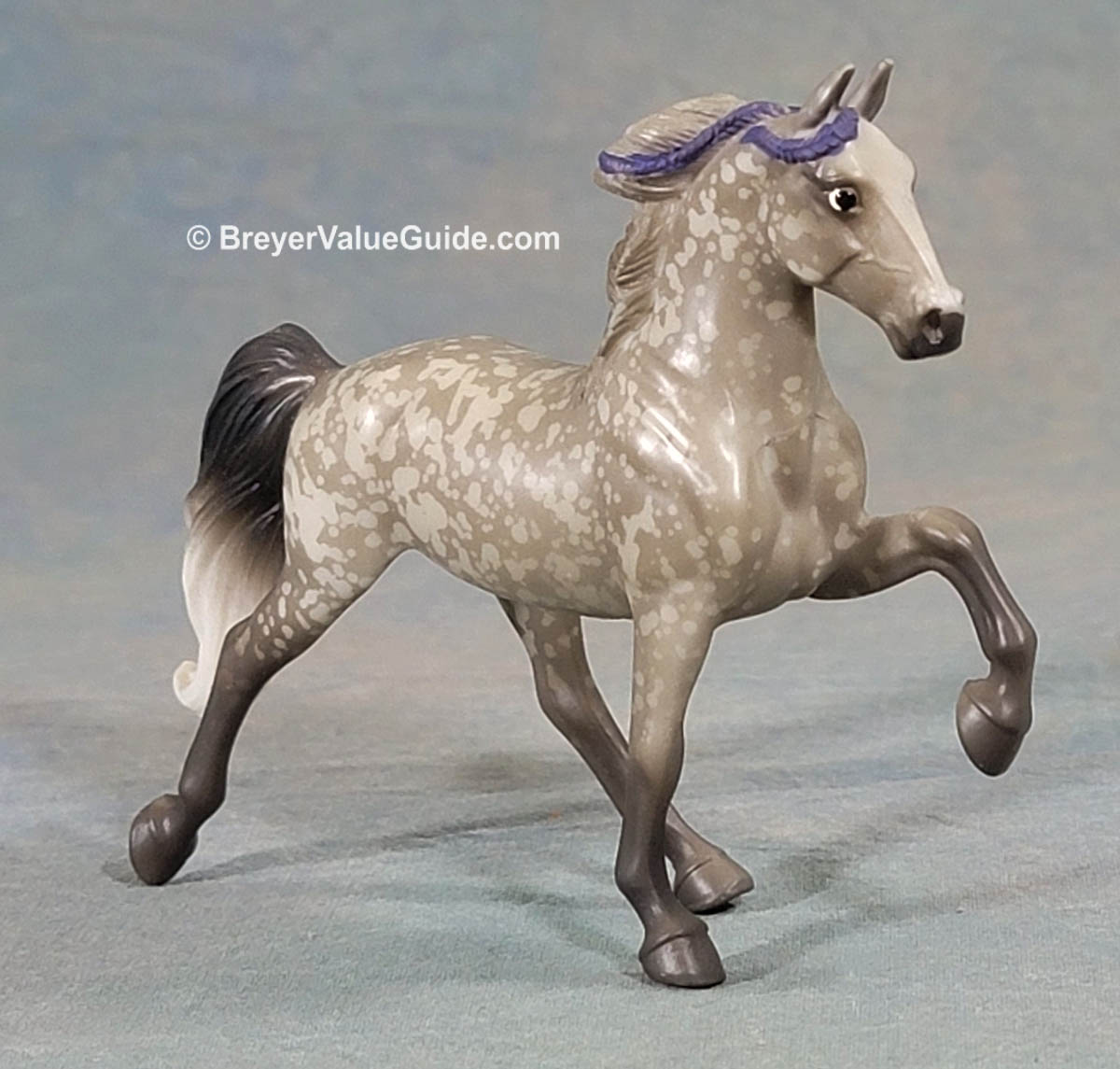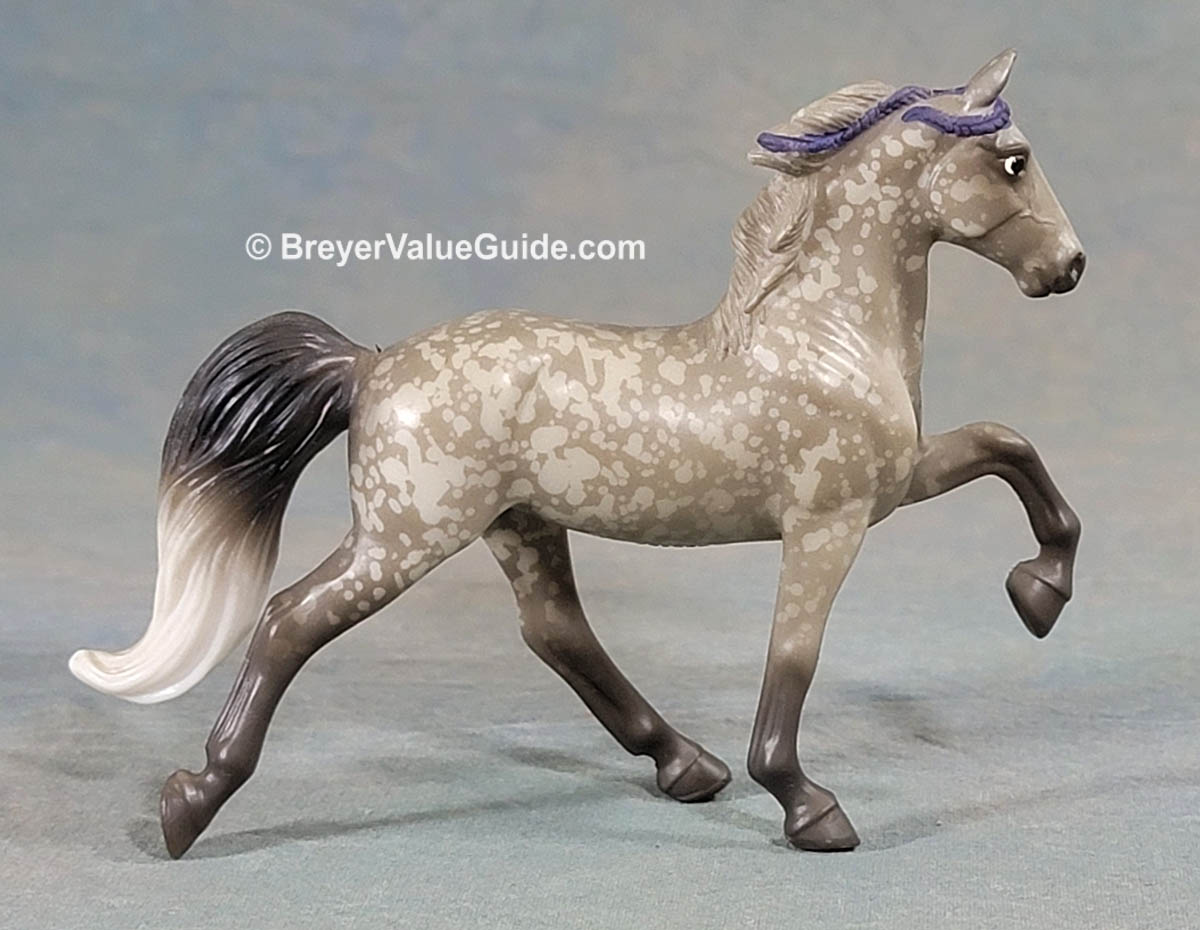 Matte resist dapple grey; darker legs; dark grey and white tail, purple ribbons; same as 5907