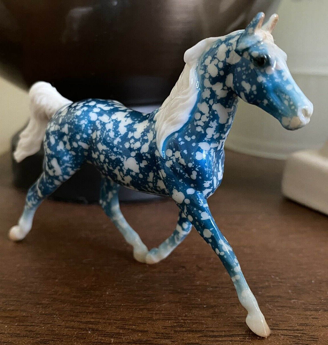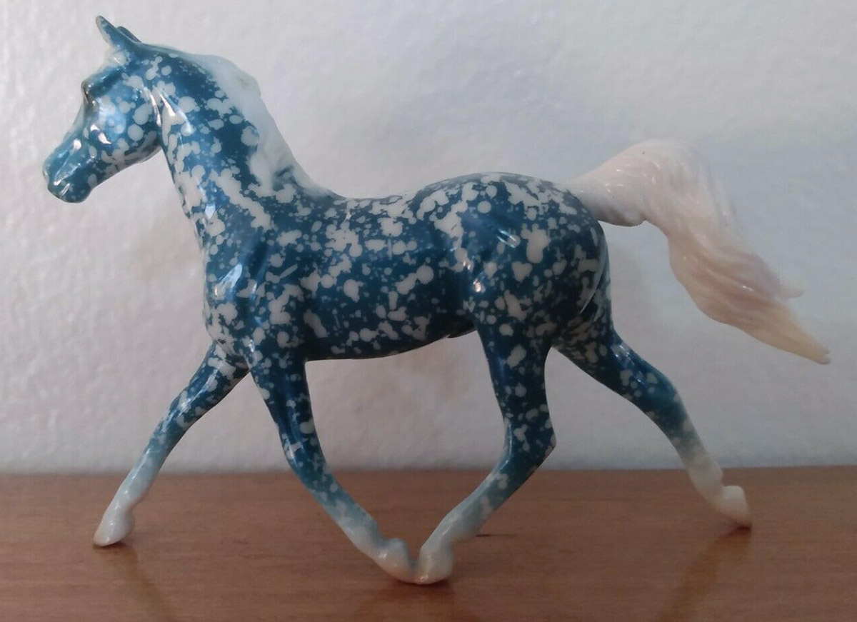 Glossy blue, resist dapples, white mane and tail, bald face, 4 socks – chase piece, same as #5518 Tractor Supply release Issue Price: $4-$5