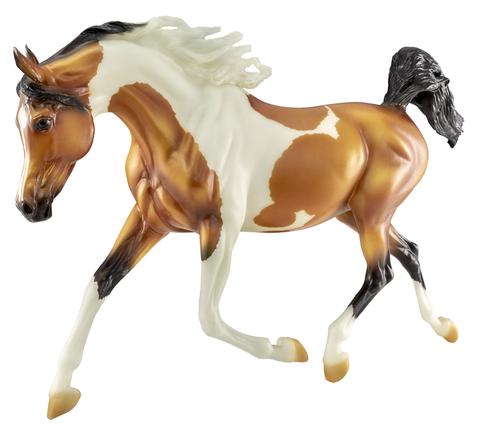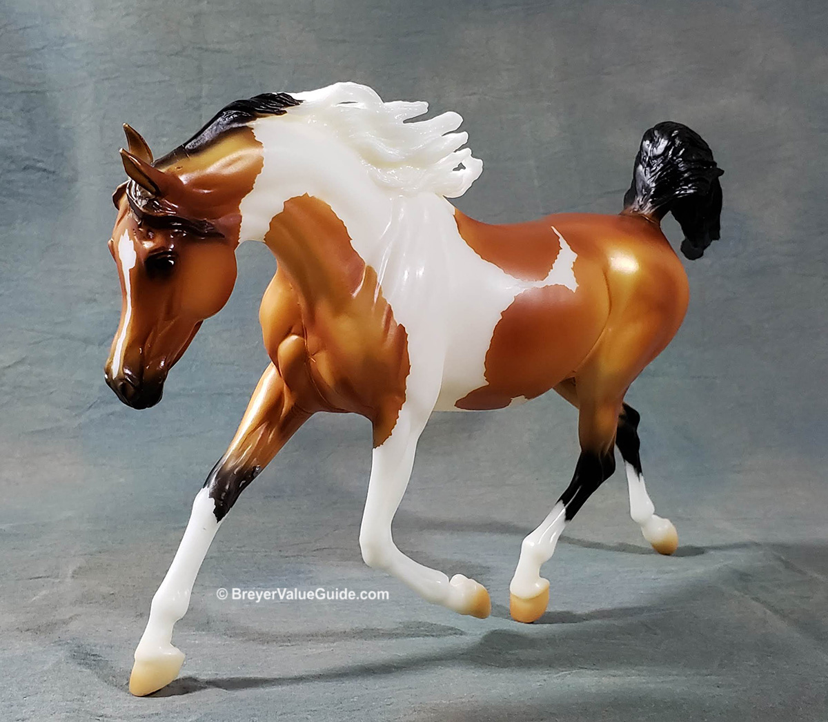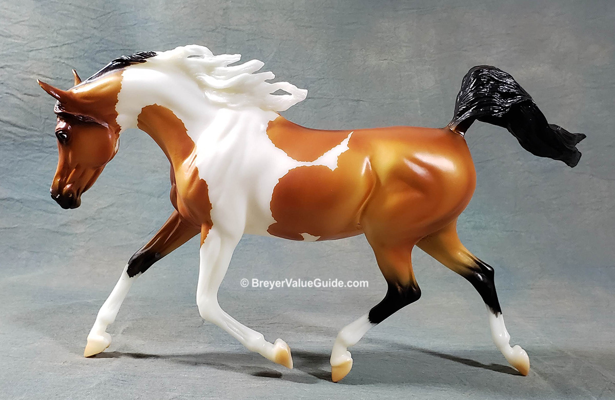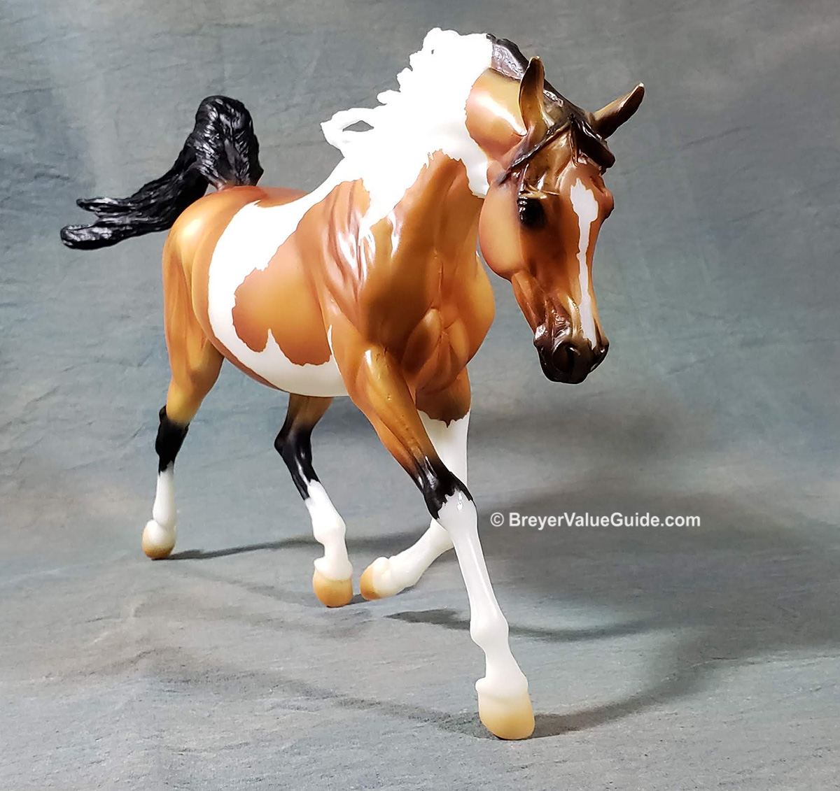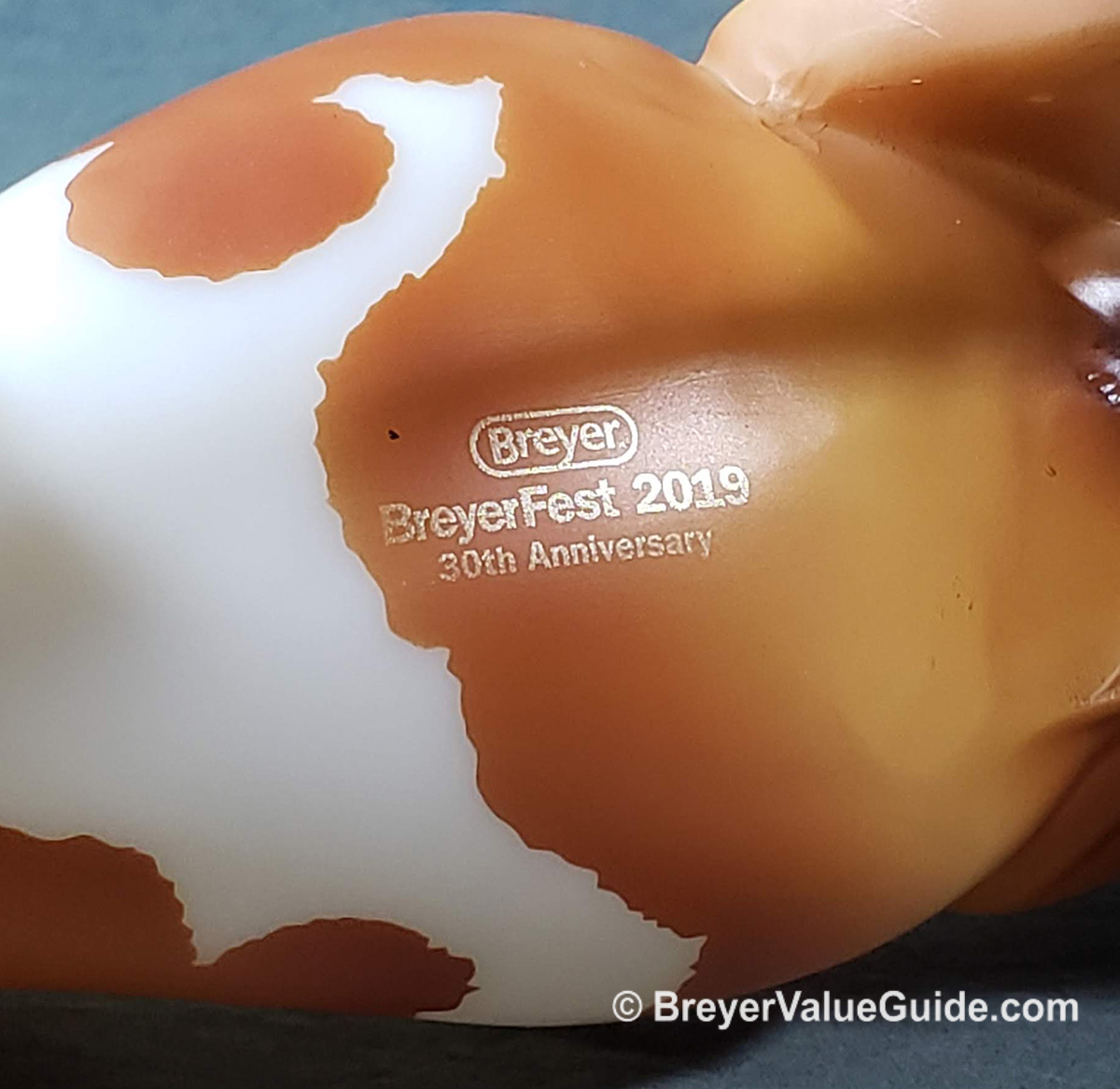 Matte bright bay pinto, blaze, 4 stockings, bi-color mane, black tail, stamped “BreyerFest 2019 30th Anniversary”, BreyerFest SR, 1/1620
