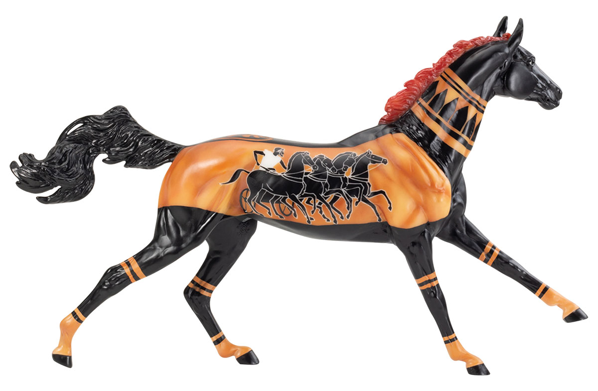 Semigloss “orangey brown with a fiery mane and black decorative details, featuring a beautifully painted quadriga and driver on his barrel,” BreyerFest SR, 1/2200