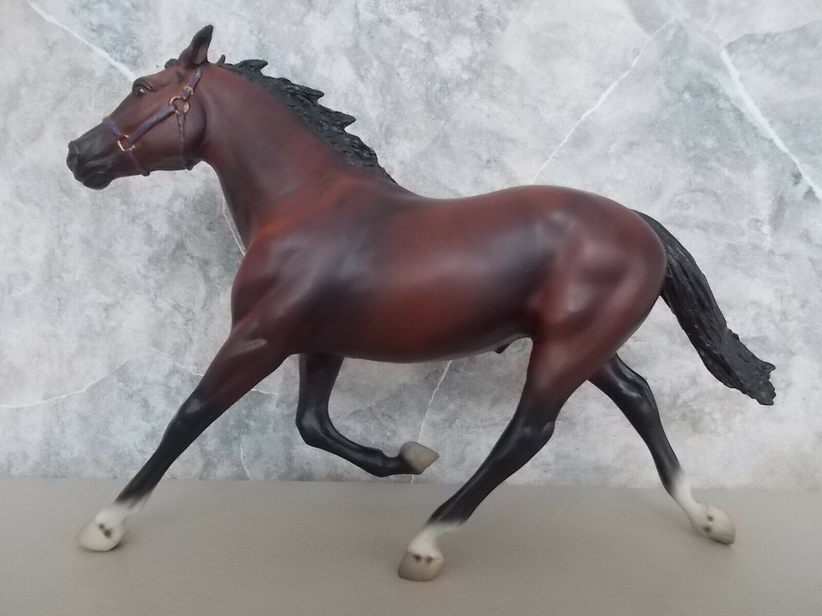 Matte or semigloss bay; star; 3 socks with ermine spots; purple halter