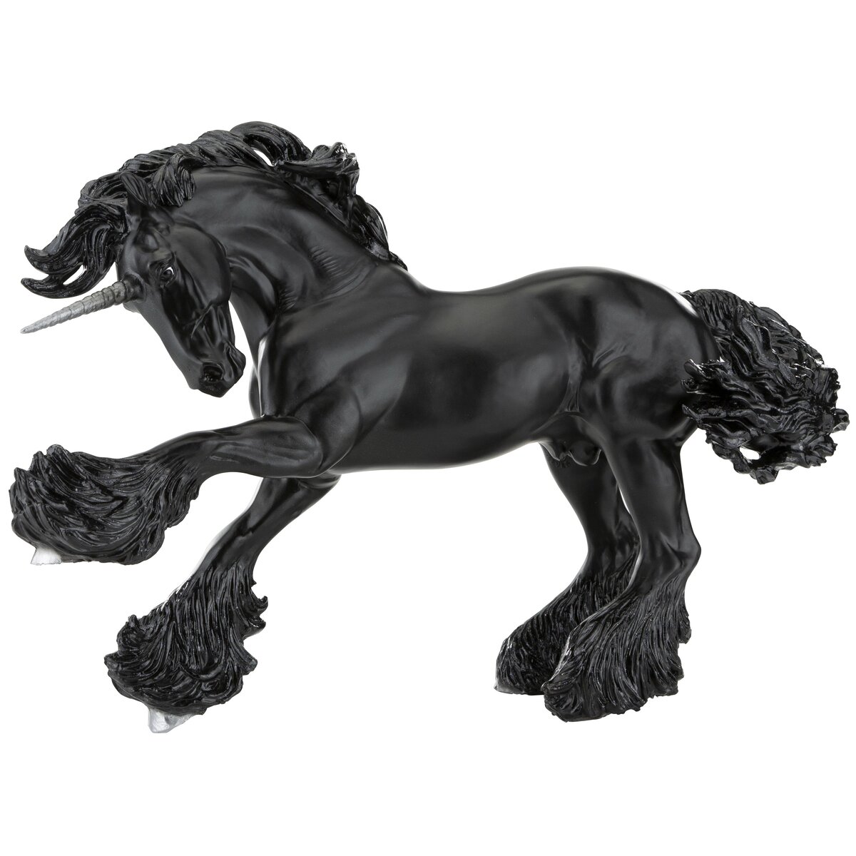 Semigloss black, glittery mane and tail, silver horn and hooves