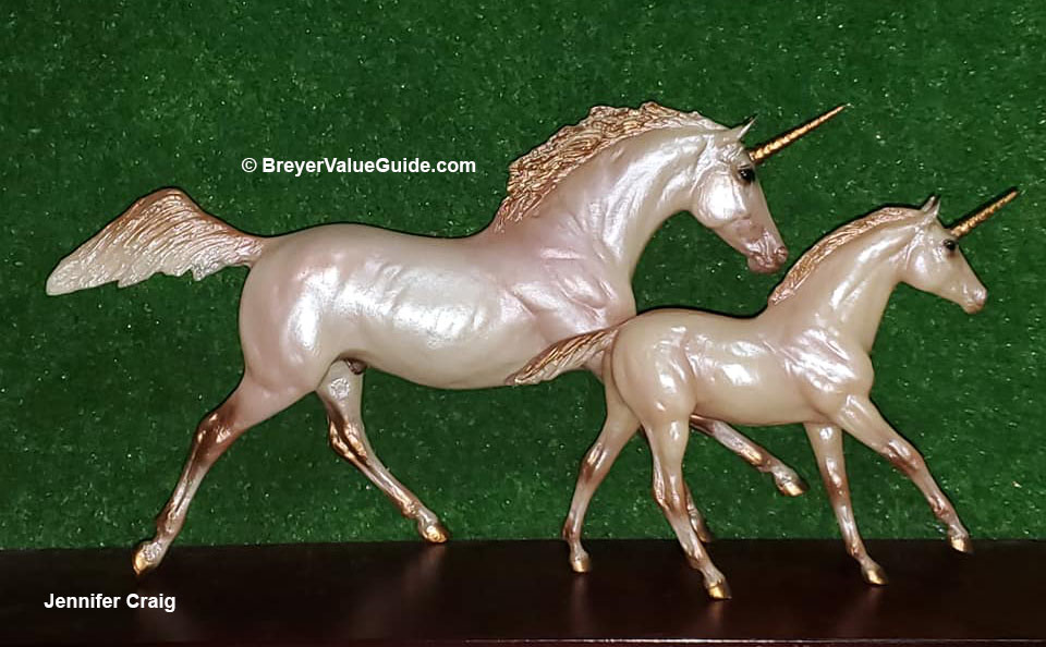 Unicorn; iridescent white; gold shaded points; gold hooves and horn; JCPenney SR – with Action Stock Horse Foal