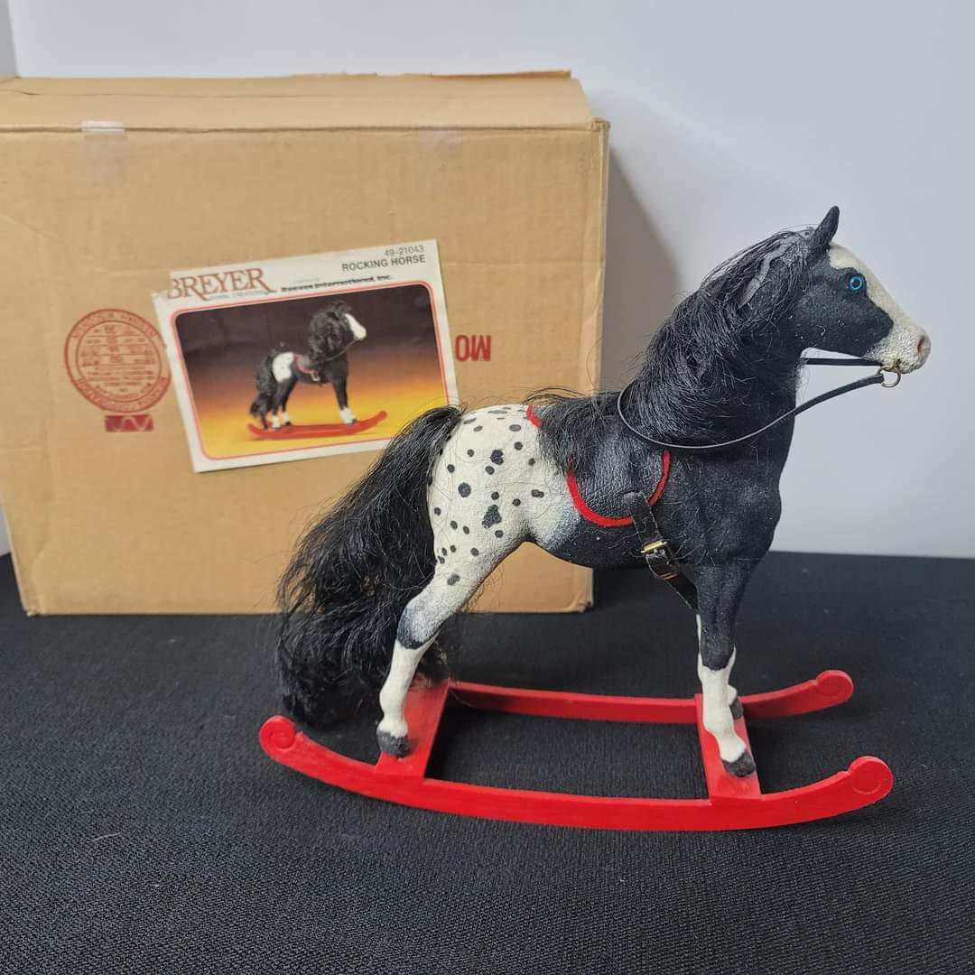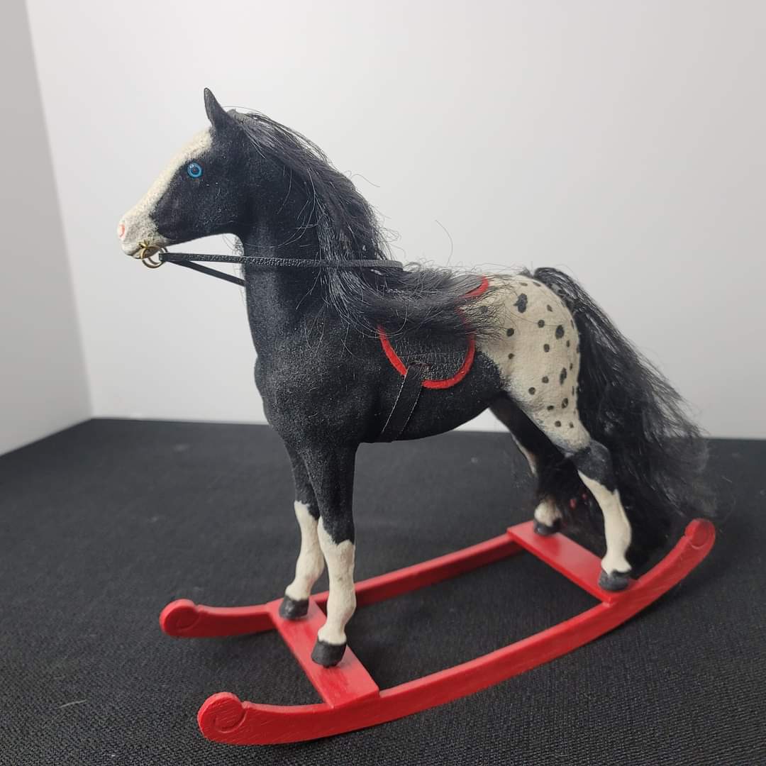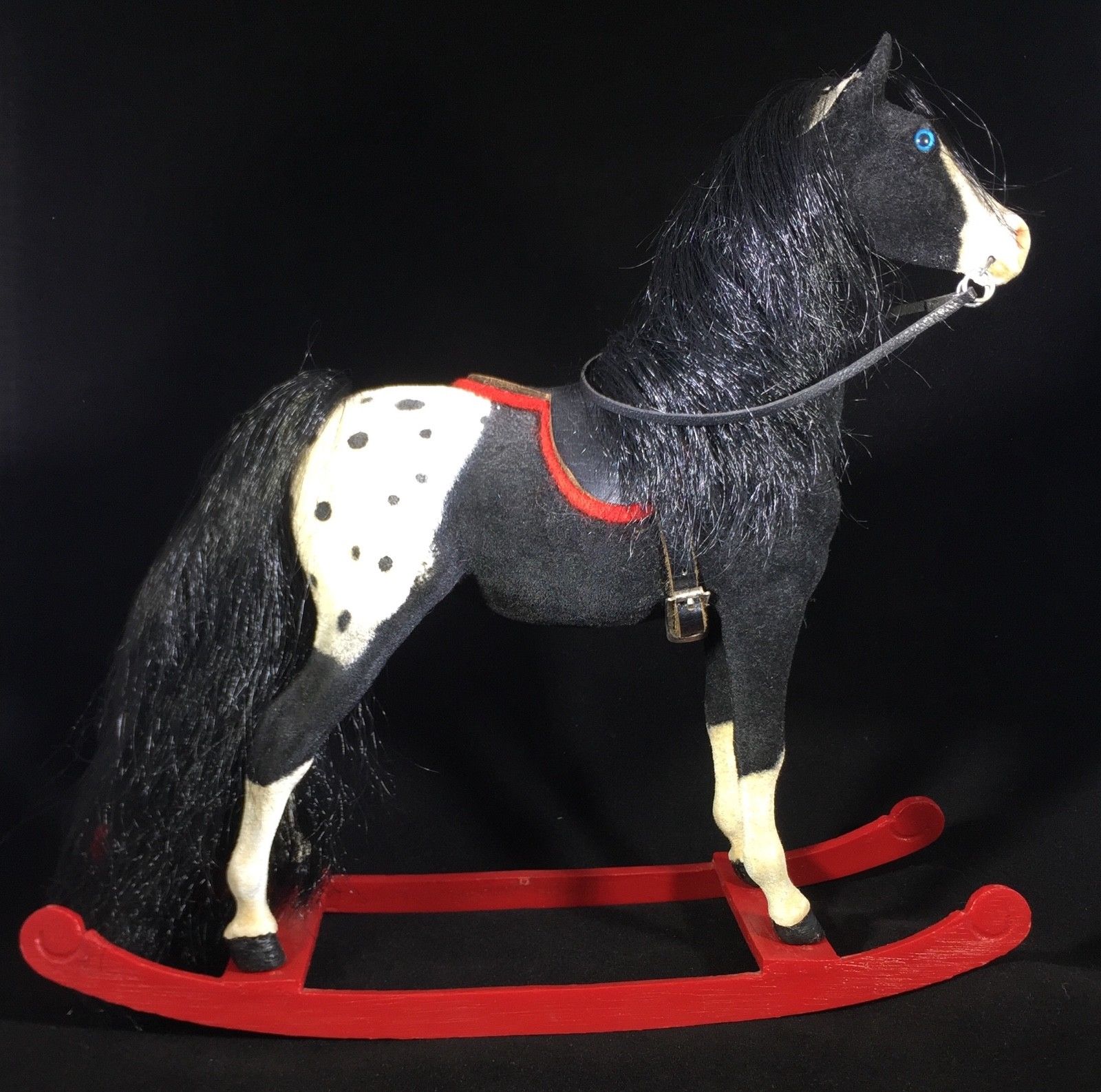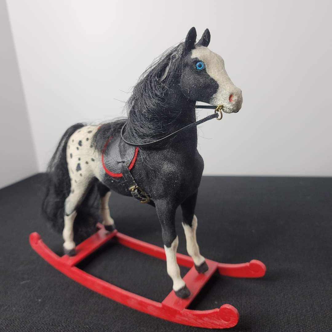 Flocked black appaloosa; apron face; glass eyes; 4 socks; Sears SR – with tack and red rockers