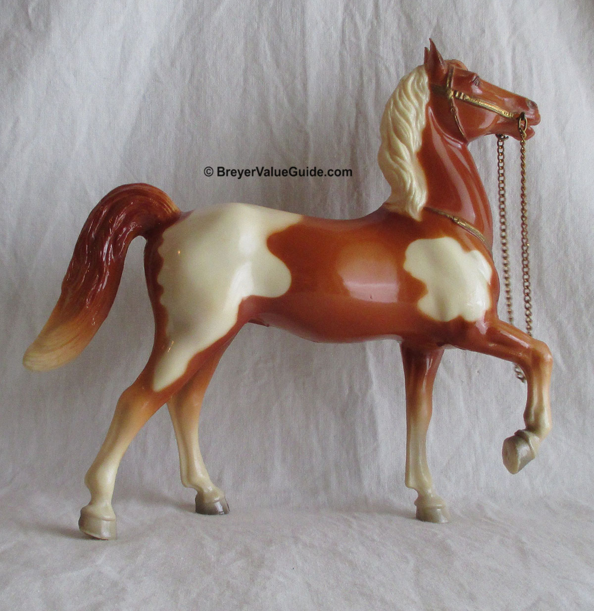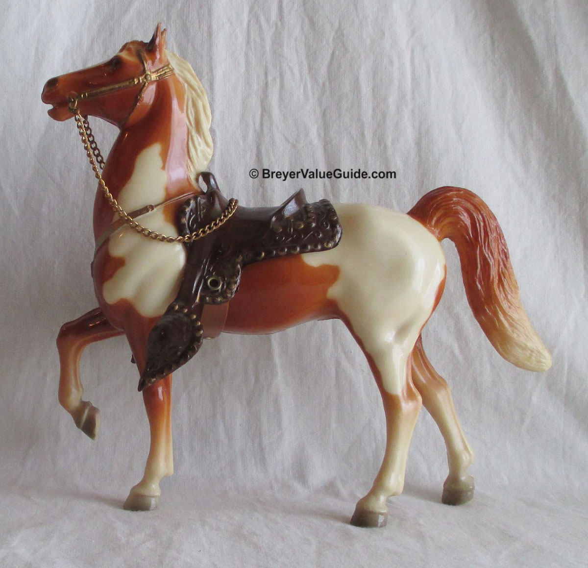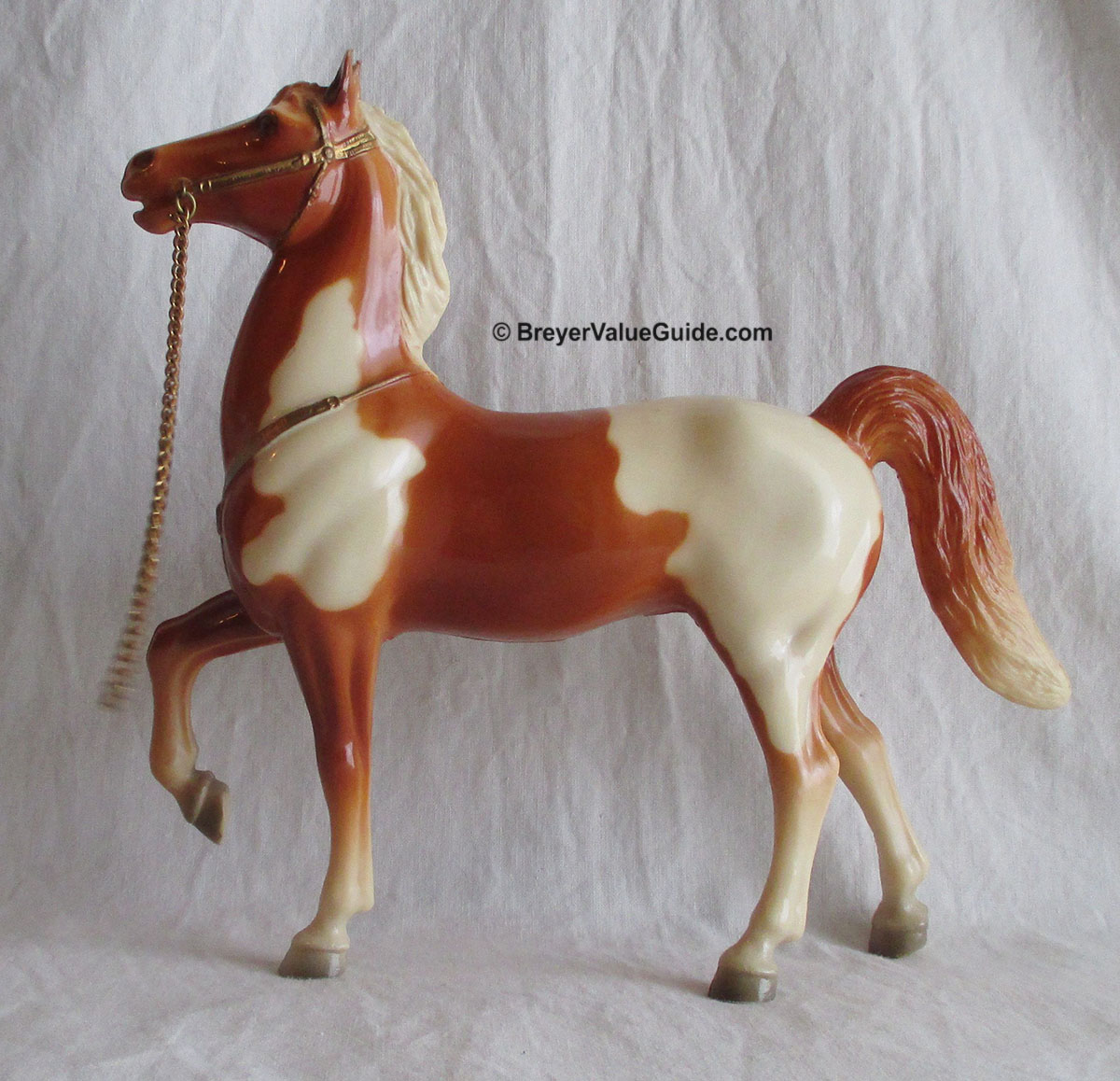 Glossy chestnut pinto; bald face; 4 socks; grey hooves; gold painted on tack; with Western or English saddle