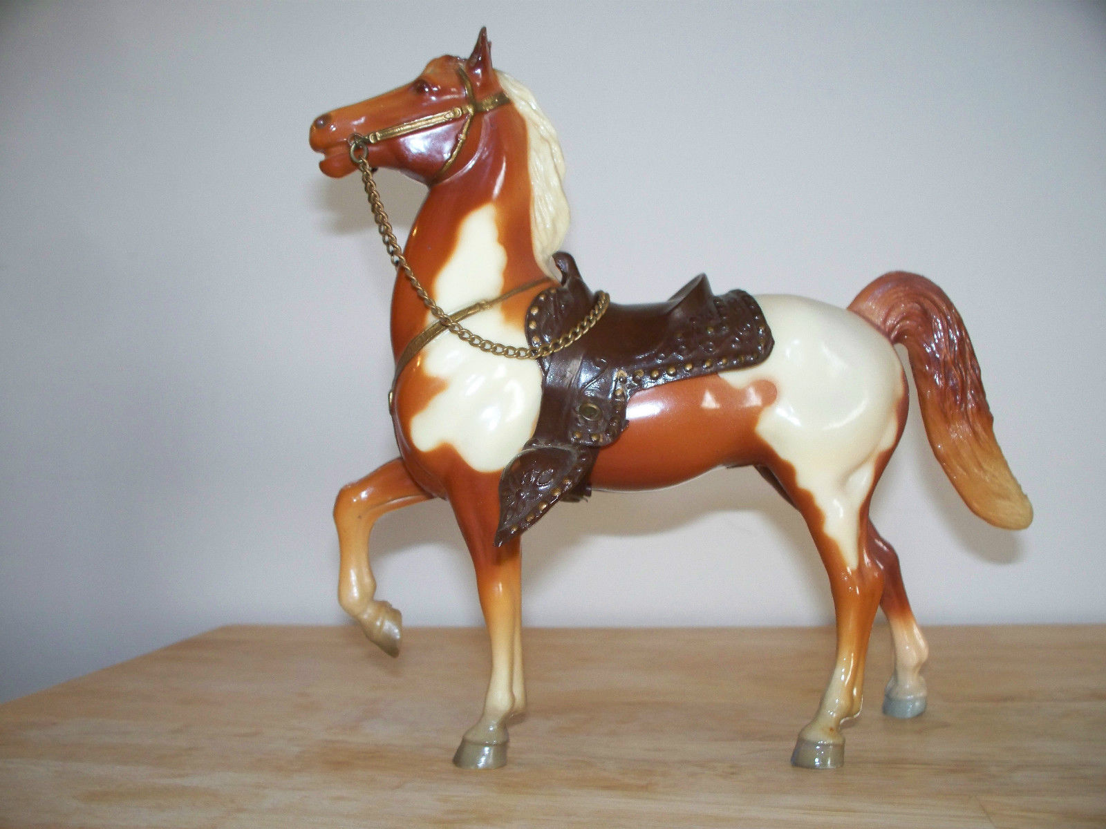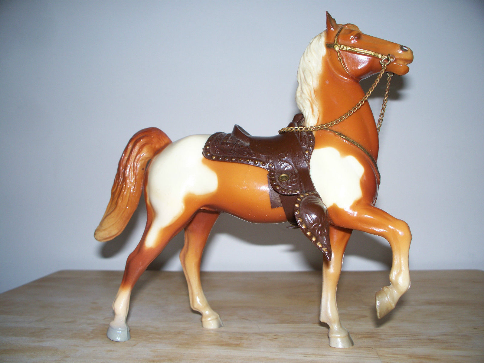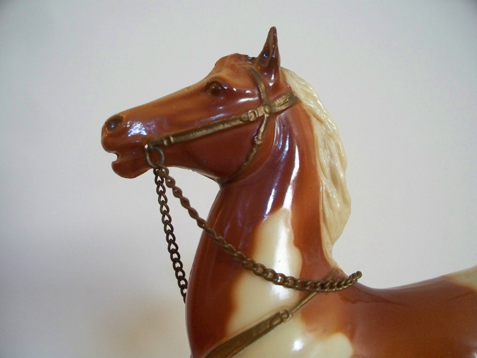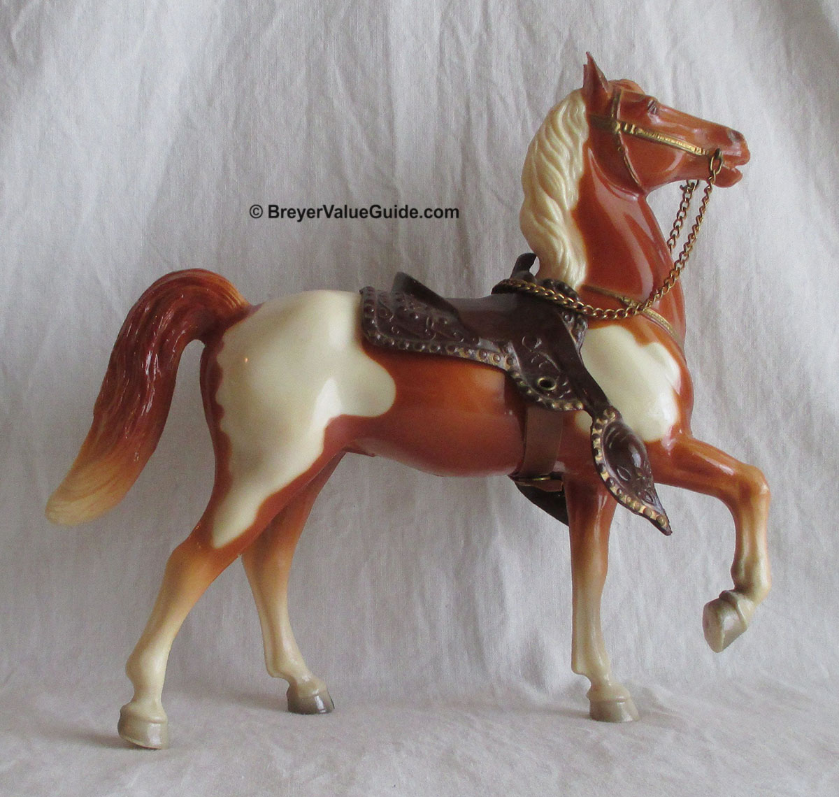 Glossy chestnut pinto; bald face; 4 socks; grey hooves; gold painted on tack; with Western or English saddle
